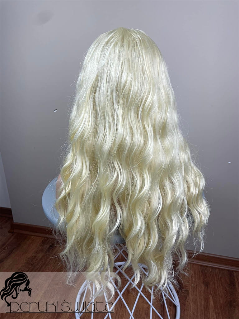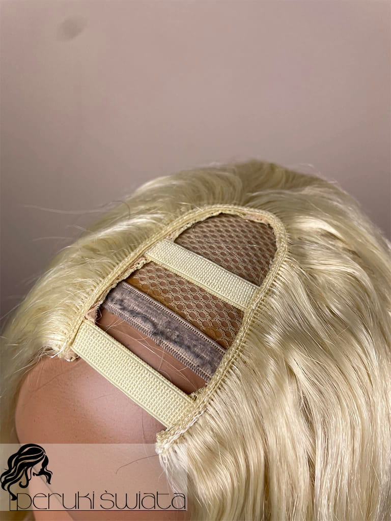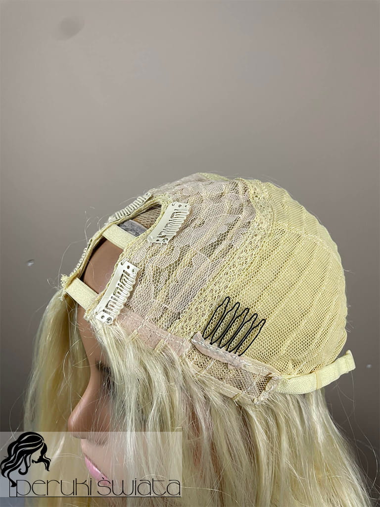 Lekka peruka syntetyczna Wiktoria, z kanekalonu termoplastycznego, mokra włoszka, chłodny perłowy blond, asymetryczny przedziałek