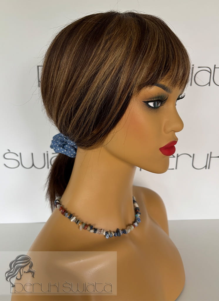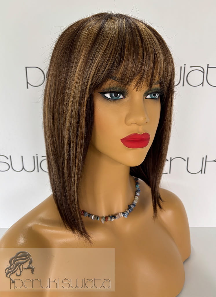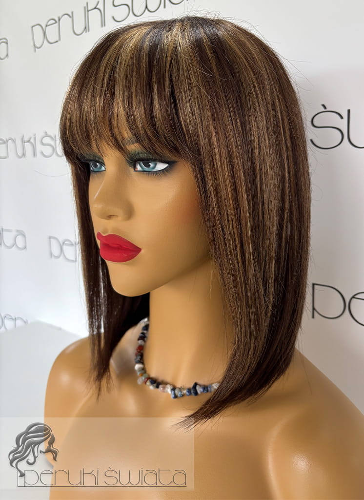 Peruka Clementine, bob z grzywką, włosy naturalne, kolor: ciemny brąz ze złotym blondem