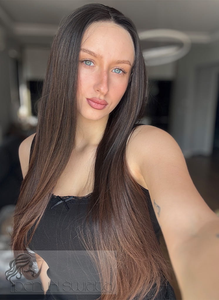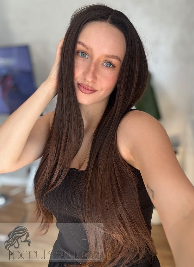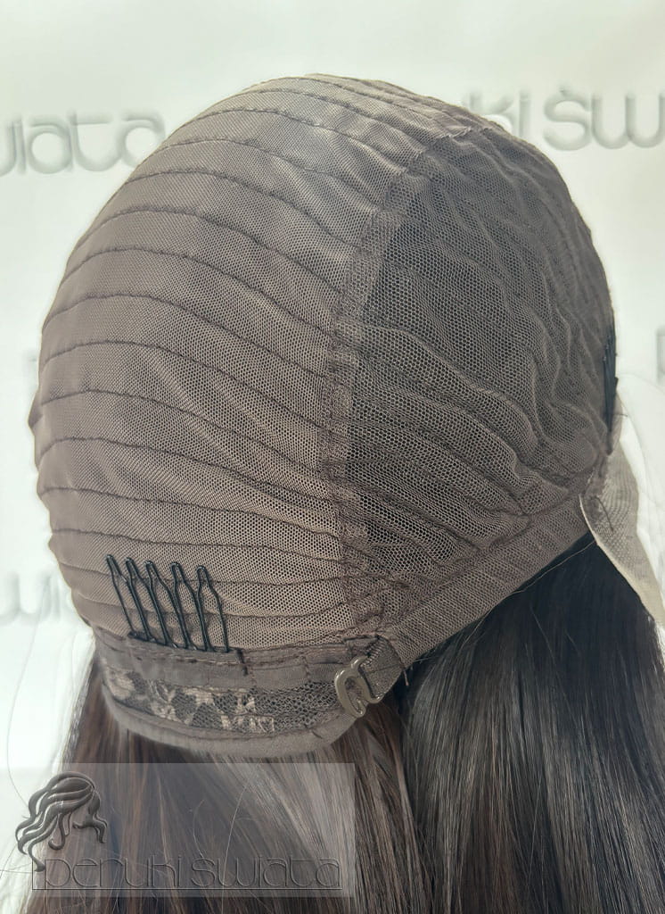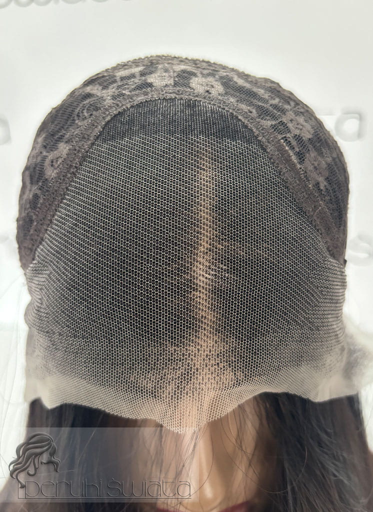 Czepek typu: full lace front (możliwość dowolnego zaczesania przedziałka w obrębie siateczki, podcięcia grzywki, efekt wyrastania włosów z głowy, rozmyta linia przednia peruki)