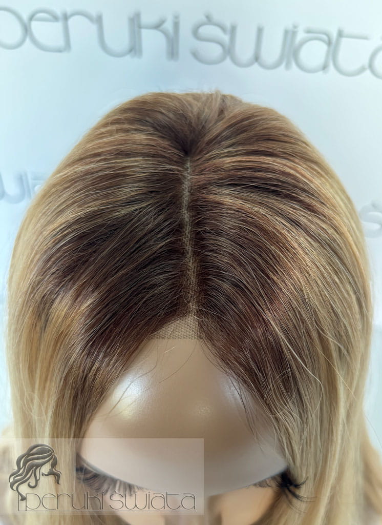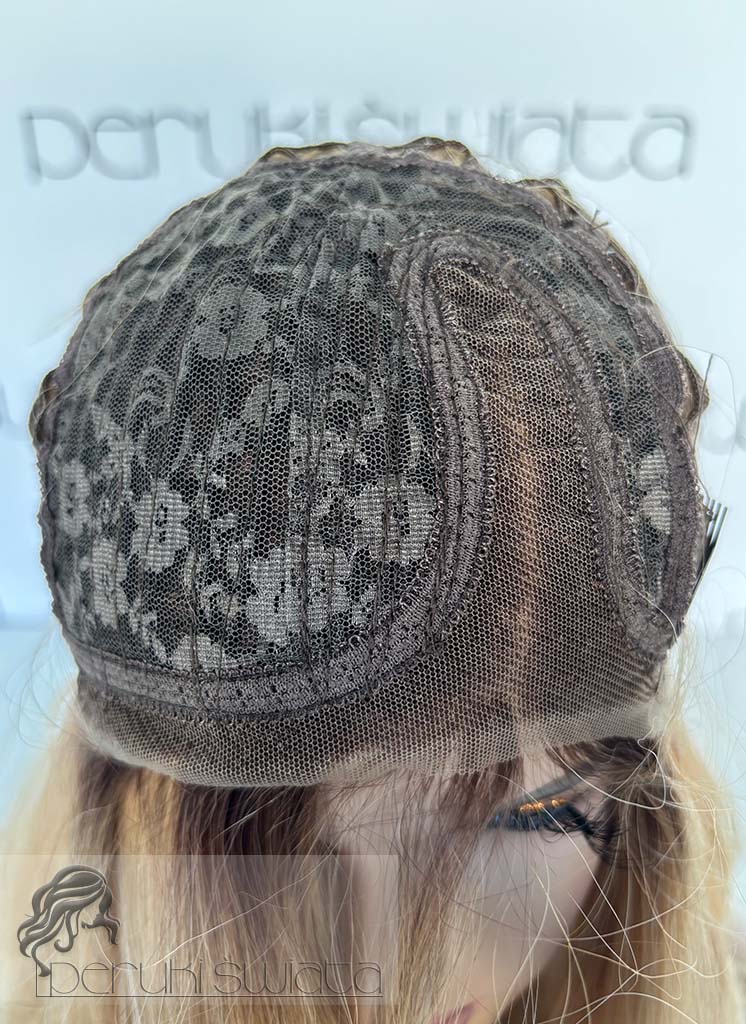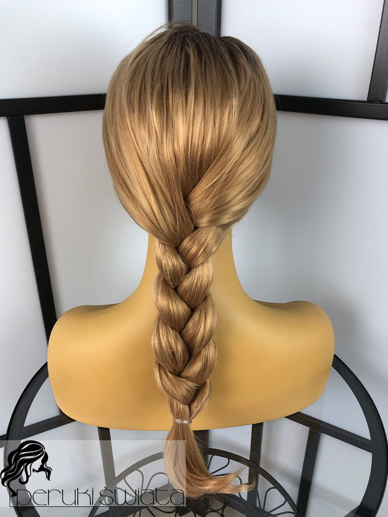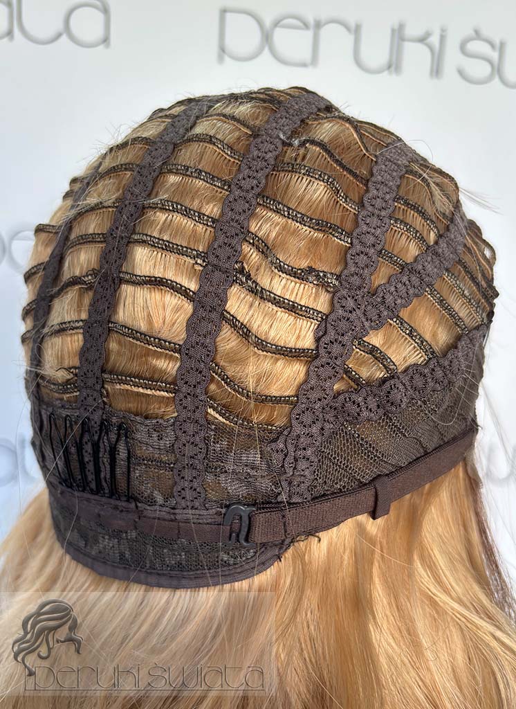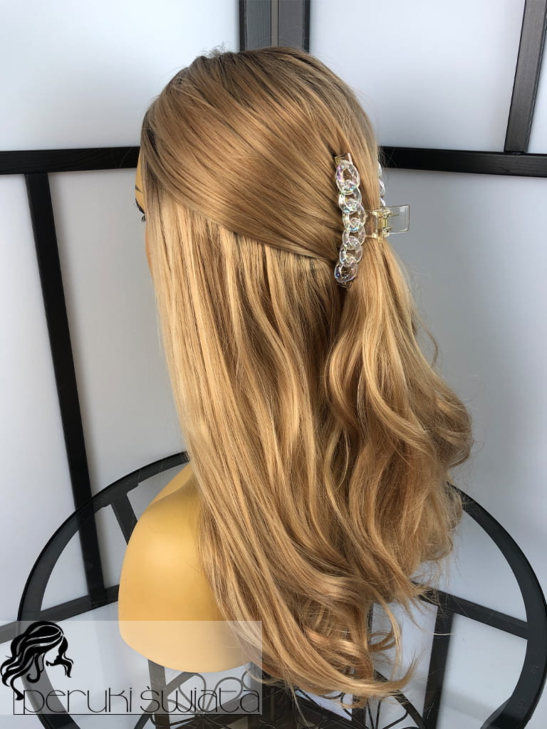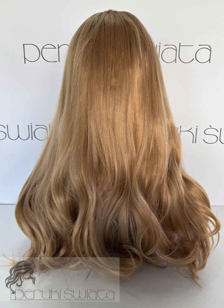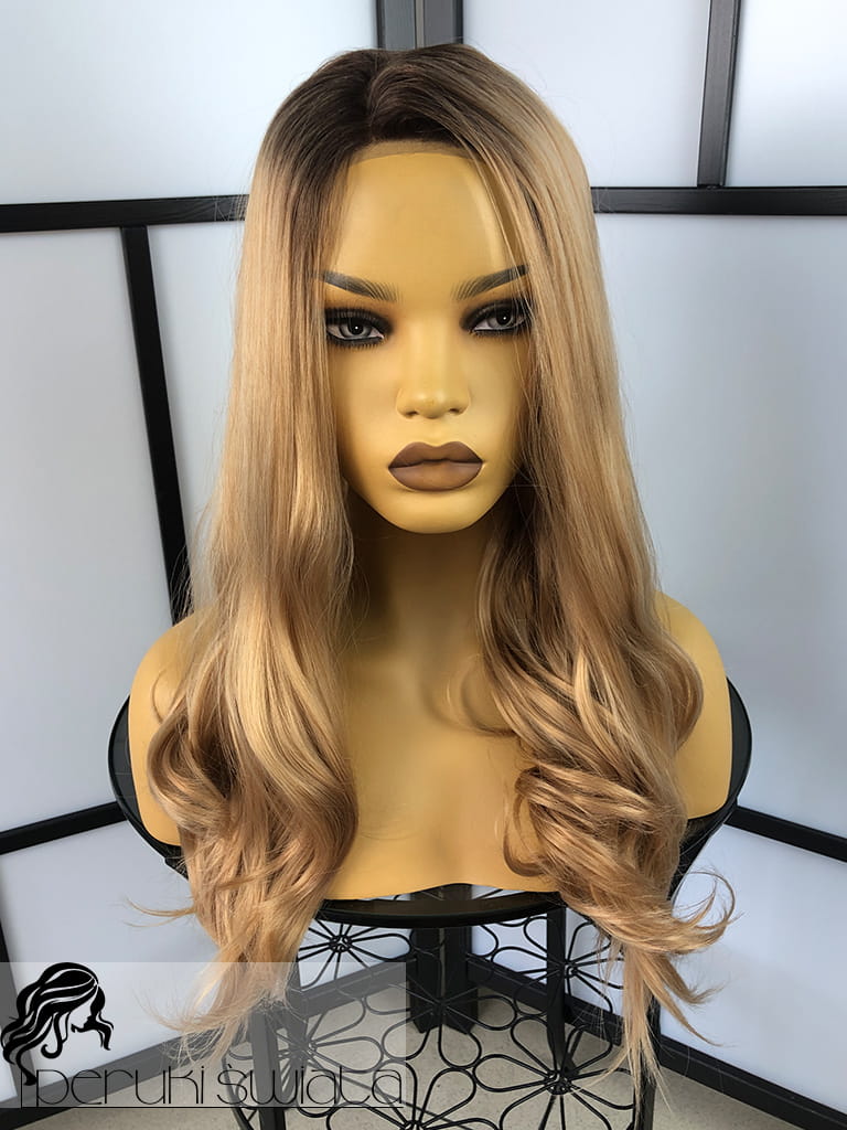 Peruka Deli , kanekalon premium 3D, lace front, fale/loki, kolor: ciepły miodowy blond na subtelnym odroście