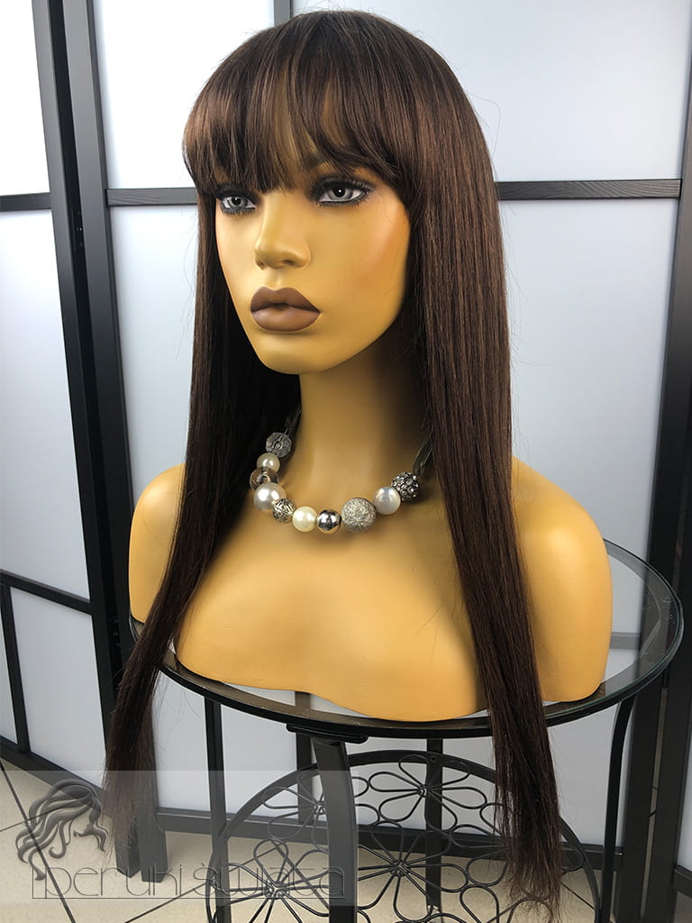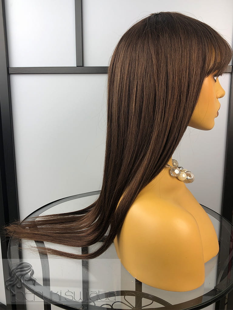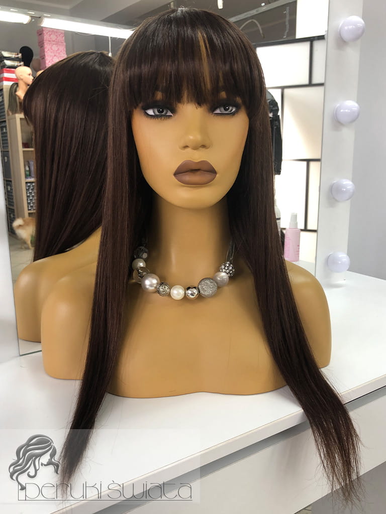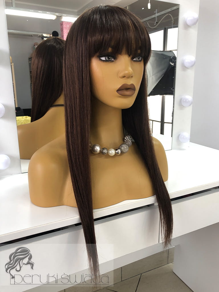 Peruka Hana, włosy naturalne, long bob z grzywką, kolor: ciemny brąz