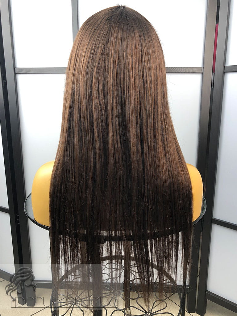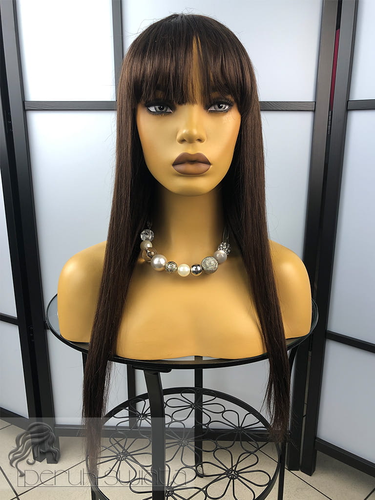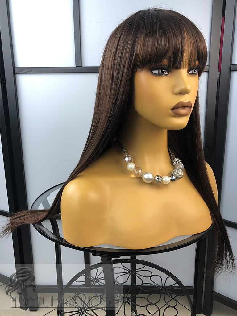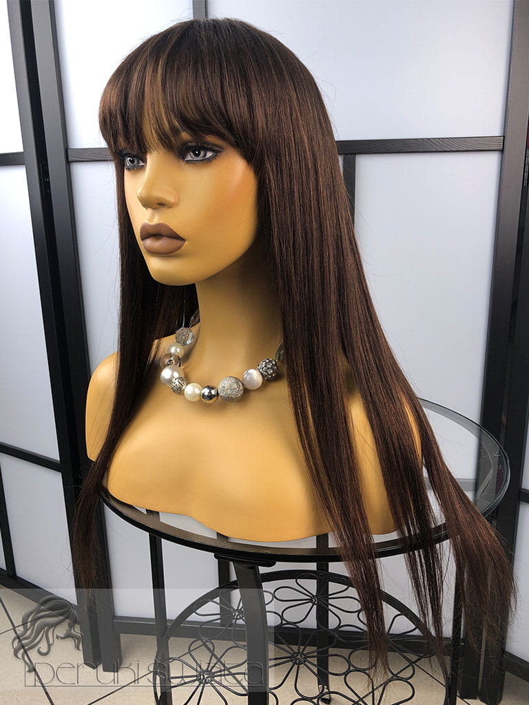 Peruka Hana, włosy naturalne, long bob z grzywką, kolor: ciemny brąz