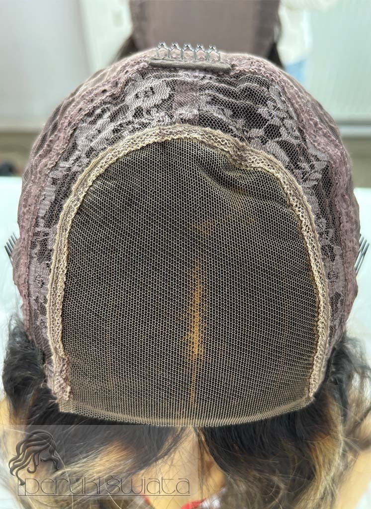 Czepek typu: part lace, siatka 10 cm na 10 cm ręcznie tkana (po podcięciu i podklejeniu siateczki efekt wyrastania włosów z głowy)