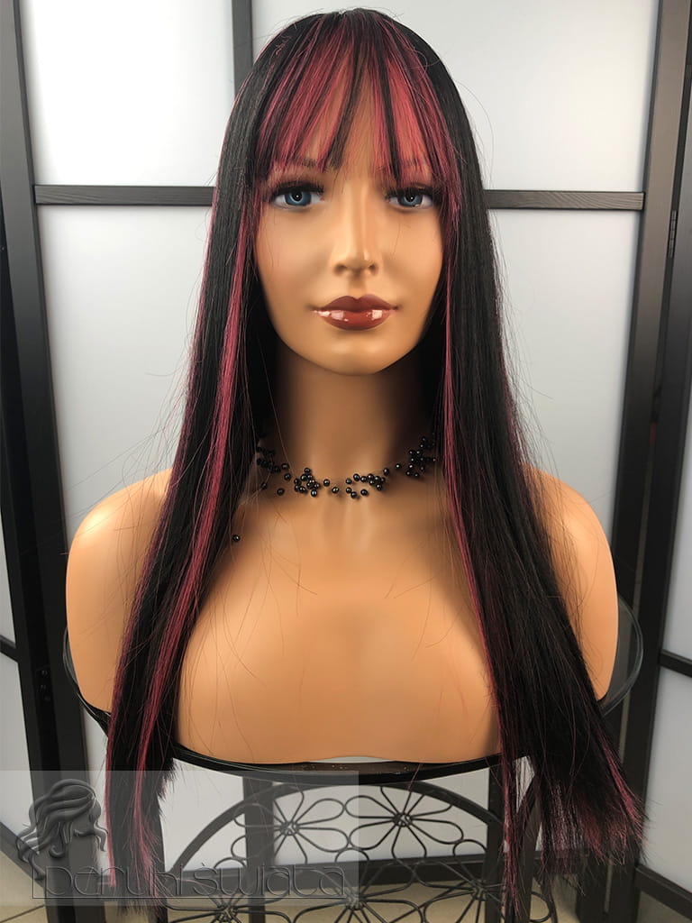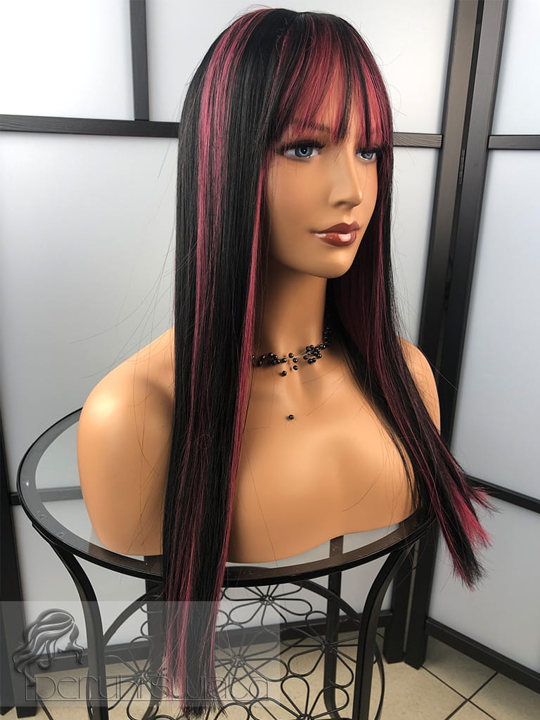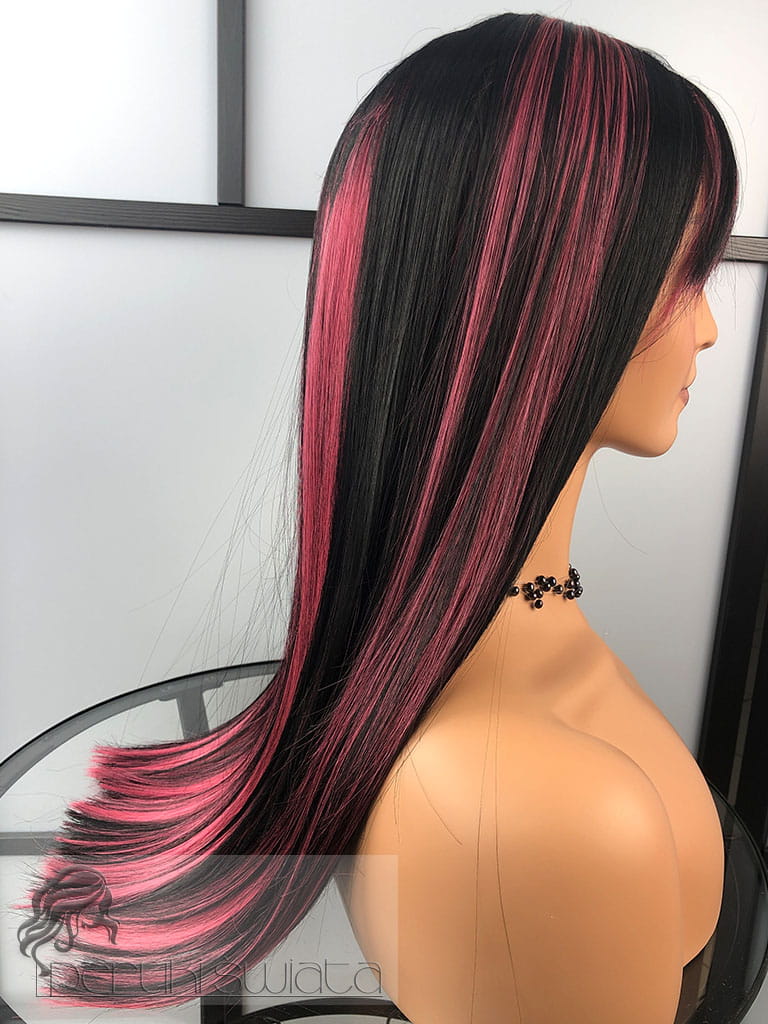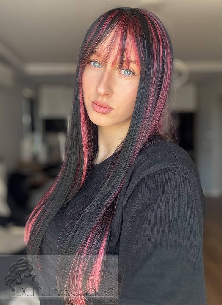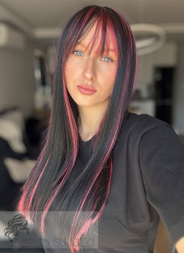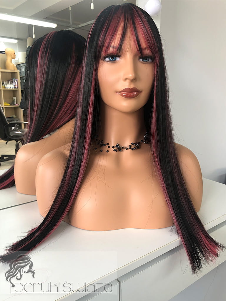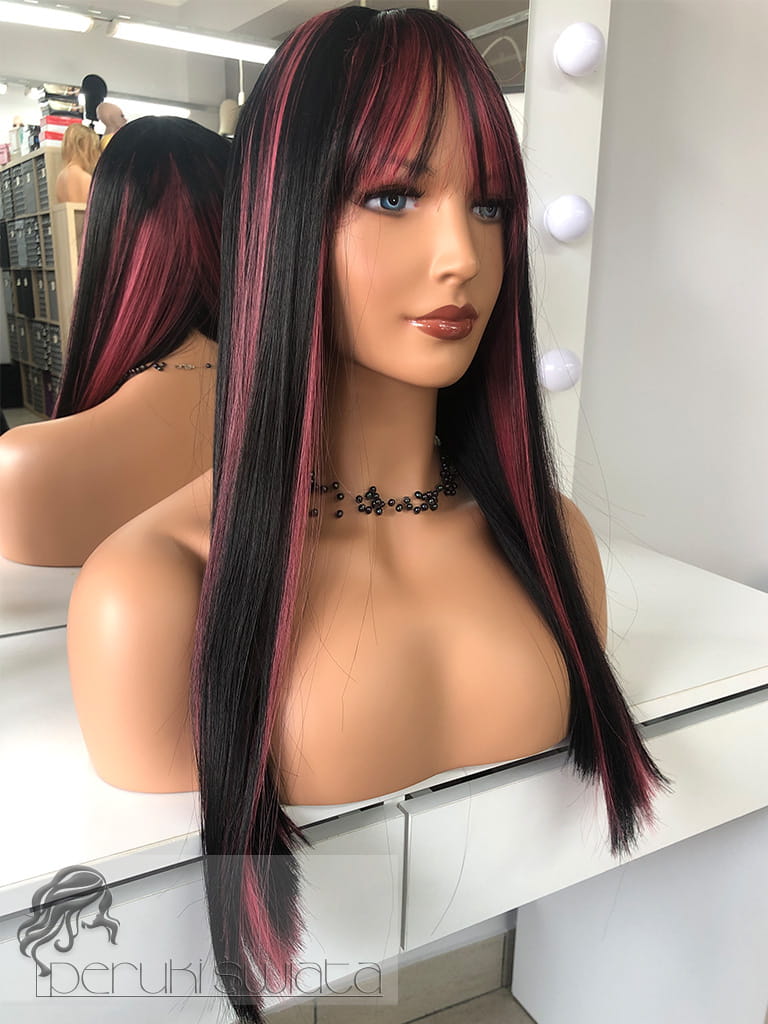 Peruka model Laurel, kanekalon typu "true hair", long bob z grzywką, kolor: czerń z pasemkami w kolorze zgaszonego różu