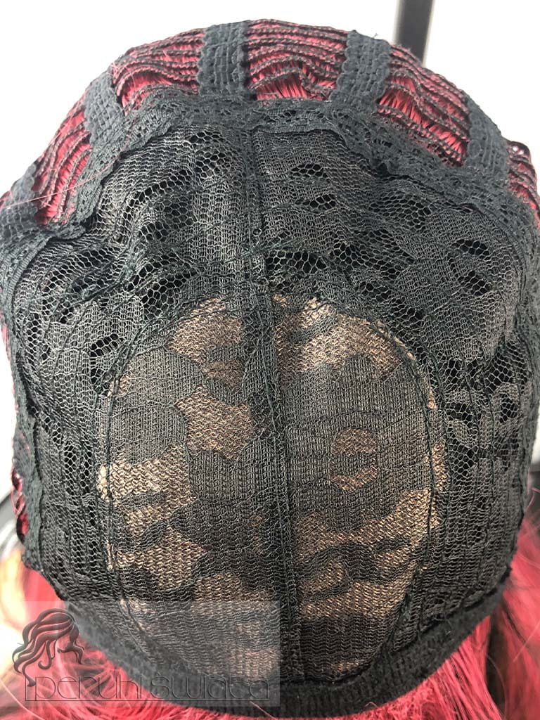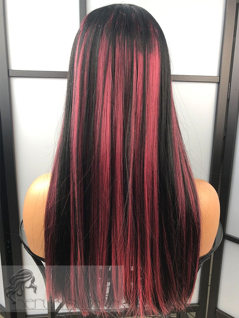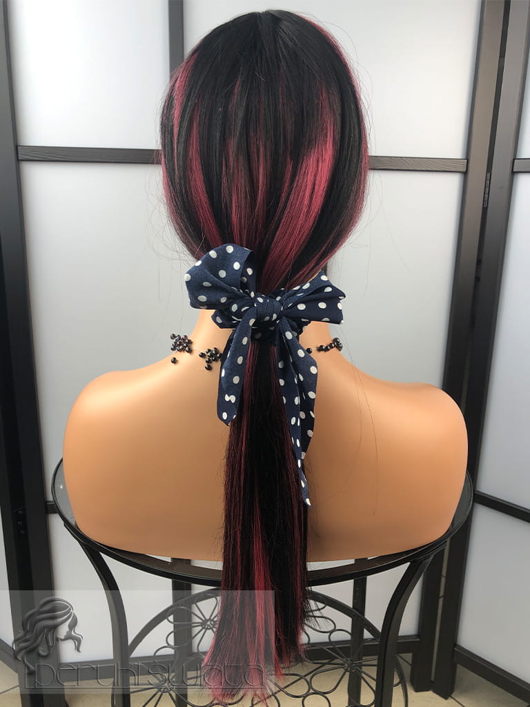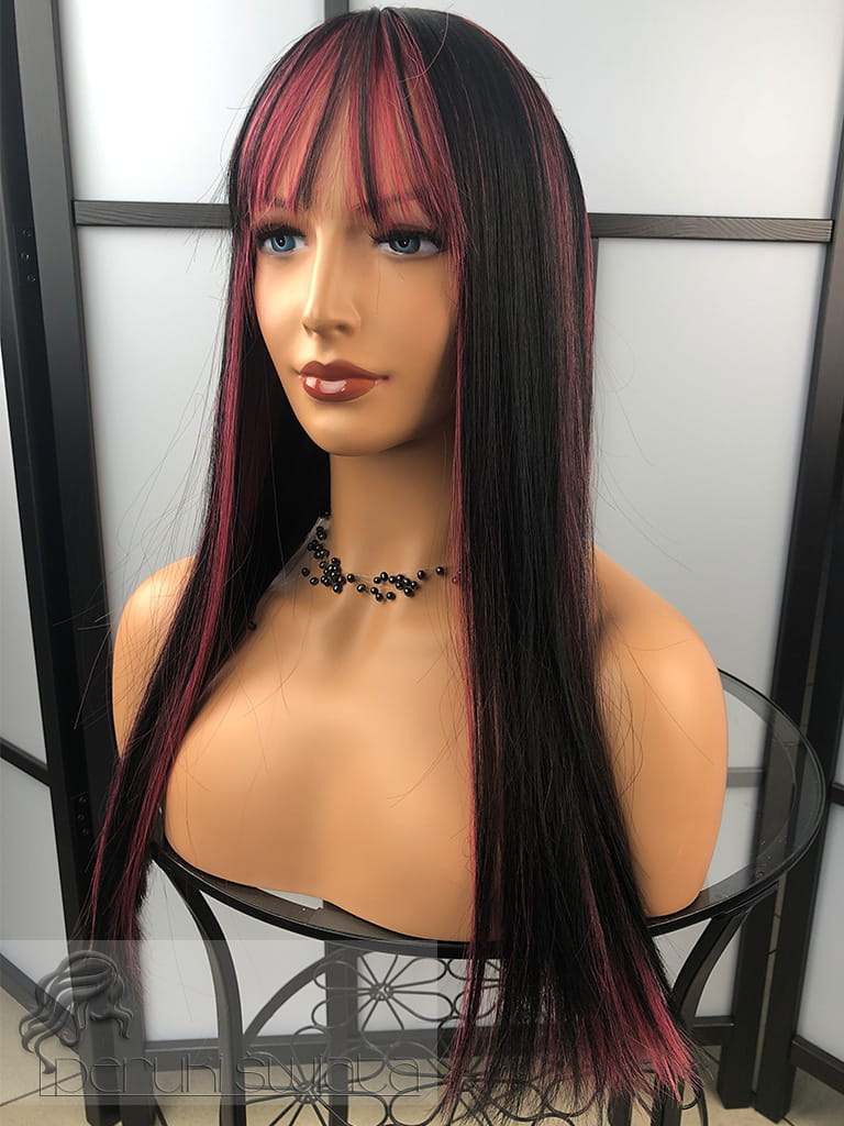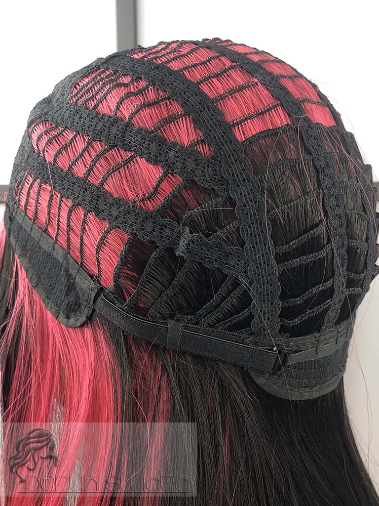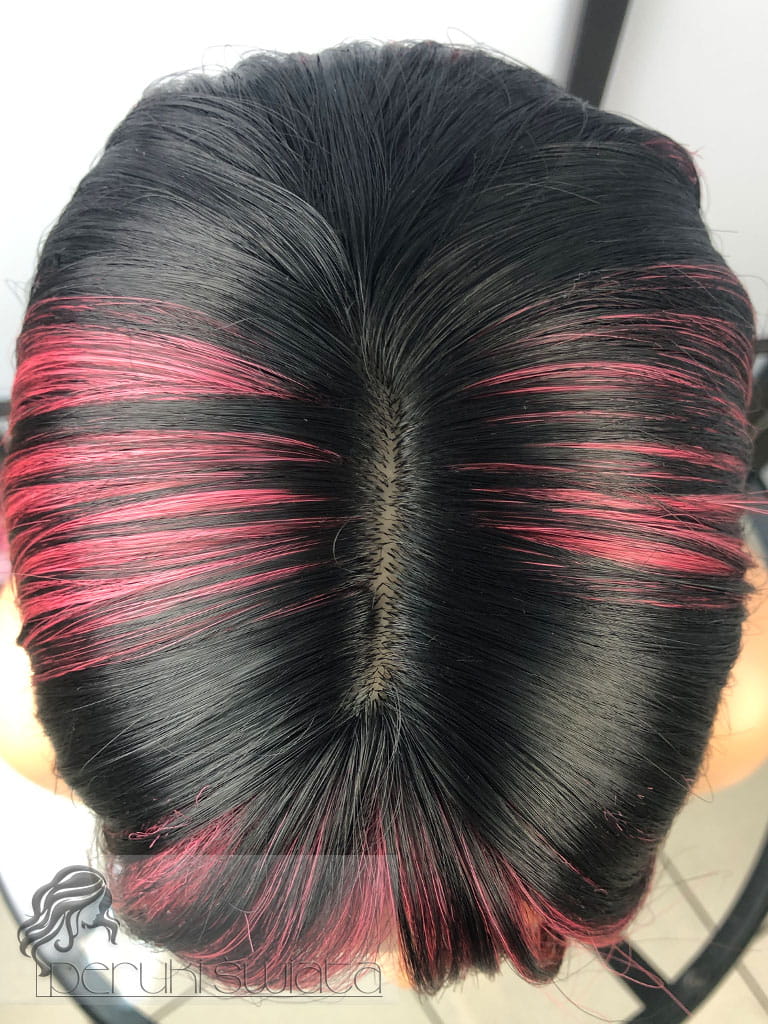 Peruka model Laurel, kanekalon typu "true hair", long bob z grzywką, kolor: czerń z pasemkami w kolorze zgaszonego różu