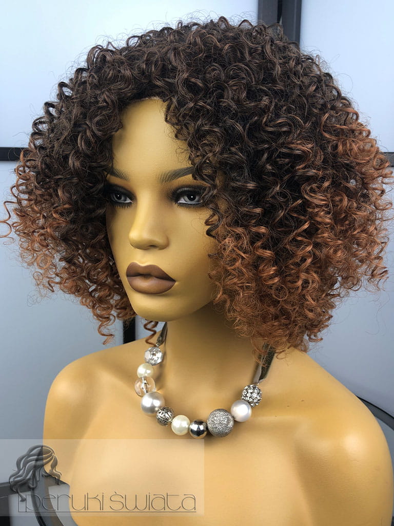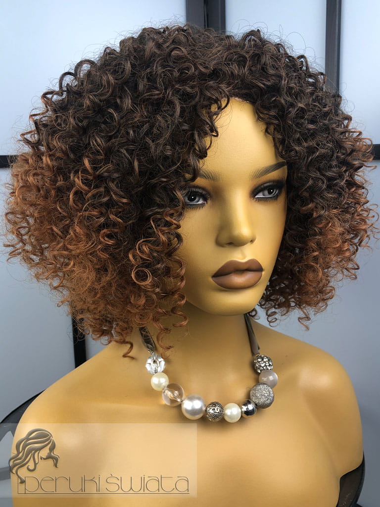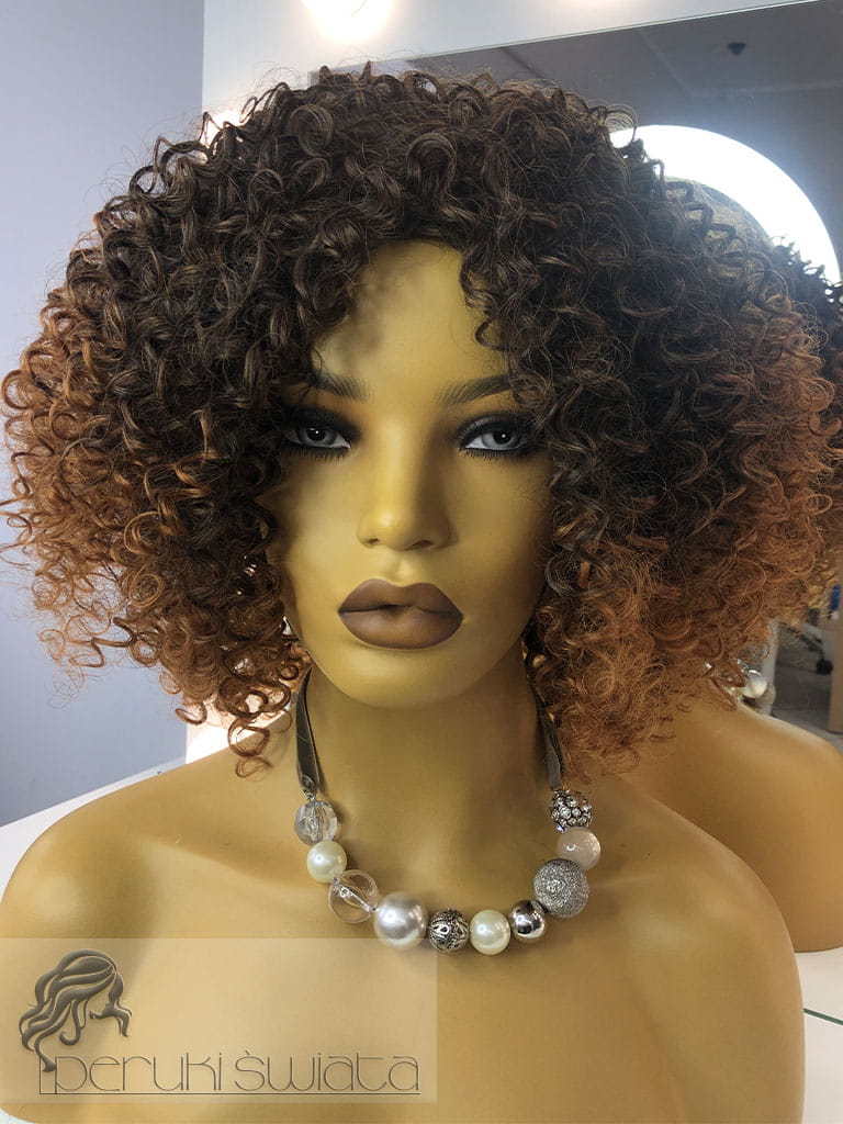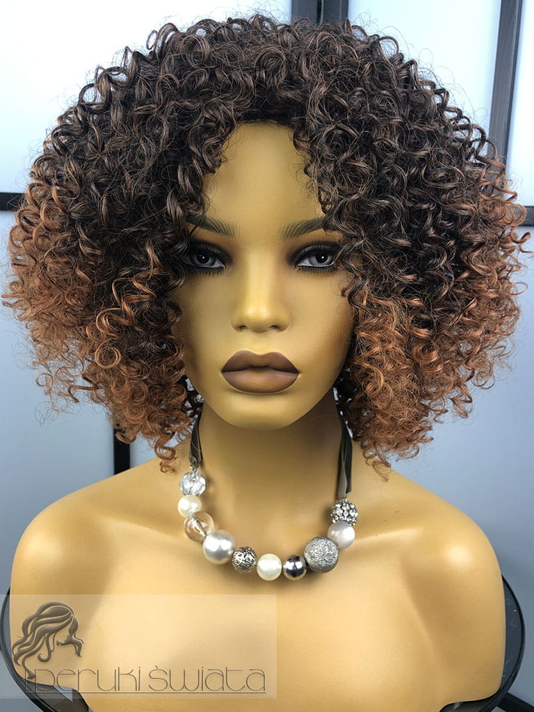 Peruka syntetyczna, model Adela, kanekalon, afroloki, sombre: jasny brąz ze złocistym blondem