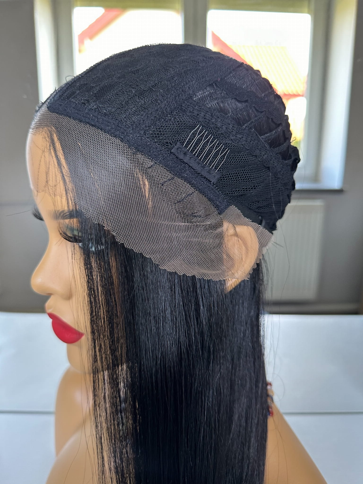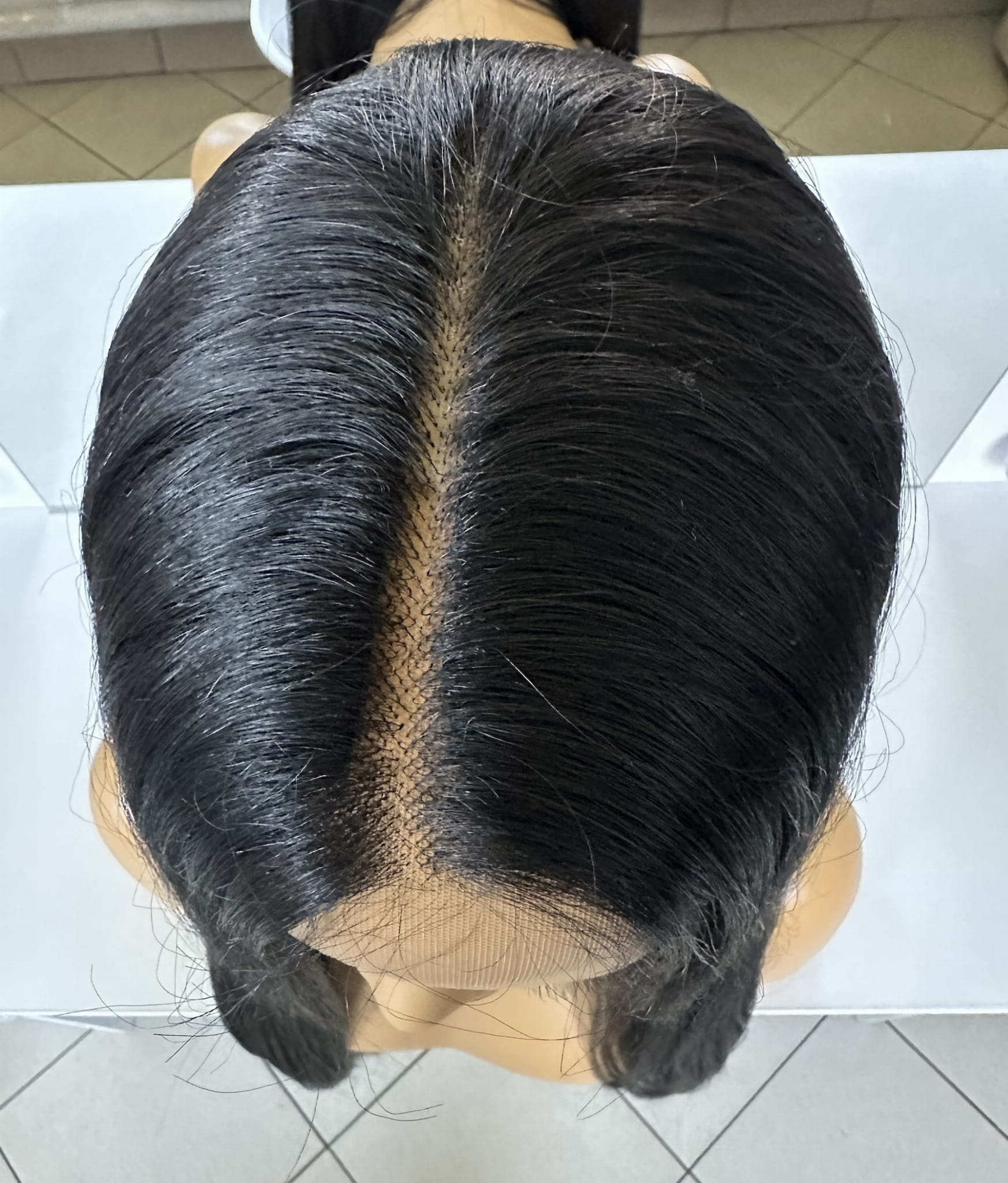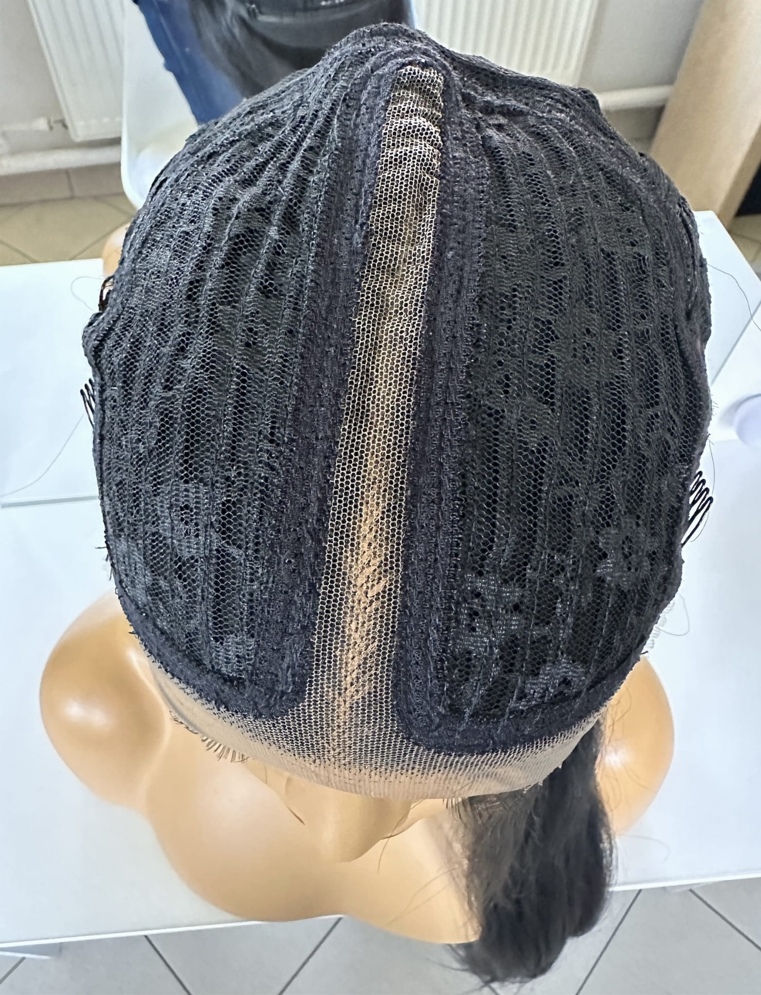 Płaski, przylegający, częściowo ręcznie tkany czepek typu lace front (efekt wyrastania włosów z głowy, rozmyty, przylegający do głowy przód peruki), przedziałek z mikroskóry na środku czepka, wykonane baby hair