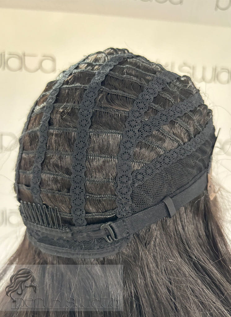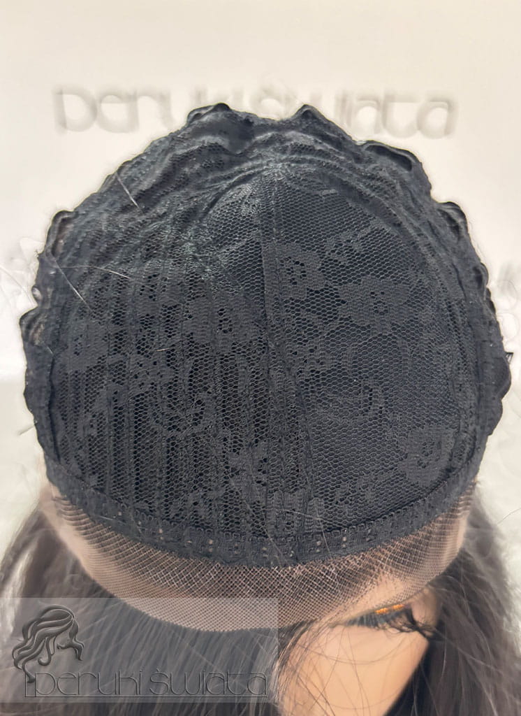Typ czepka: lace front (z przodu peruki efekt wyrastania włosów), z ręcznie nawlekanym skalpem, wykonane baby hair,przedziałek po stronie prawej (możliwość przeczesania przedziałka w obrębie skalpu)