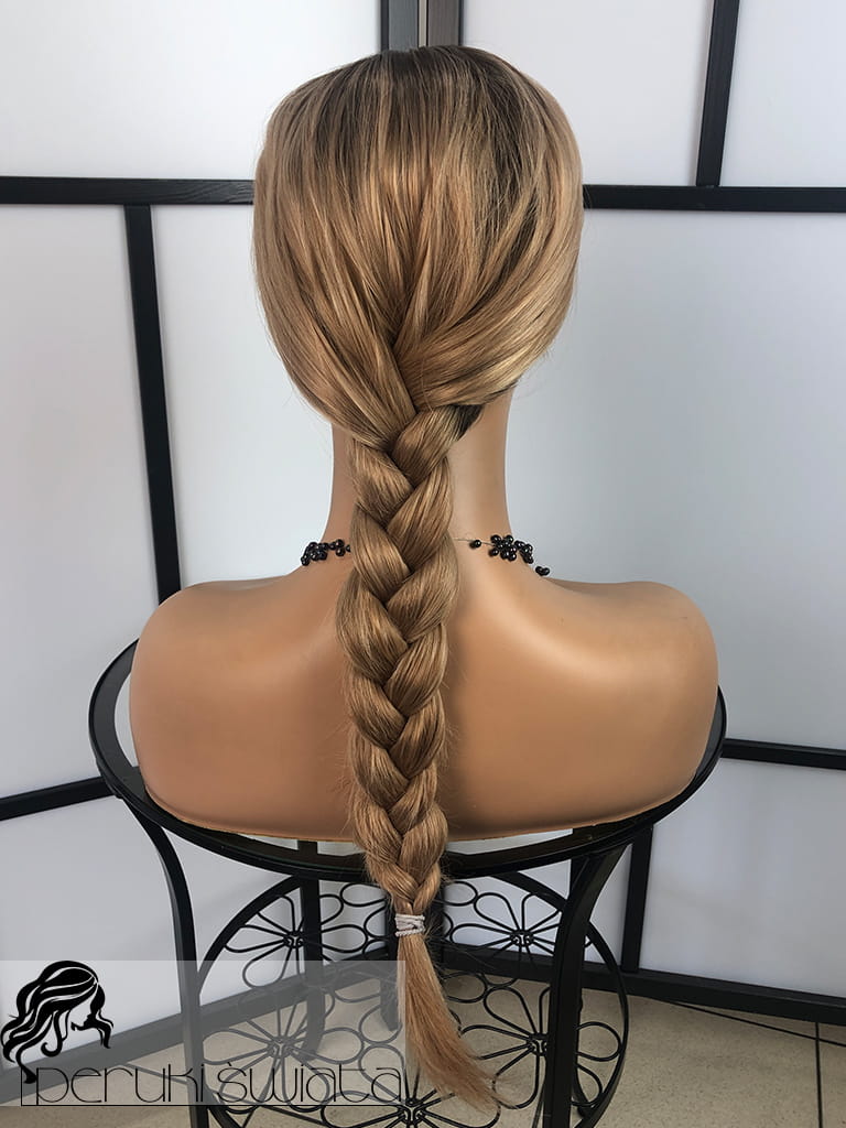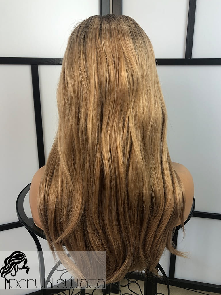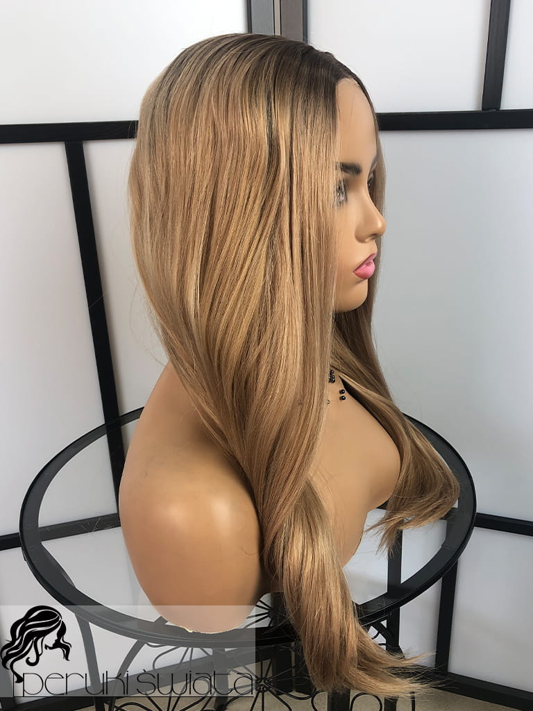 Peruka syntetyczna, model Laney, kanekalon termoplastyczny, long bob, kolor: ciepły karmelowy blond na odroście