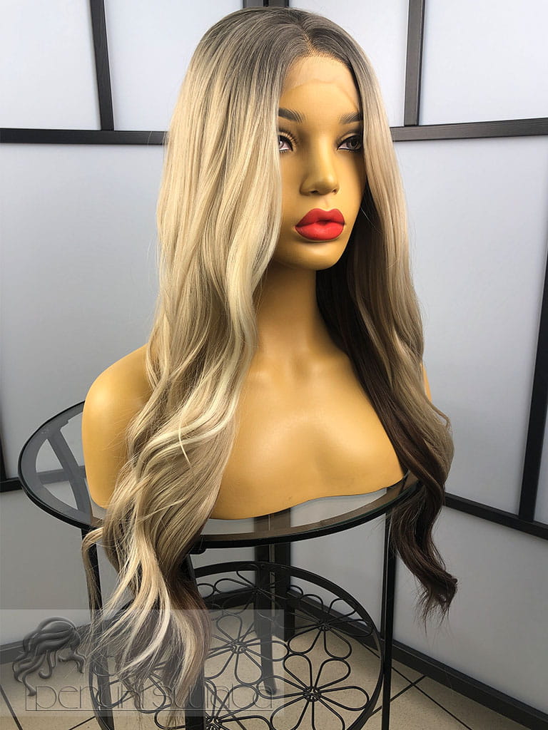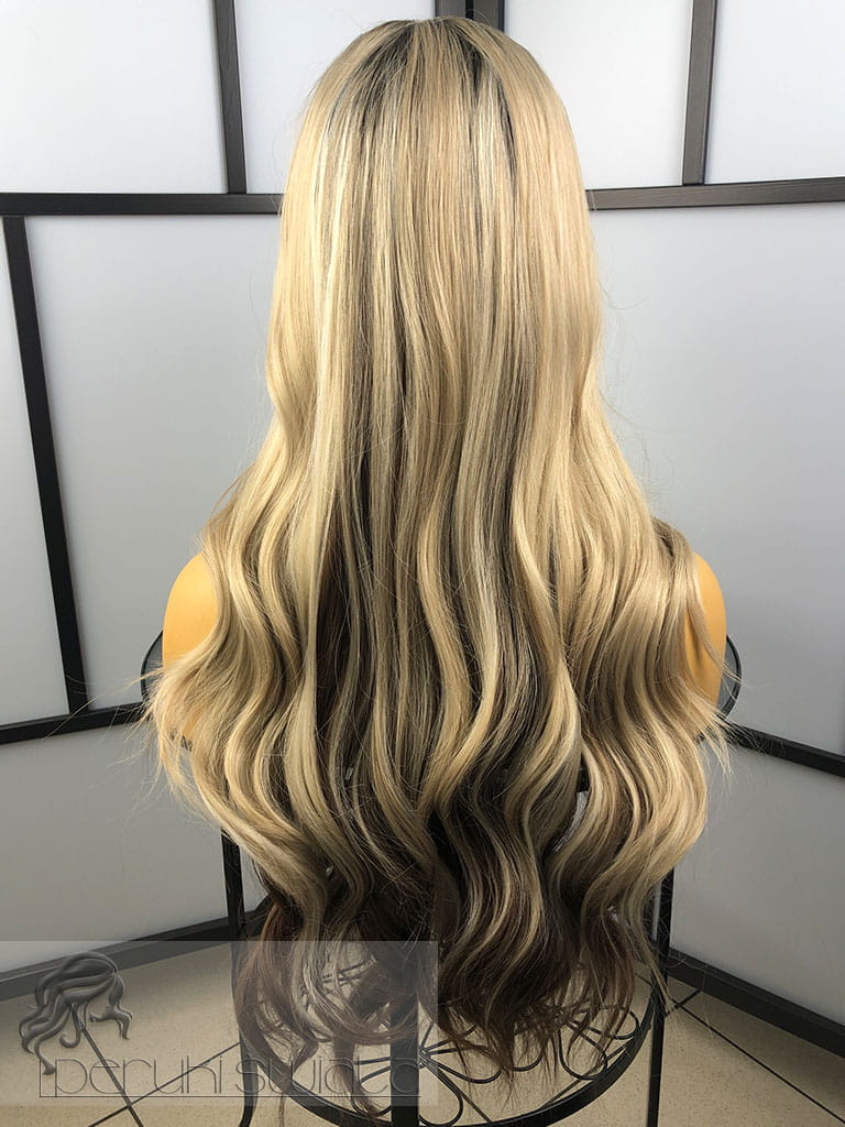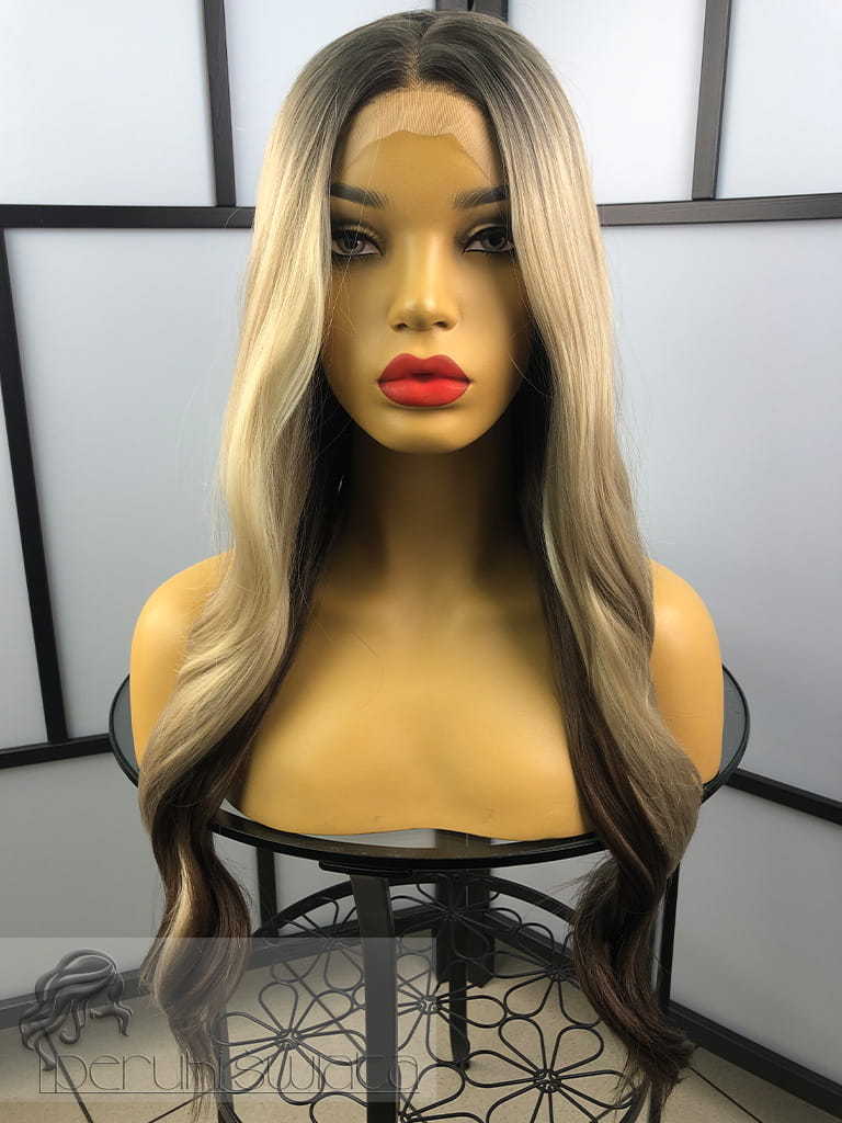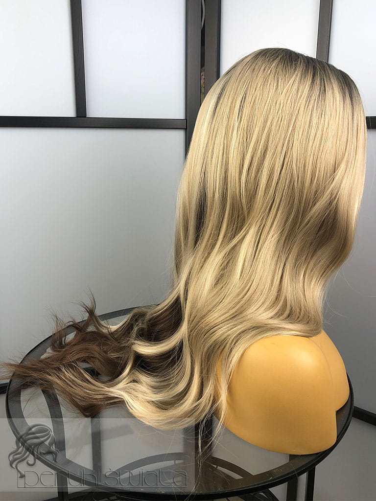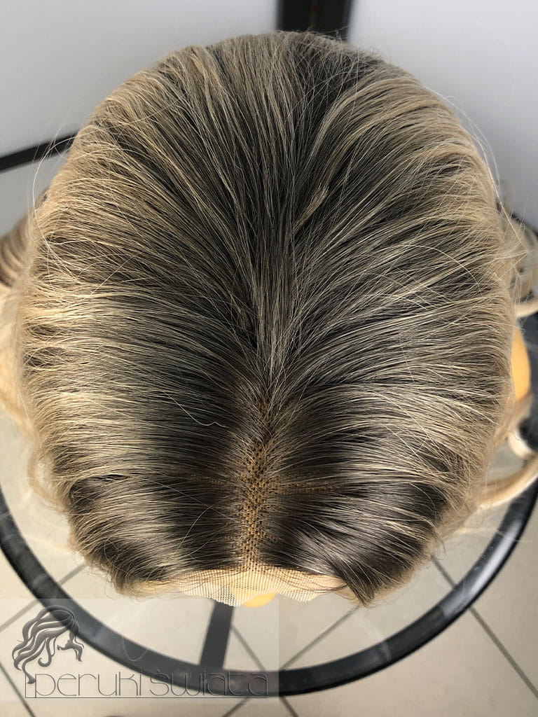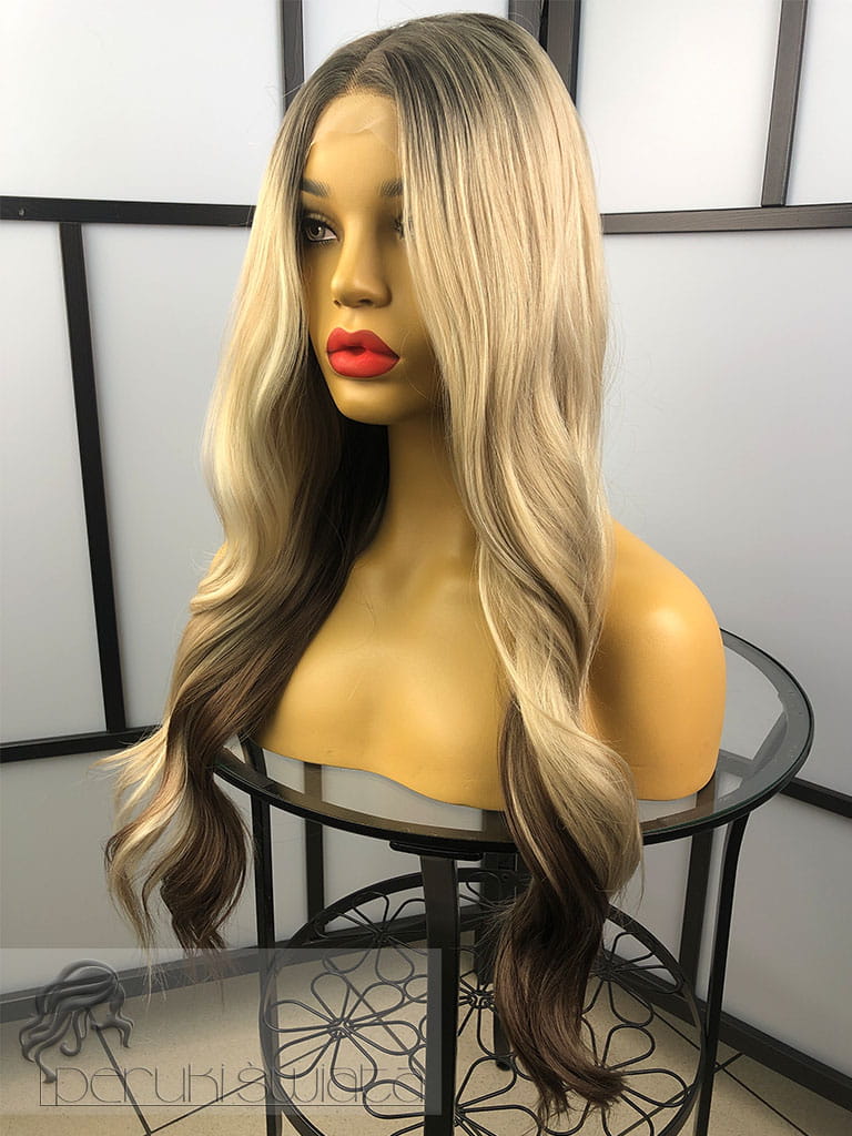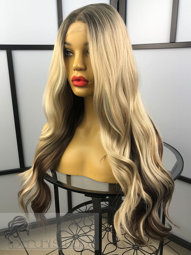 Peruka syntetyczna, model Lena, kanekalon japoński, full lace front, mix chłodnych blondów z brązem na odroście