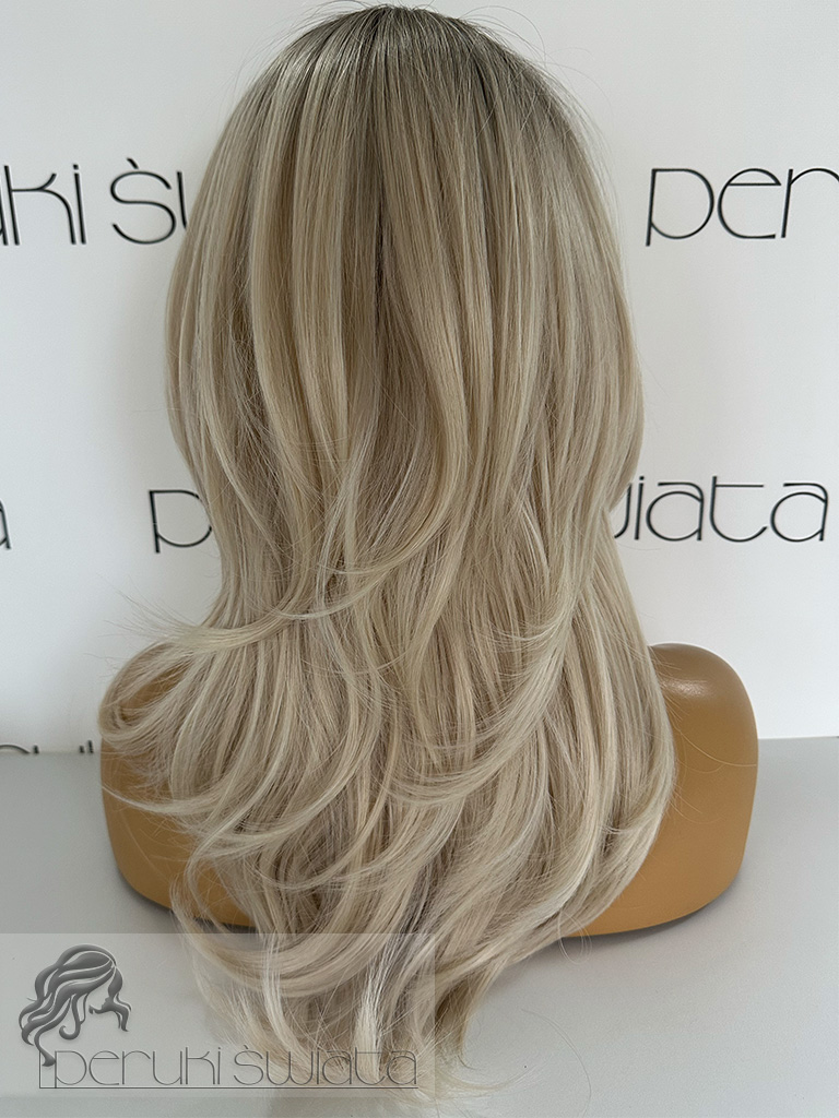Peruka syntetyczna Akane, long bob z grzywką, jasny blond na odroście