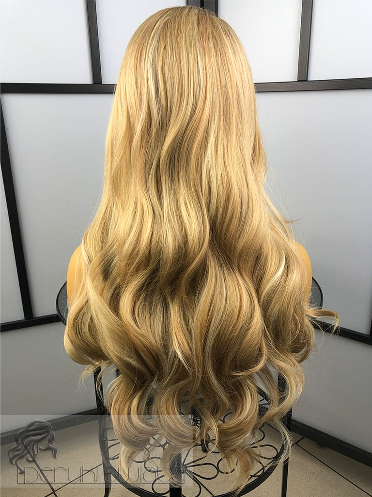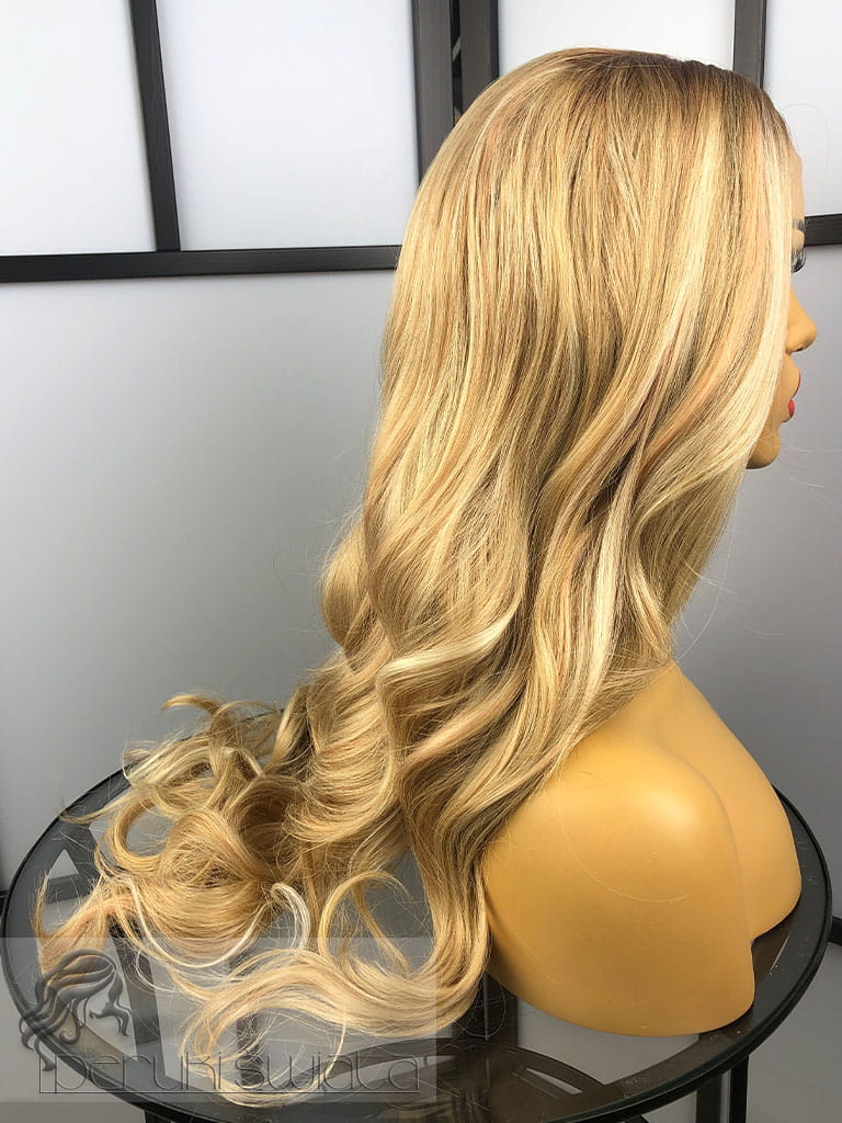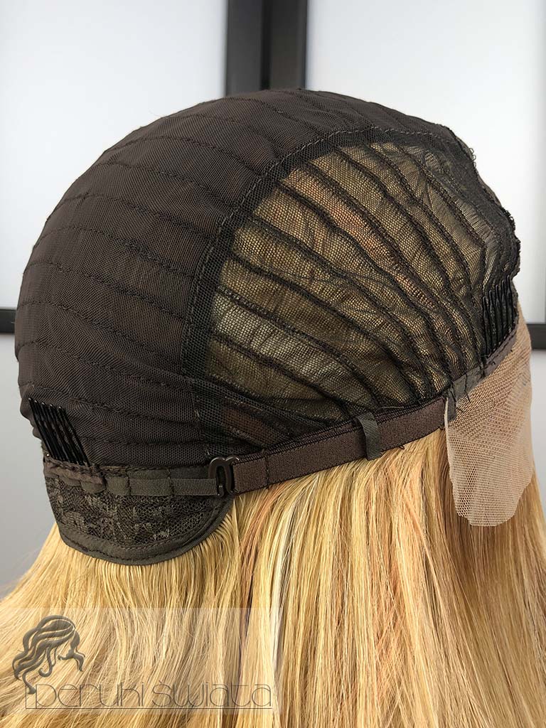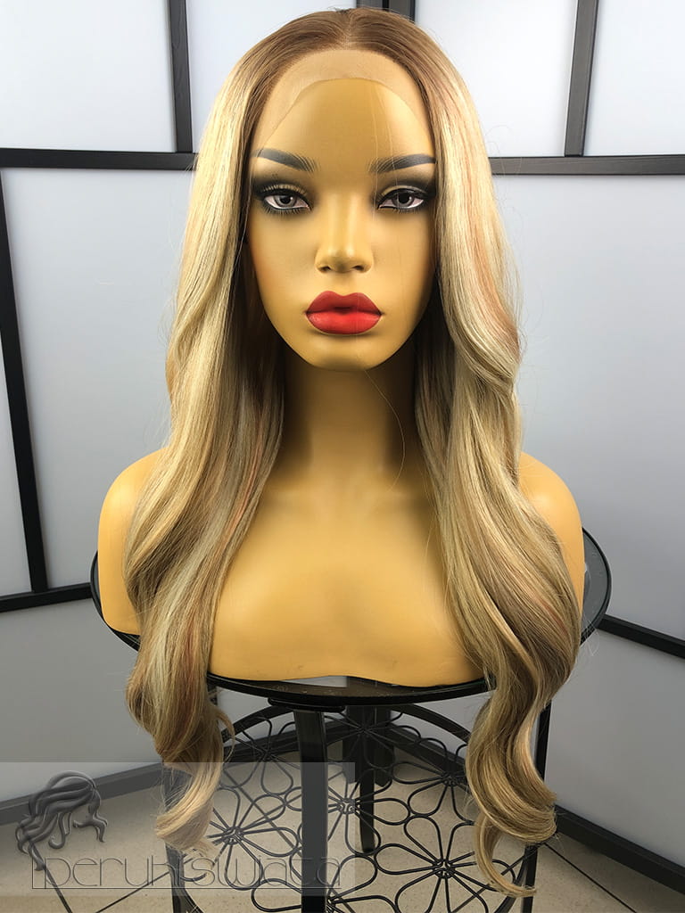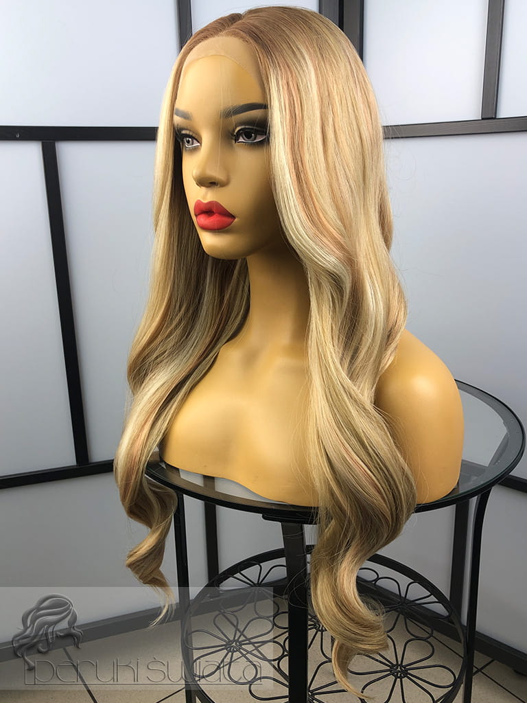Peruka syntetyczna Anastazja, kanekalon termoplastyczny, full lace front, ciepły blond z pasemkami