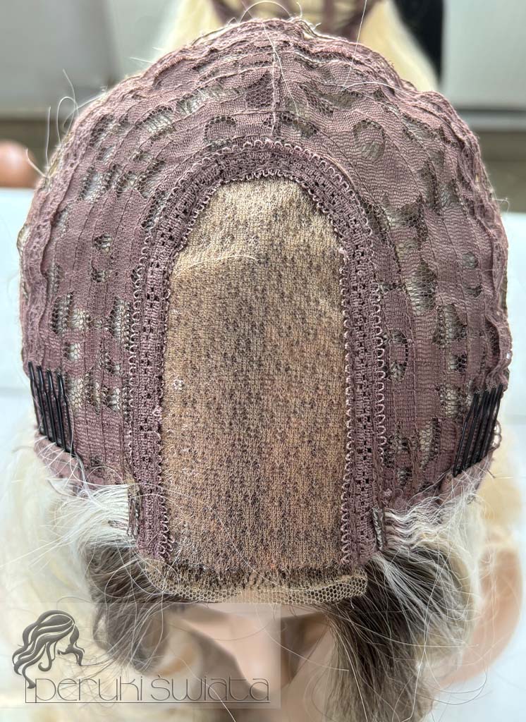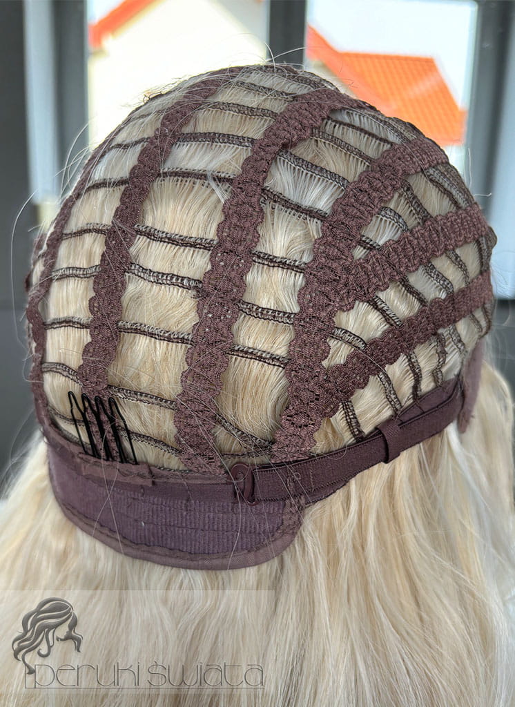 Lekka peruka syntetyczna Wiktoria, z kanekalonu termoplastycznego, mokra włoszka, chłodny perłowy blond, asymetryczny przedziałek