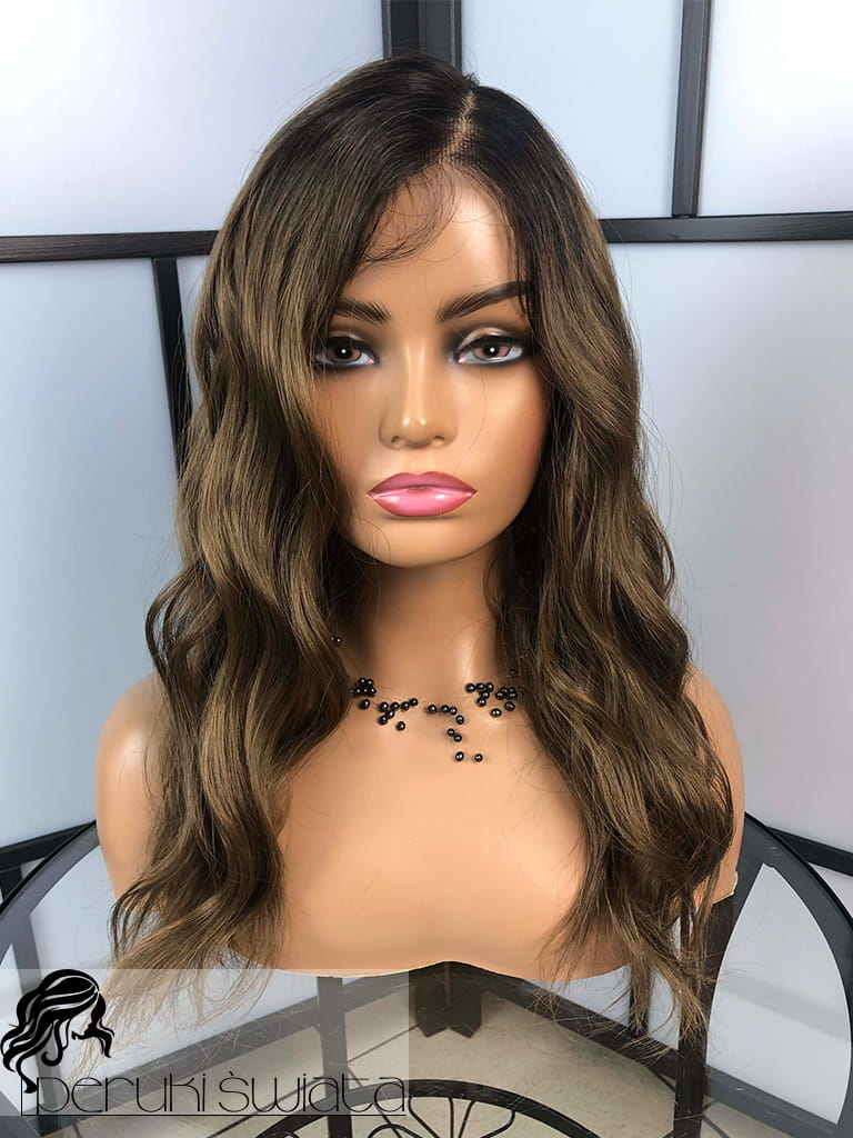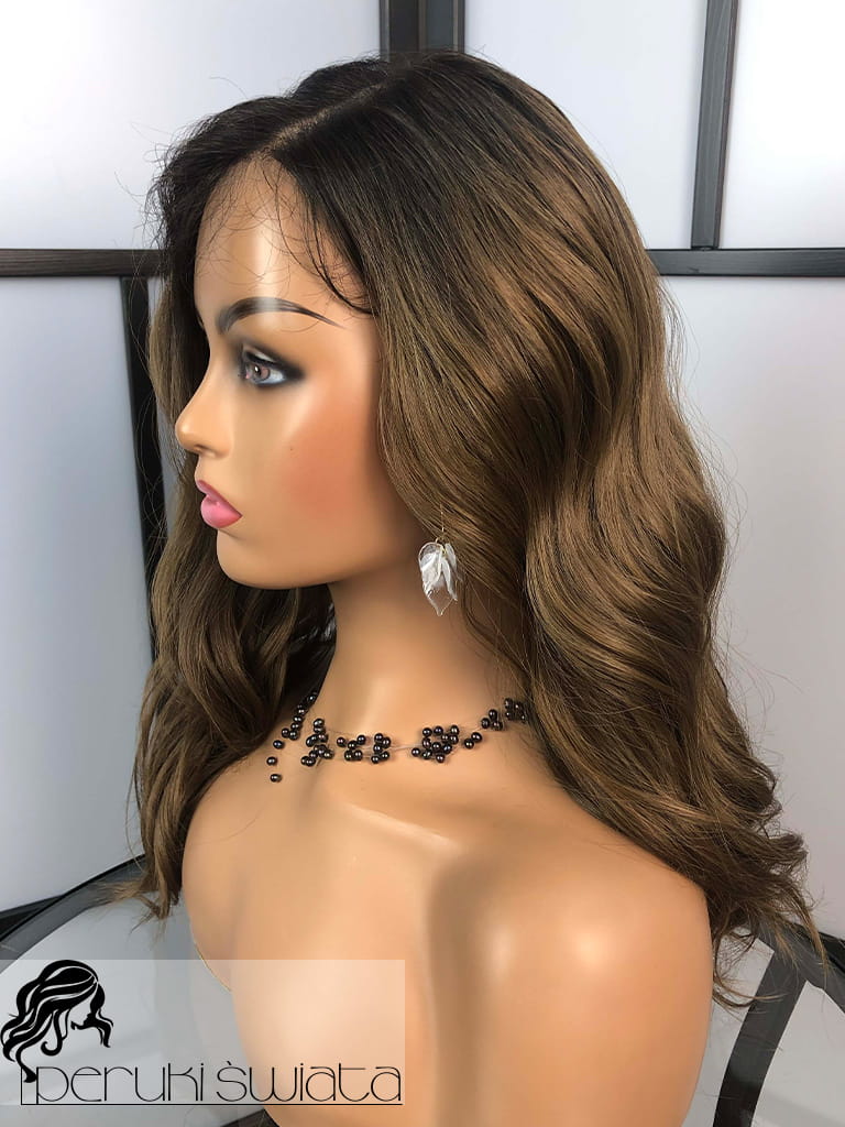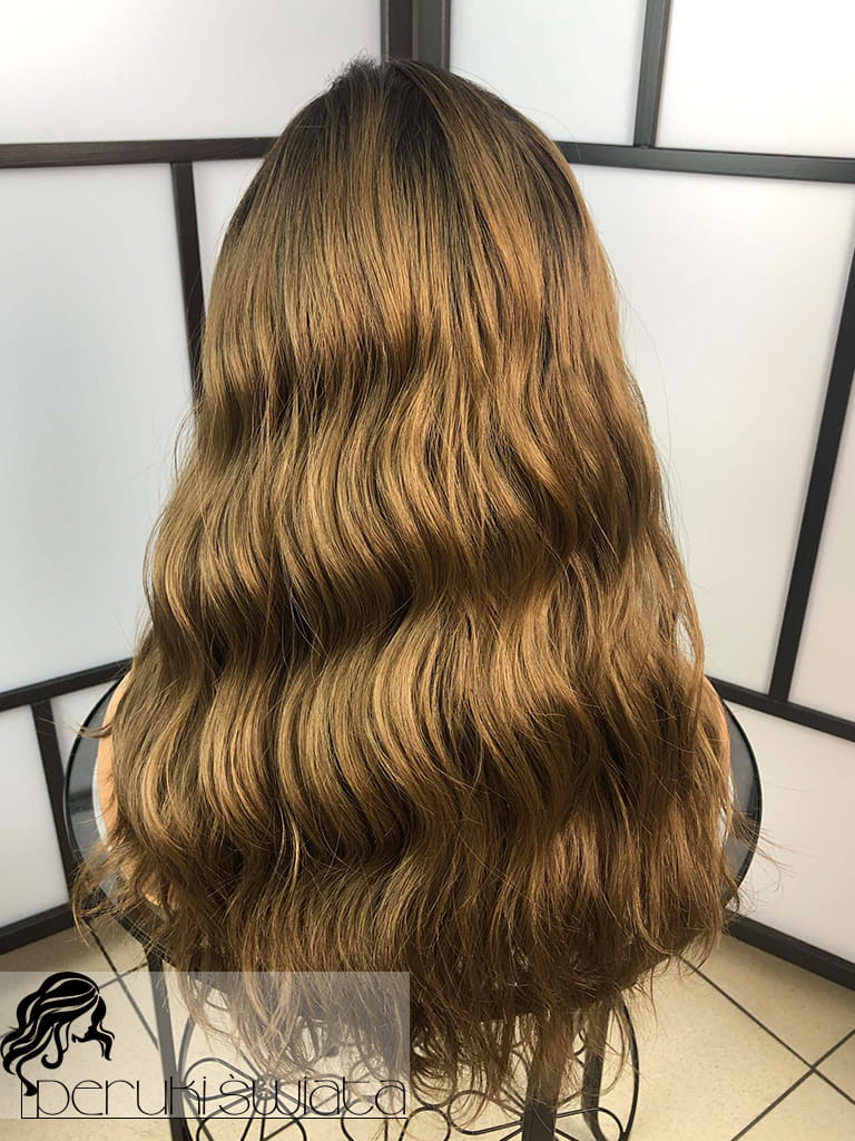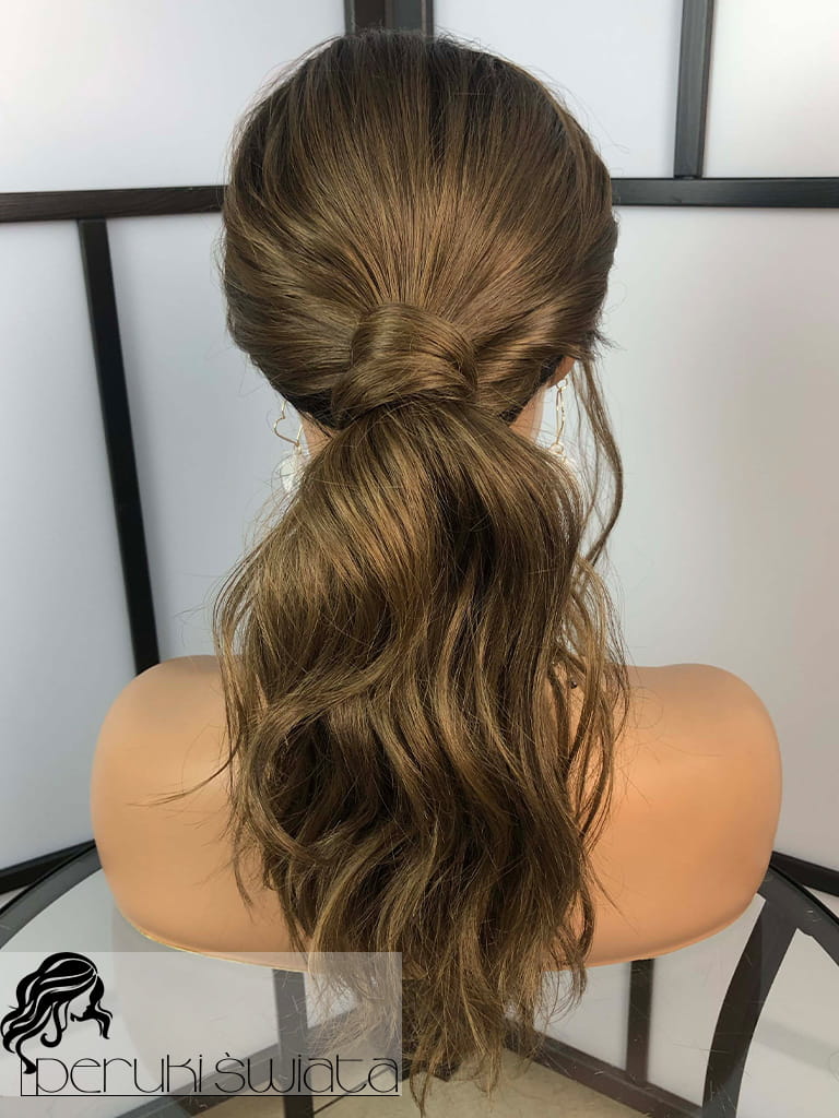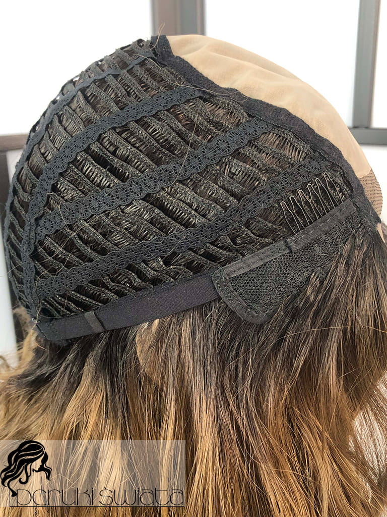 Peruka syntetyczna Beryl, z kanekalonu japońskiego, monotop, ultra light, long bob, fale, kolor: szatyn brąz na odroście