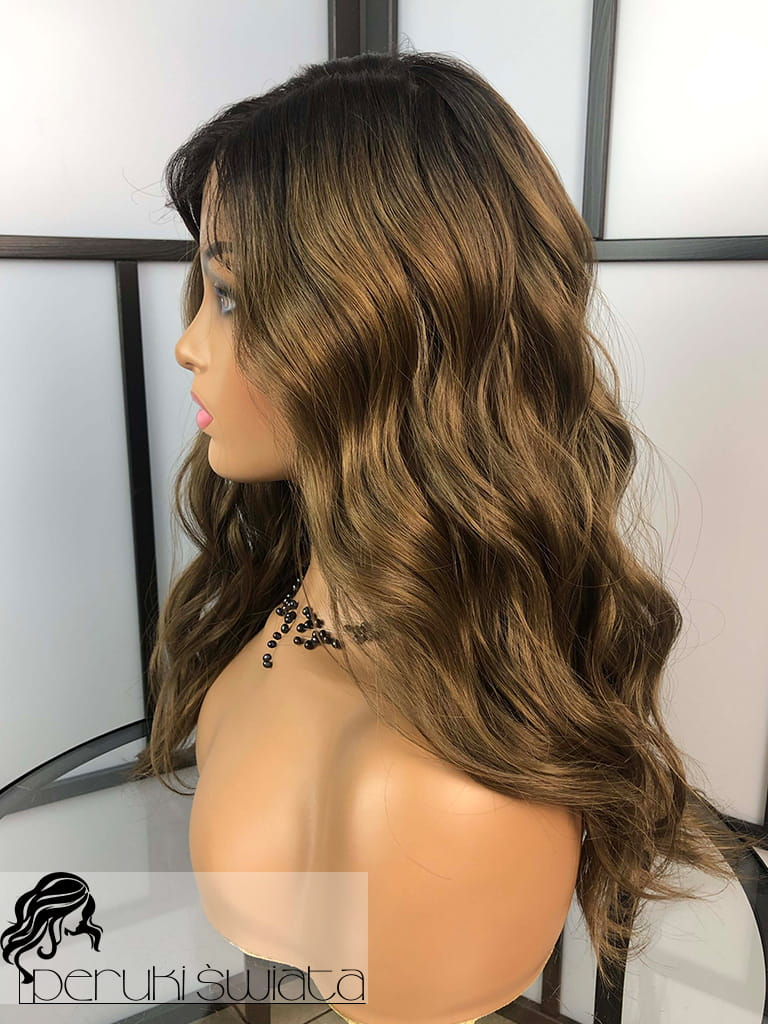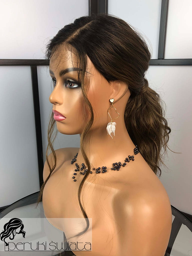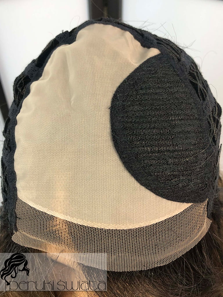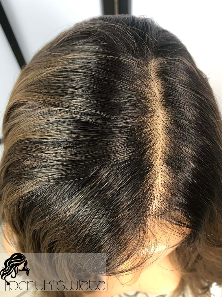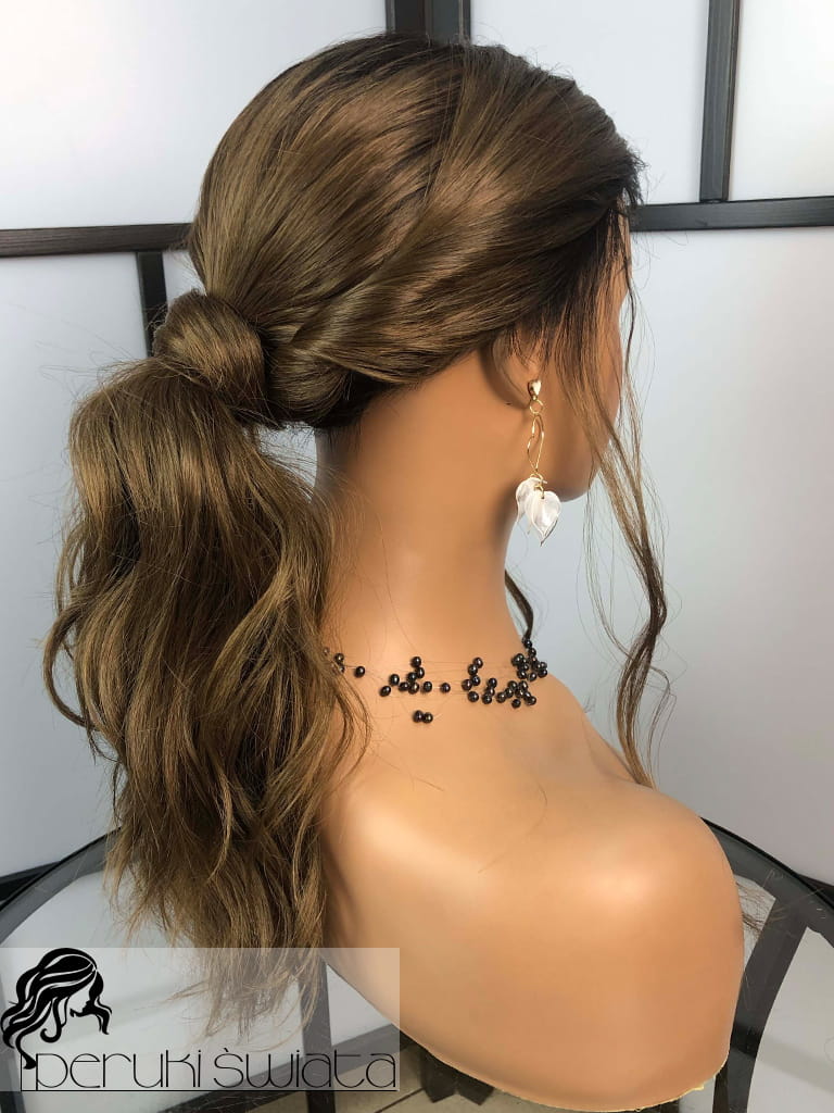 Peruka syntetyczna Beryl, z kanekalonu japońskiego, monotop, ultra light, long bob, fale, kolor: szatyn brąz na odroście