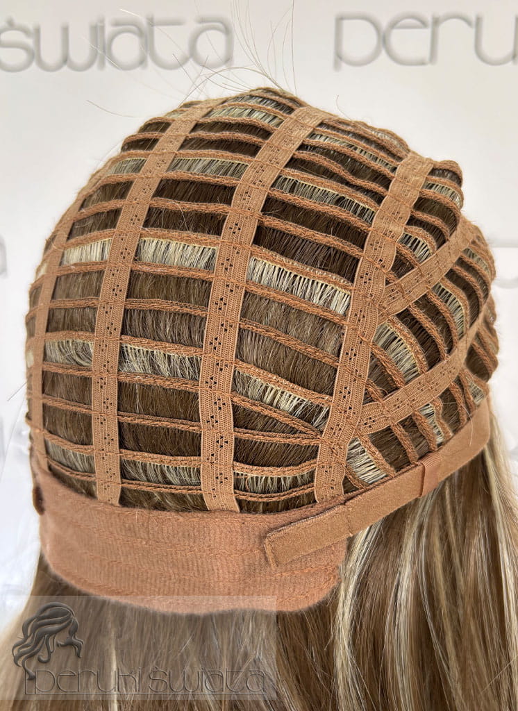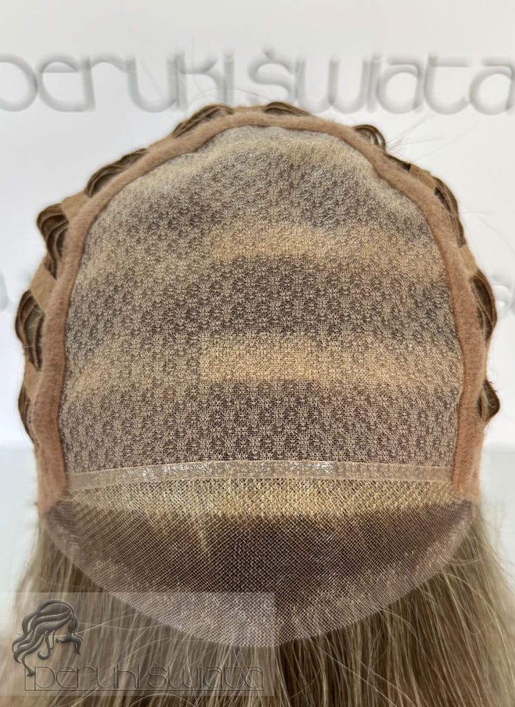 Czepek ręcznie tkany, typu monotop (możliwość dowolnego zaczesania przedziałka w obrębie siateczki, podcięcia grzywki, efekt wyrastania włosów z głowy, rozmyta linia przednia peruki)