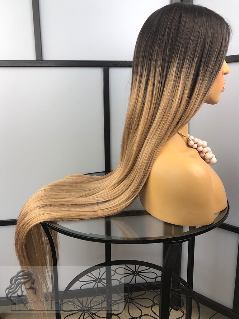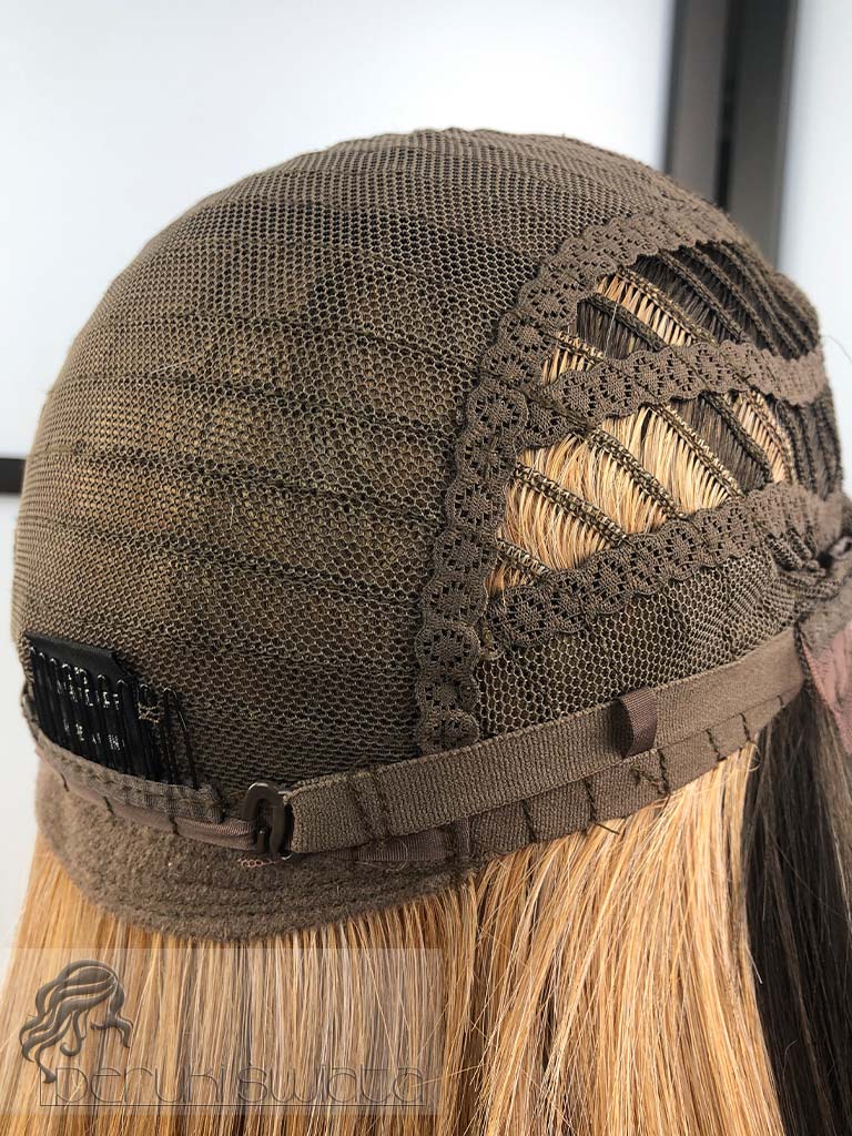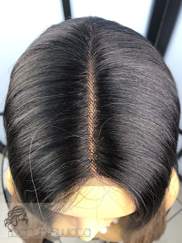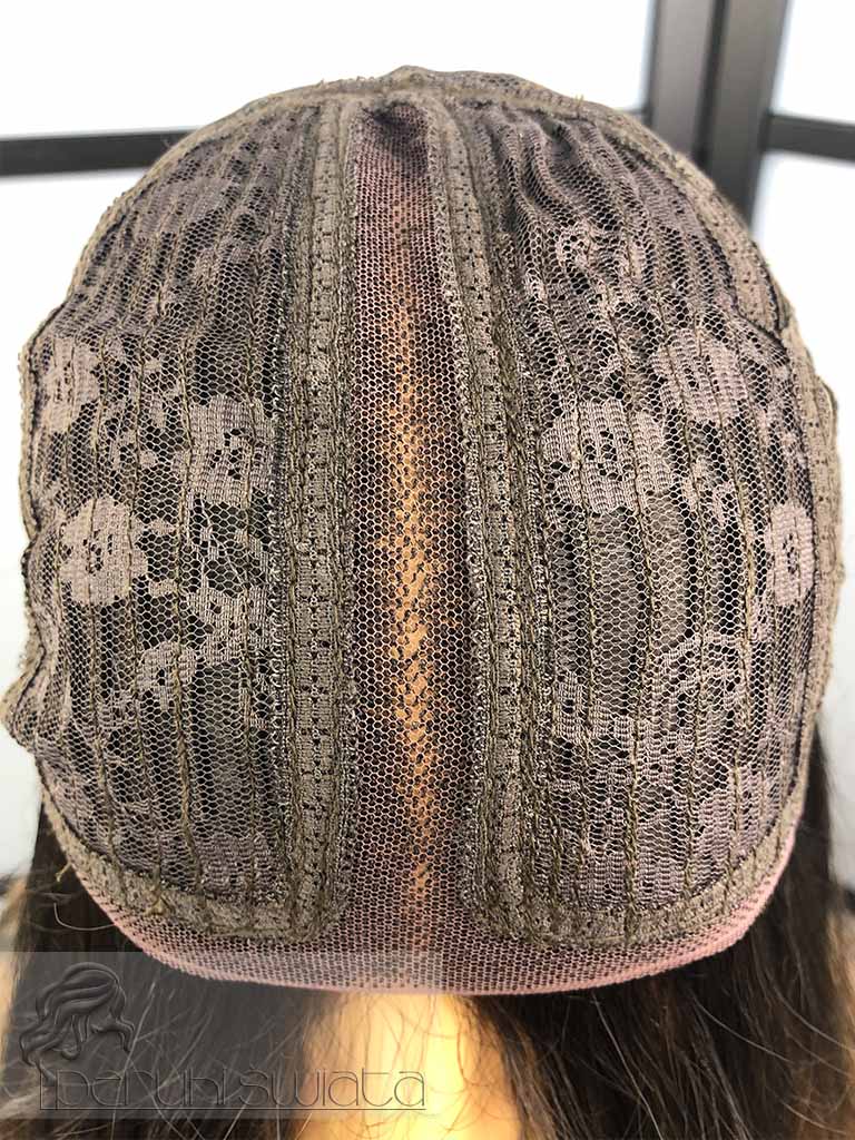 Typ czepka: częściowo ręcznie tkany na siateczce typu lace front (efekt wyrastania włosów z głowy, rozmyta przednia linia peruki), głęboki przedziałek, wykonane baby hair
