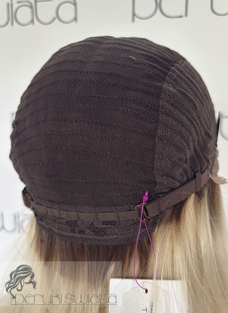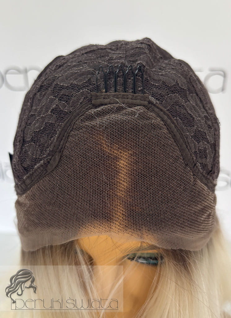 Czepek typu: full lace front (możliwość przestylizowania przedziałka w obrębie siateczki, podcięcia grzywki, efekt wyrastania włosów z głowy, rozmyta linia przednia peruki)