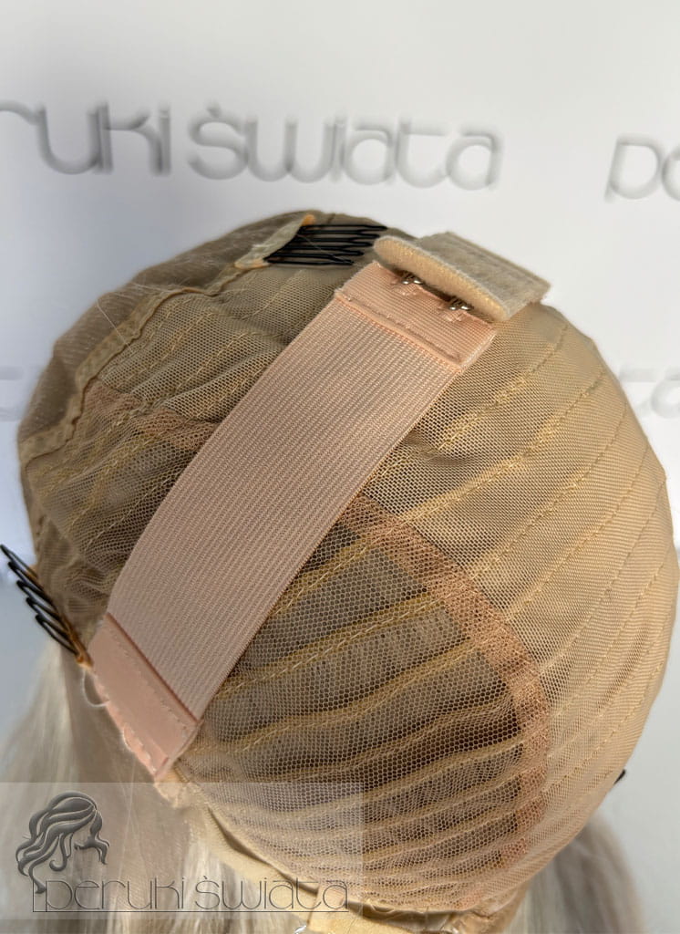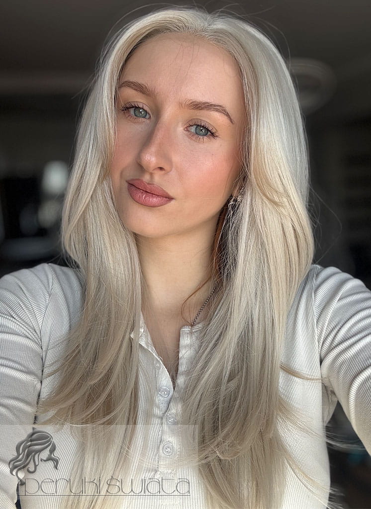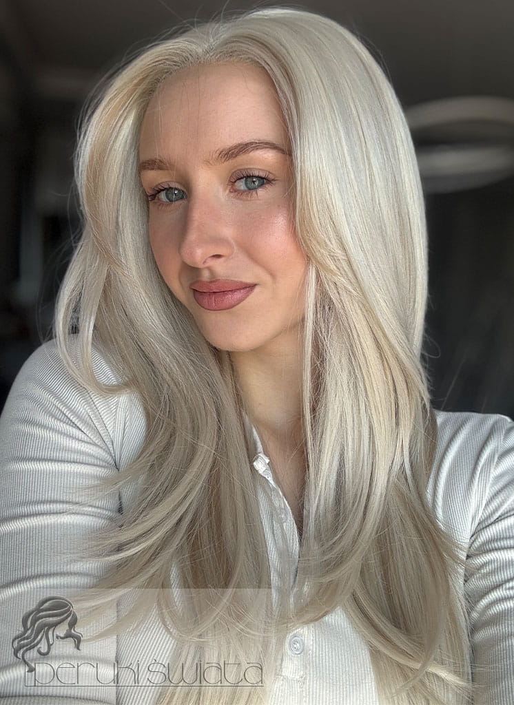 Lekka peruka syntetyczna Wiktoria, z kanekalonu termoplastycznego, mokra włoszka, chłodny perłowy blond, asymetryczny przedziałek