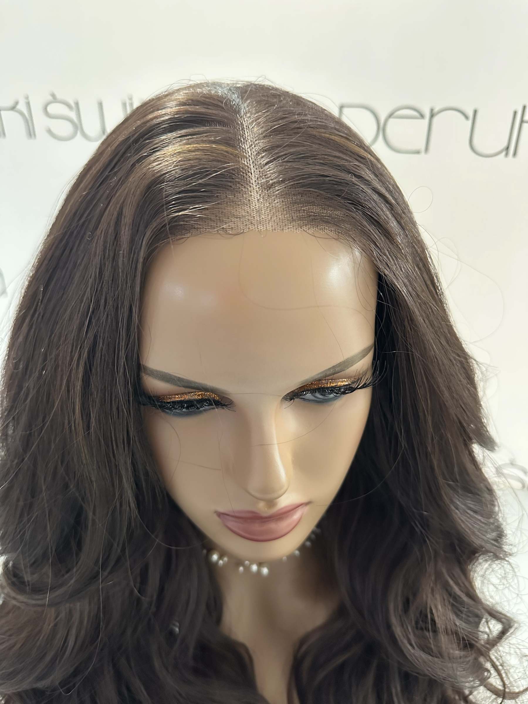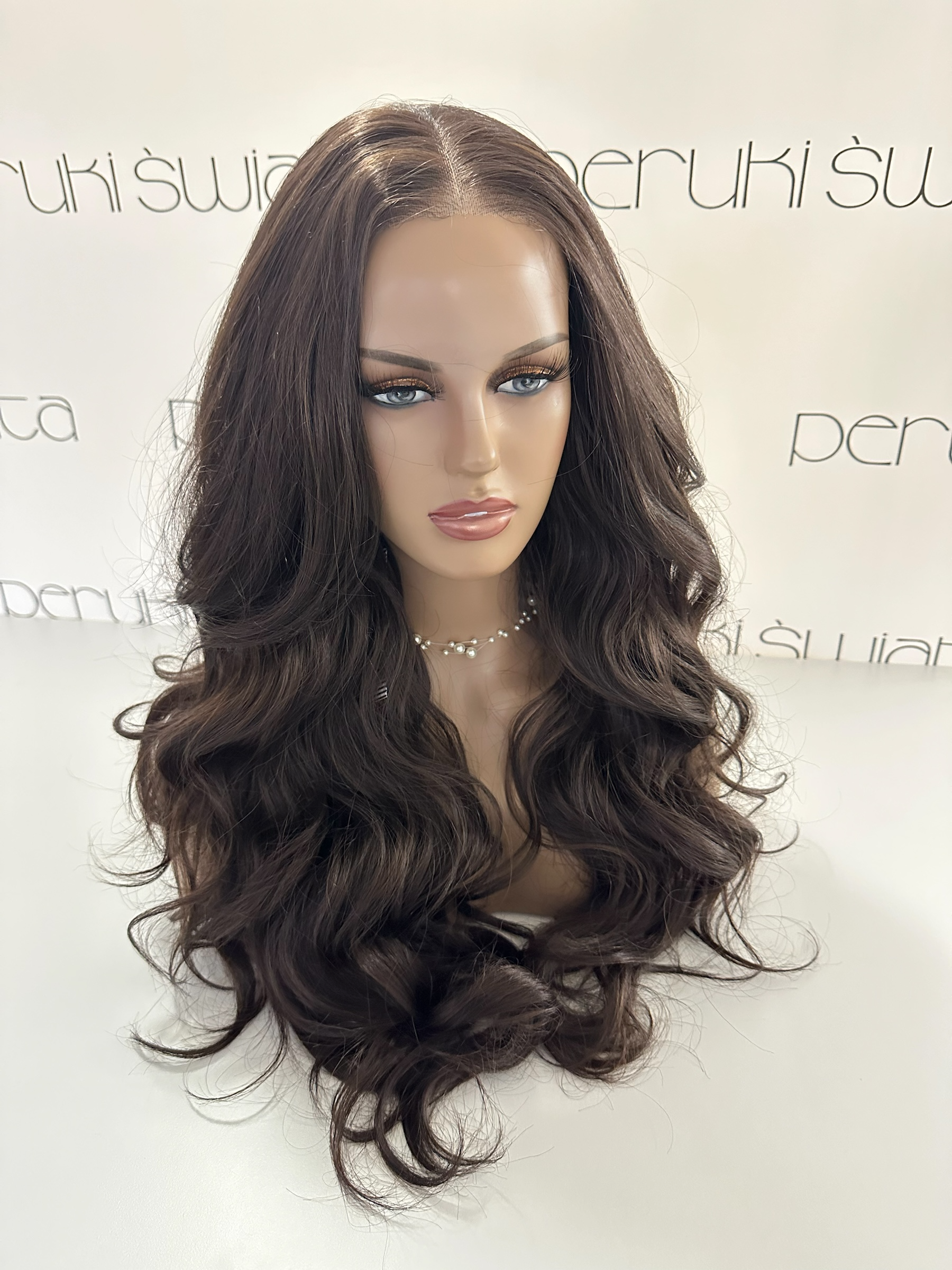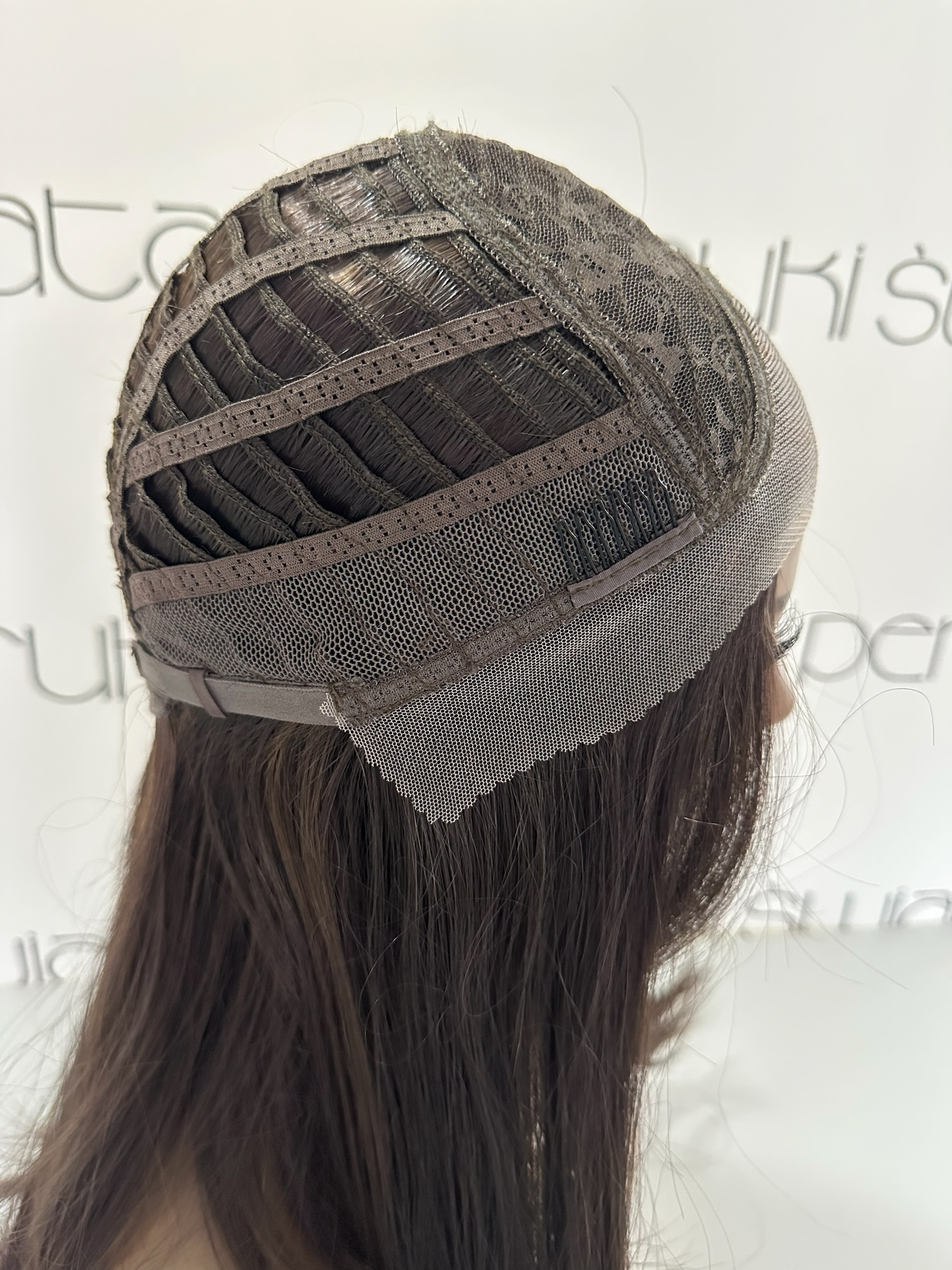 Czepek typu: full lace front (możliwość dowolnego zaczesania przedziałka w obrębie siateczki, podcięcia grzywki, efekt wyrastania włosów z głowy, rozmyta linia przednia peruki)