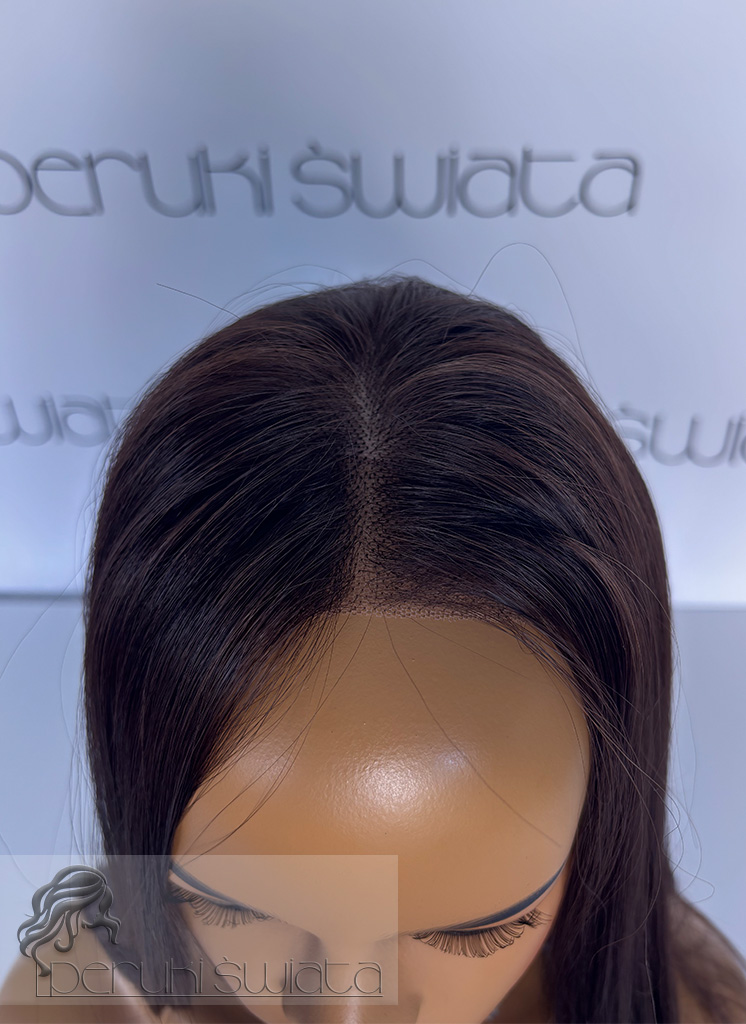 Czepek typu: full lace front (możliwość dowolnego zaczesania przedziałka w obrębie siateczki, podcięcia grzywki, efekt wyrastania włosów z głowy, rozmyta linia przednia peruki)