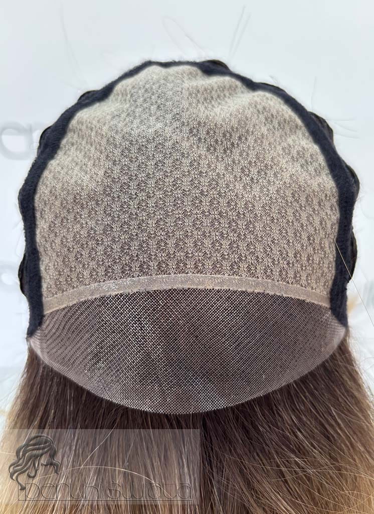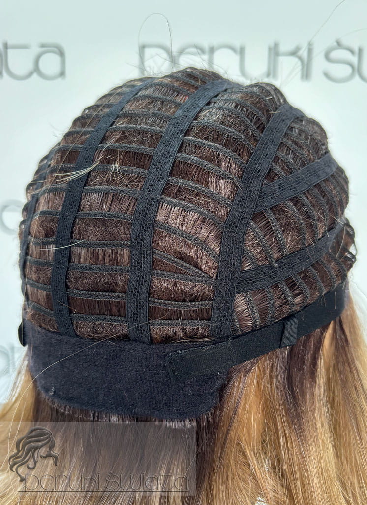 Czepek ręcznie tkany, typu monotop (możliwość dowolnego zaczesania przedziałka w obrębie siateczki, podcięcia grzywki, efekt wyrastania włosów z głowy, rozmyta linia przednia peruki)