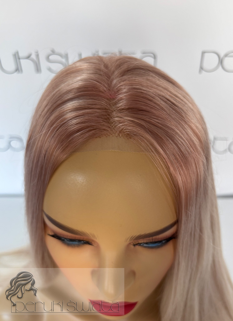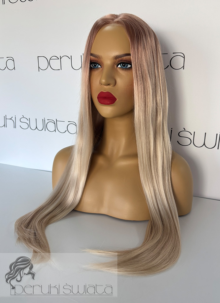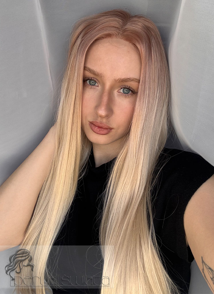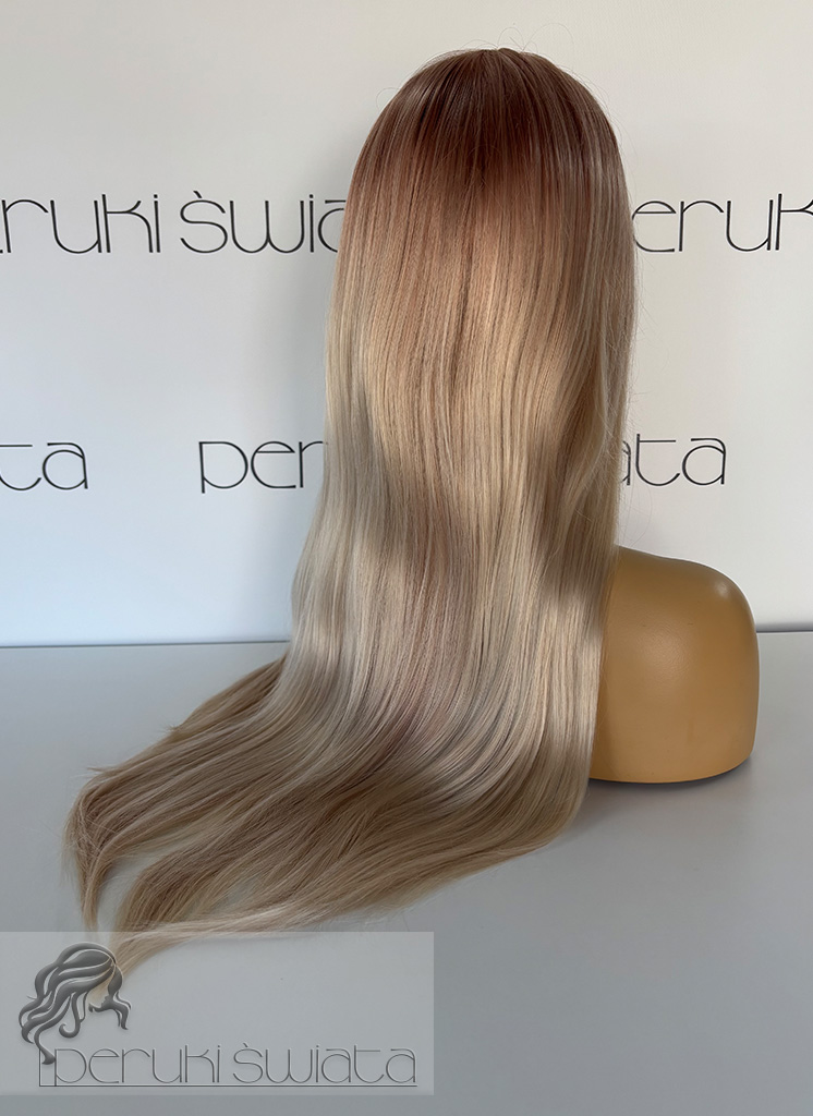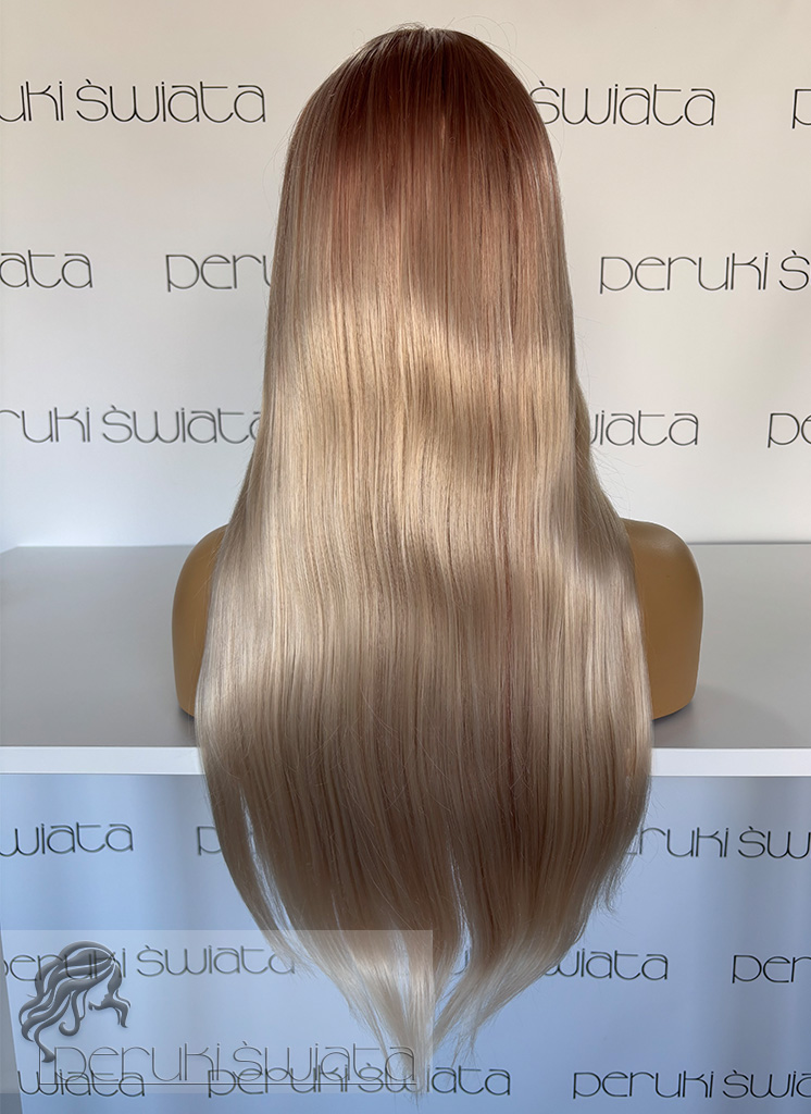Peruka syntetyczna Ginger, czepek typu: full lace, kanekalon termoplastyczny, jasny blond na truskawkowym odroście