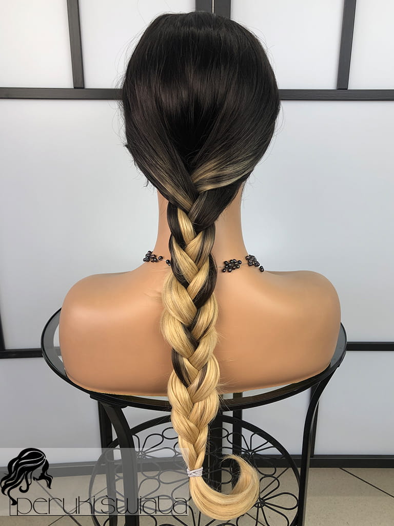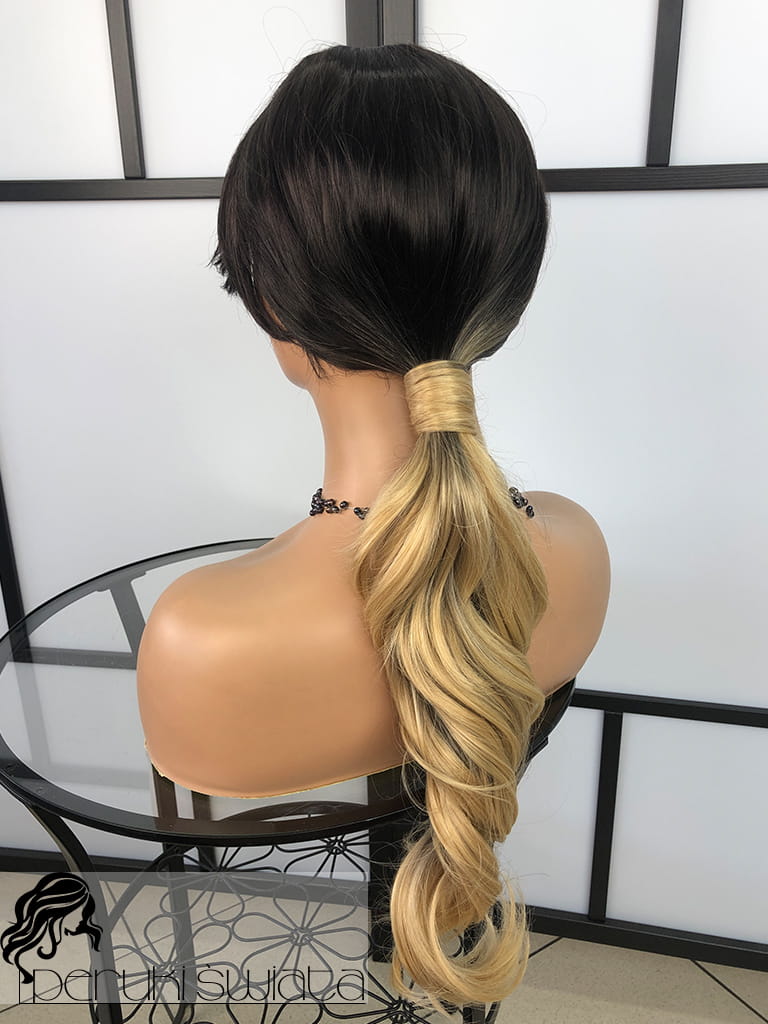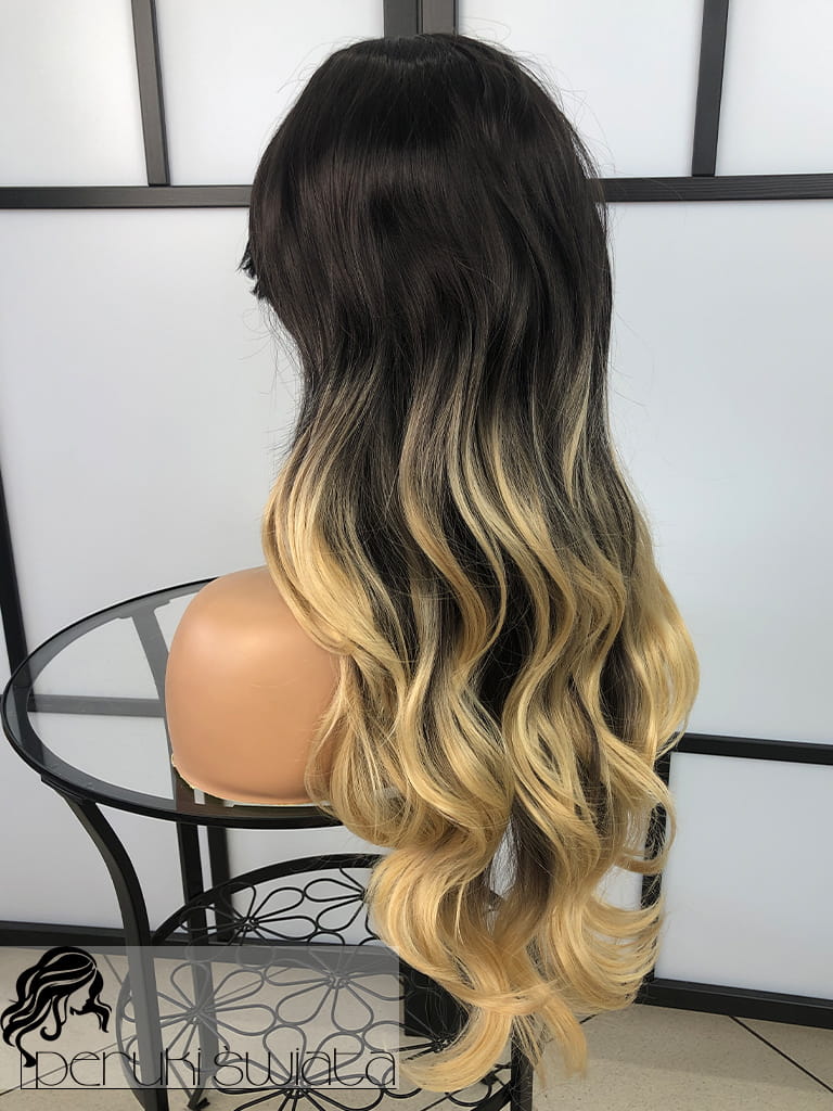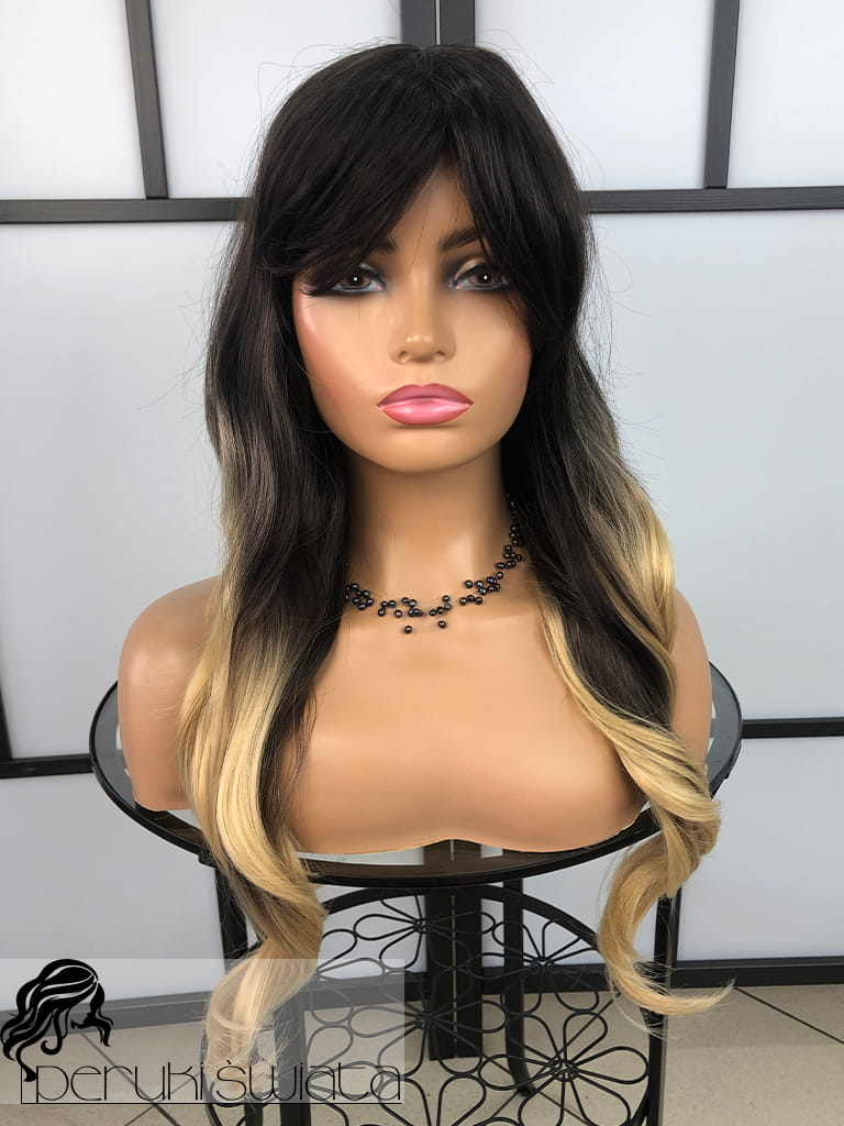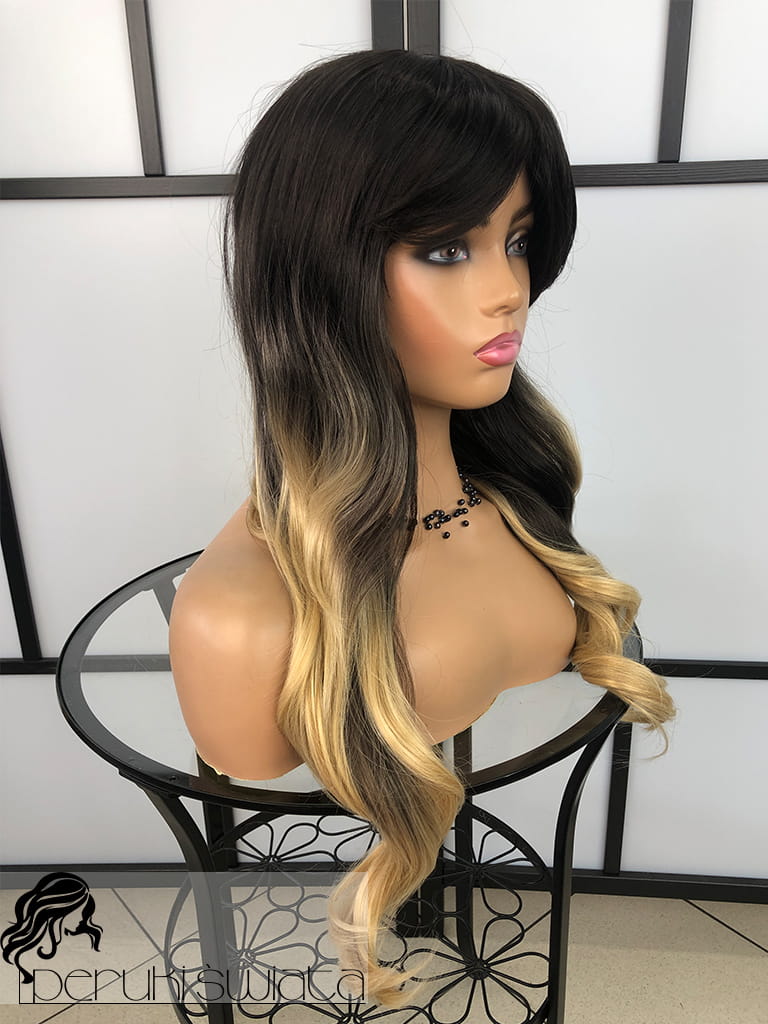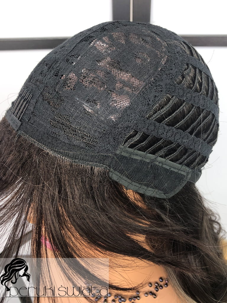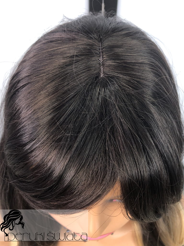 Peruka syntetyczna Hilda, fale, ciemny brąz ze słonecznym blondem