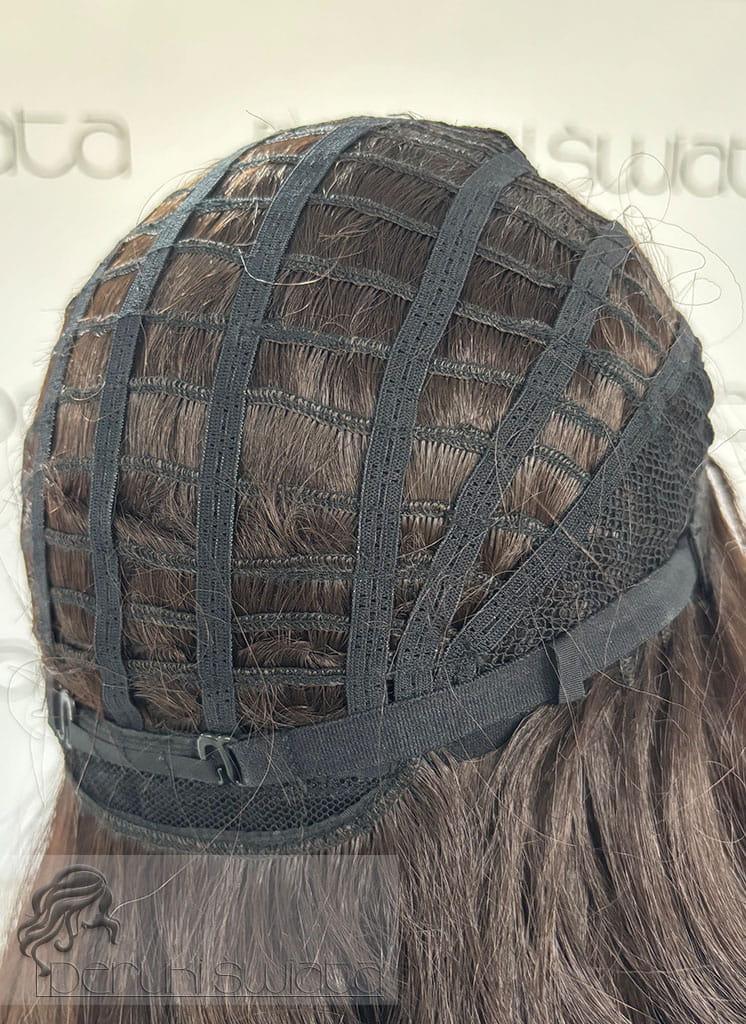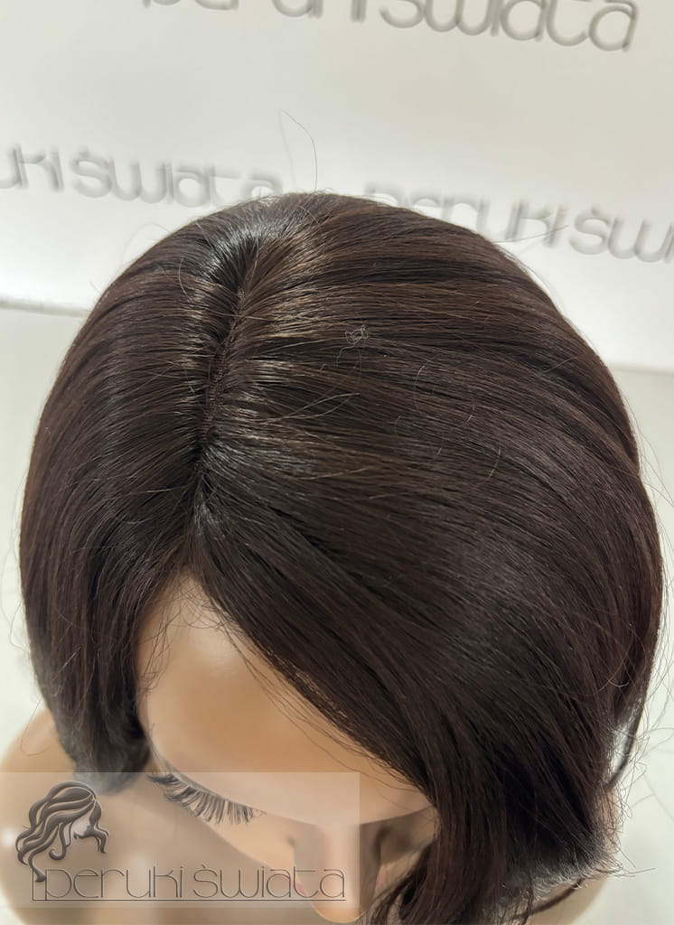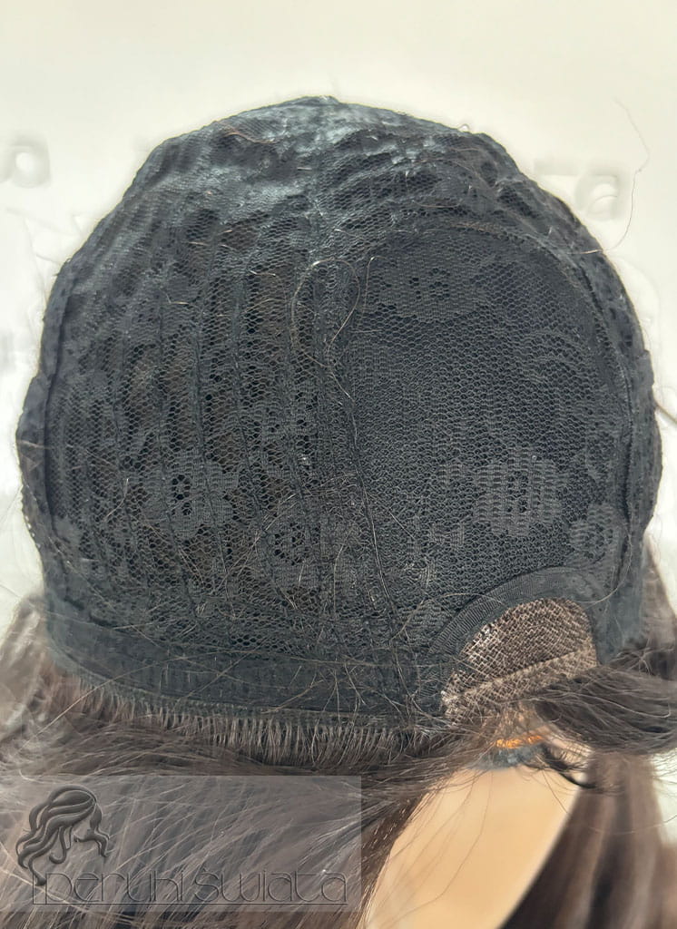 Częściowa mikroskóra tzw. part lace (na połączeniu z głową), na górze peruki włosy ręcznie nawlekana w siateczkę