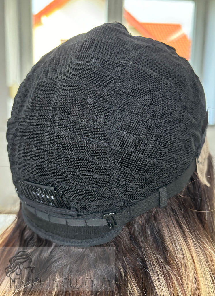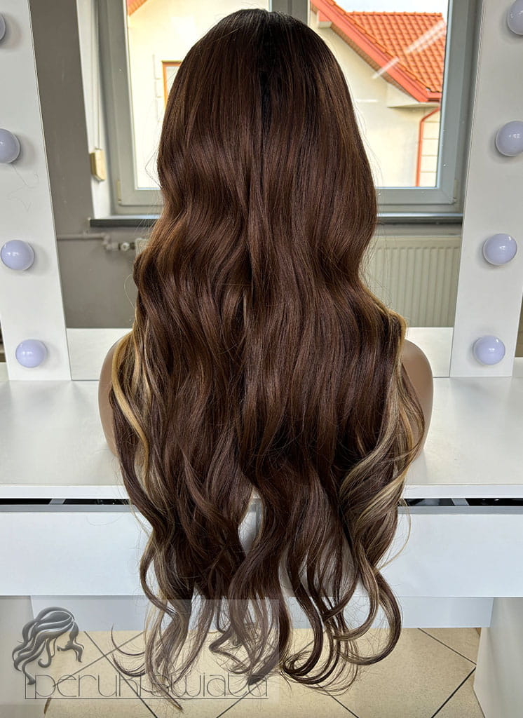 Peruka syntetyczna Lillian, czepek lace front, brąz z pasemkami blond na odroście