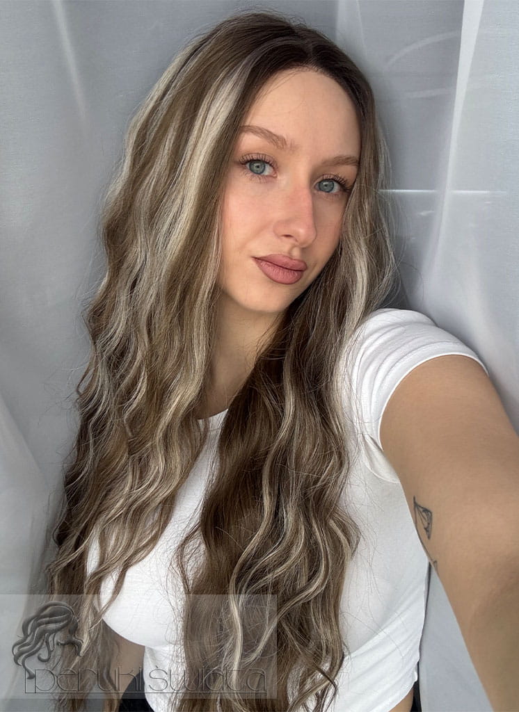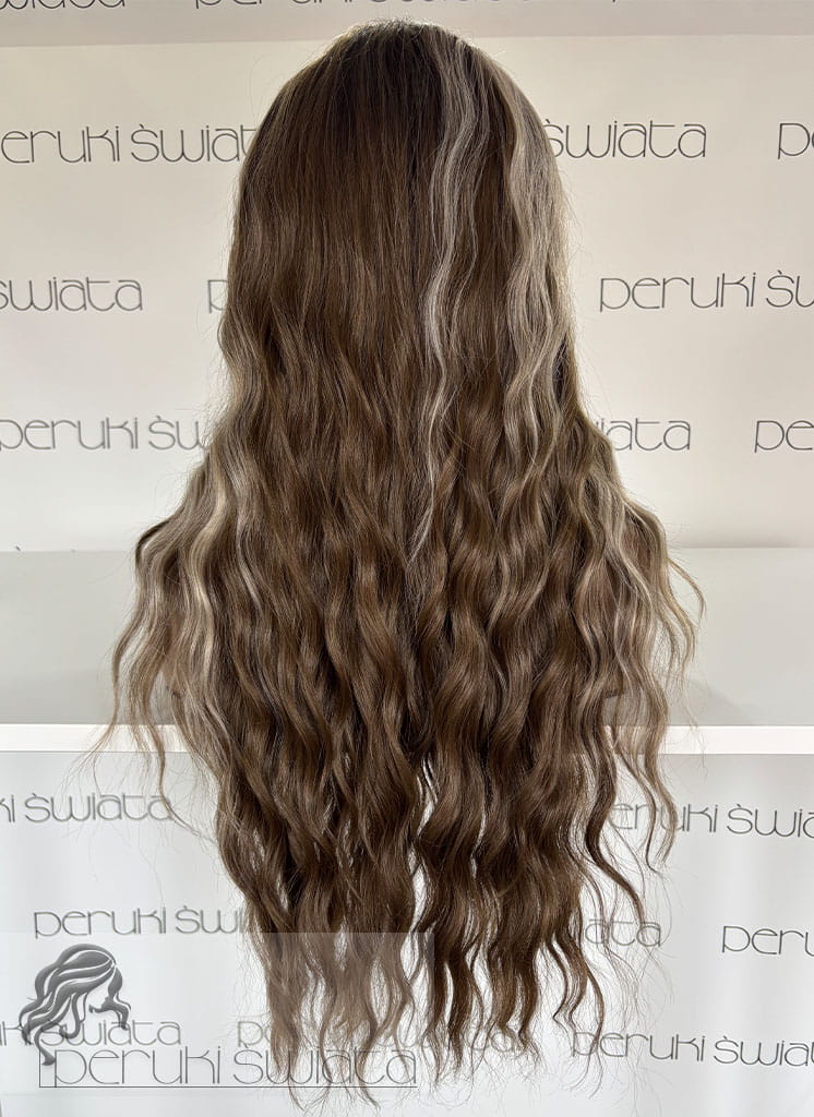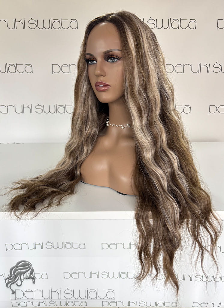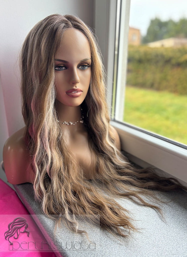 Peruka syntetyczna Livia, czepek typu: full lace, kanekalon termoplastyczny, ciemny, ciepły blond z pasemkami jasnego blondu