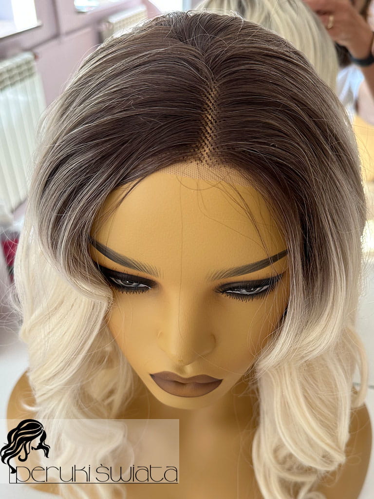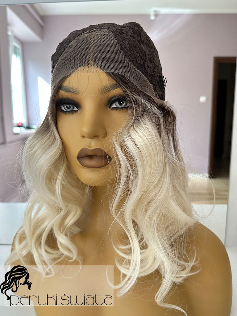 Peruka syntetyczna, kanekalon termoplastyczny, fale, kolor: mix biały blond i piaskowy blond na odroście w kolorze popielatego brązu (24B/613A/6A)