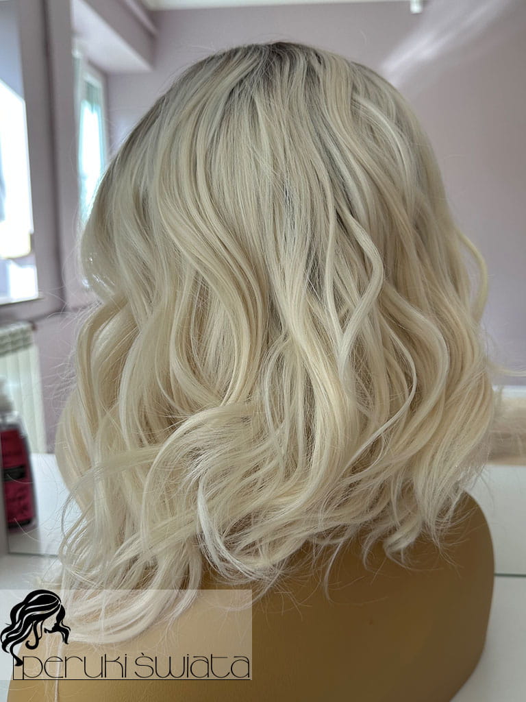 Lekka peruka syntetyczna Wiktoria, z kanekalonu termoplastycznego, mokra włoszka, chłodny perłowy blond, asymetryczny przedziałek