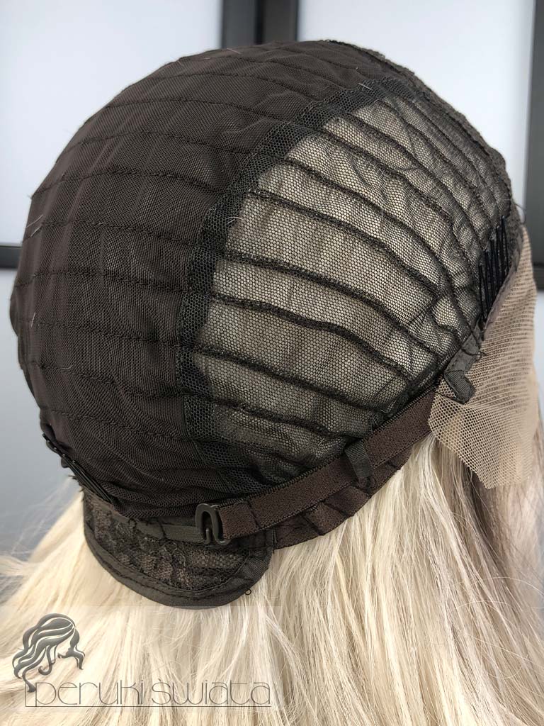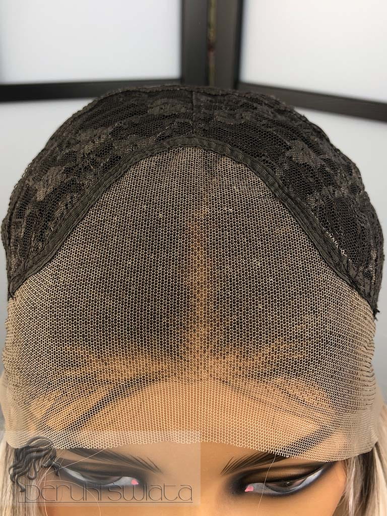 Czepek typu: full lace front (możliwość przestylizowania przedziałka w obrębie skalpu, podcięcia grzywki, efekt wyrastania włosów z głowy, rozmyta linia przednia peruki)