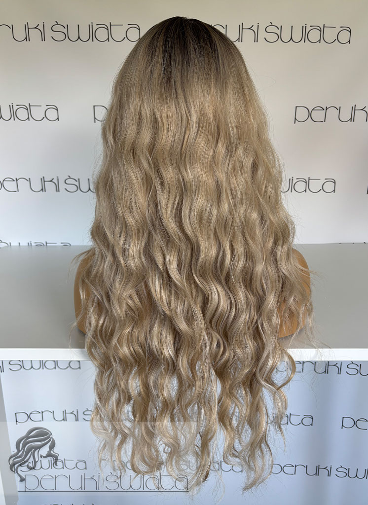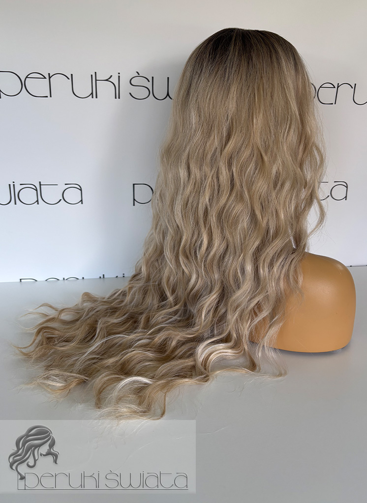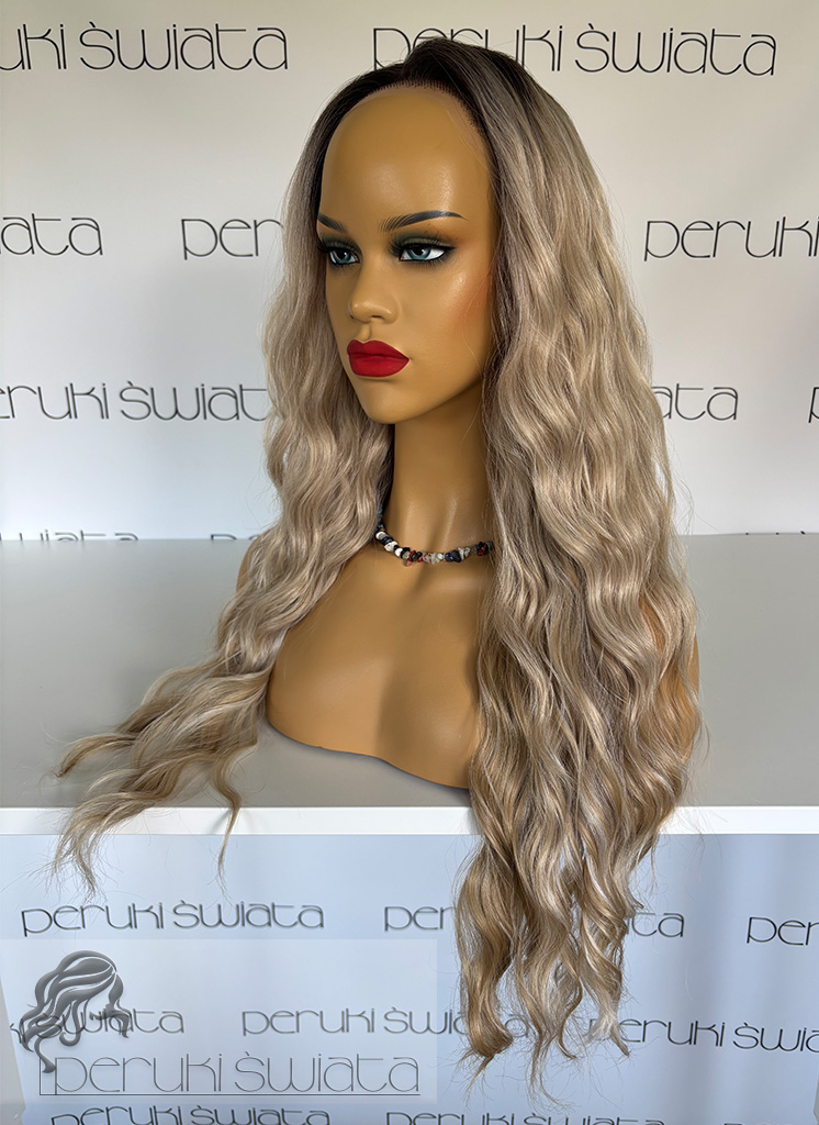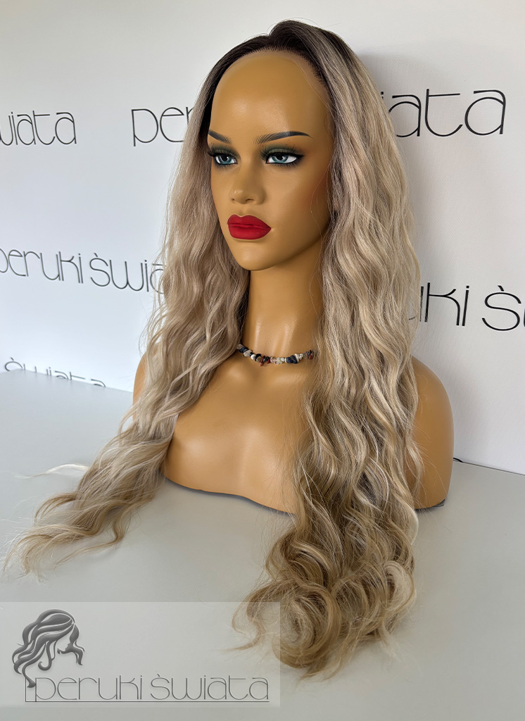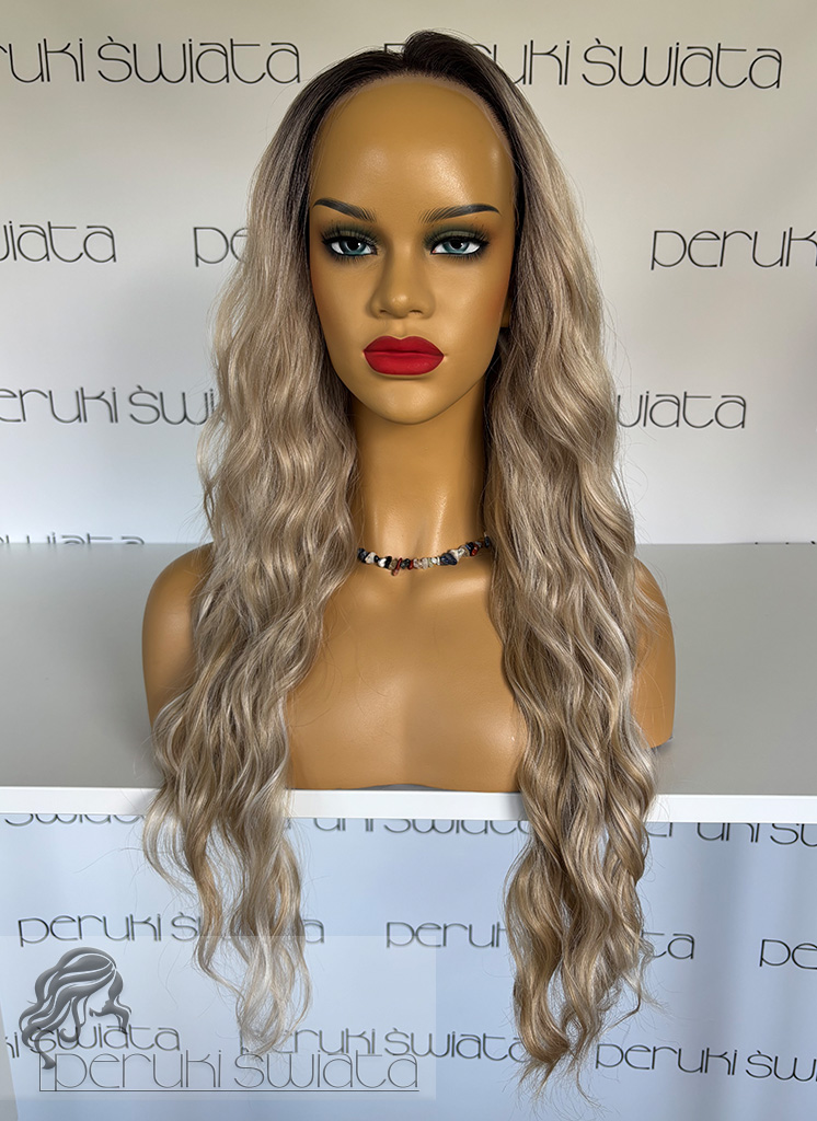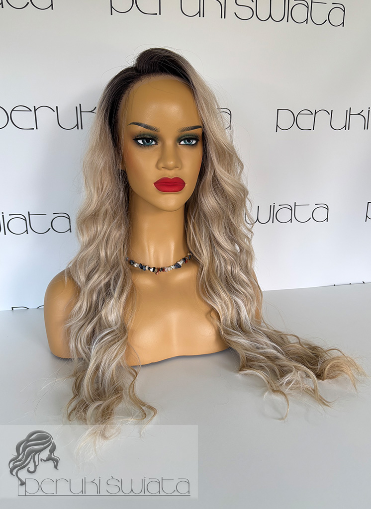 Peruka syntetyczna, kanekalon termoplastyczny, fale, kolor: mix biały blond i piaskowy blond na odroście w kolorze popielatego brązu (24B/613A/6A)