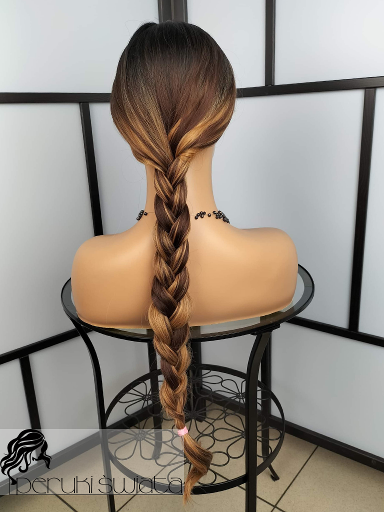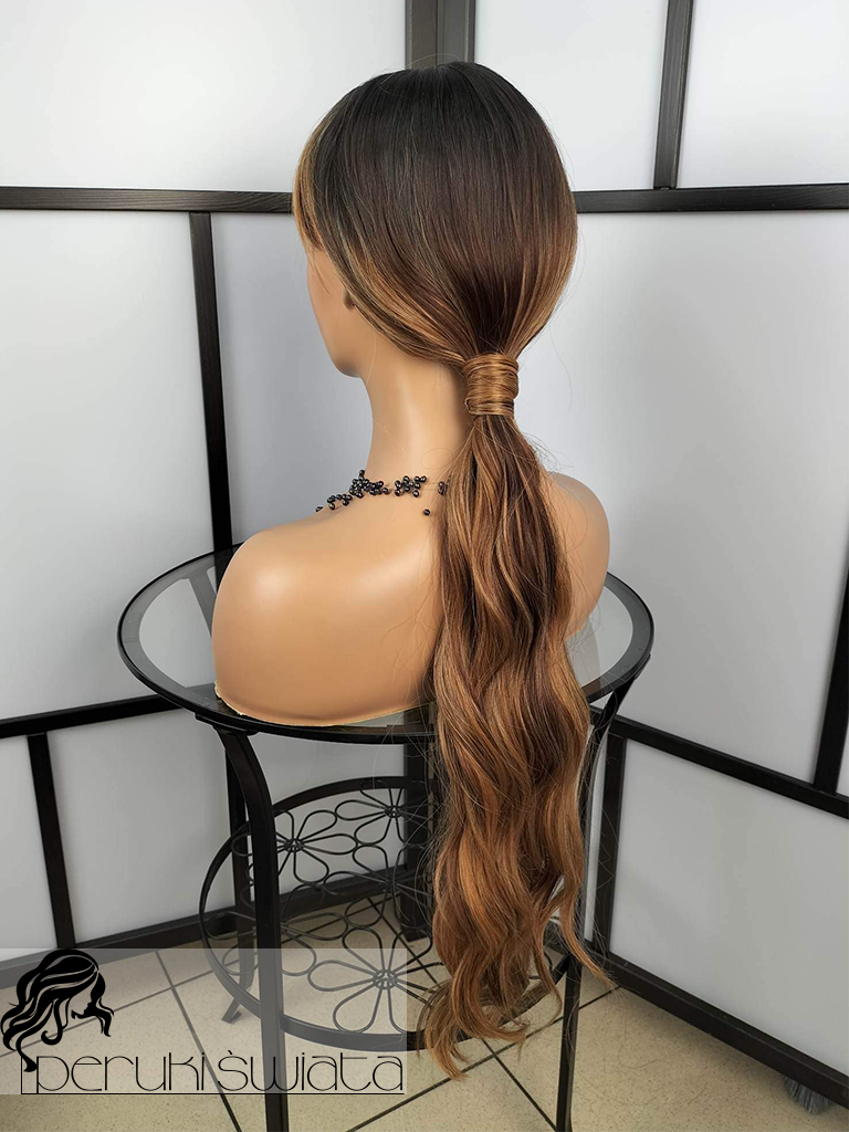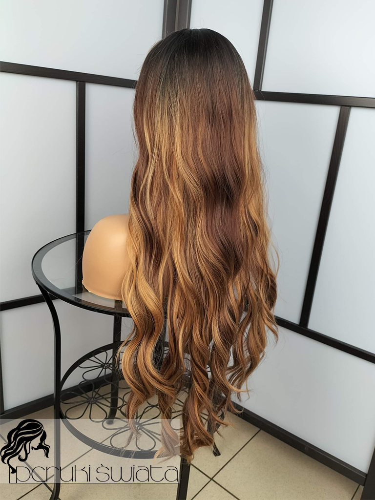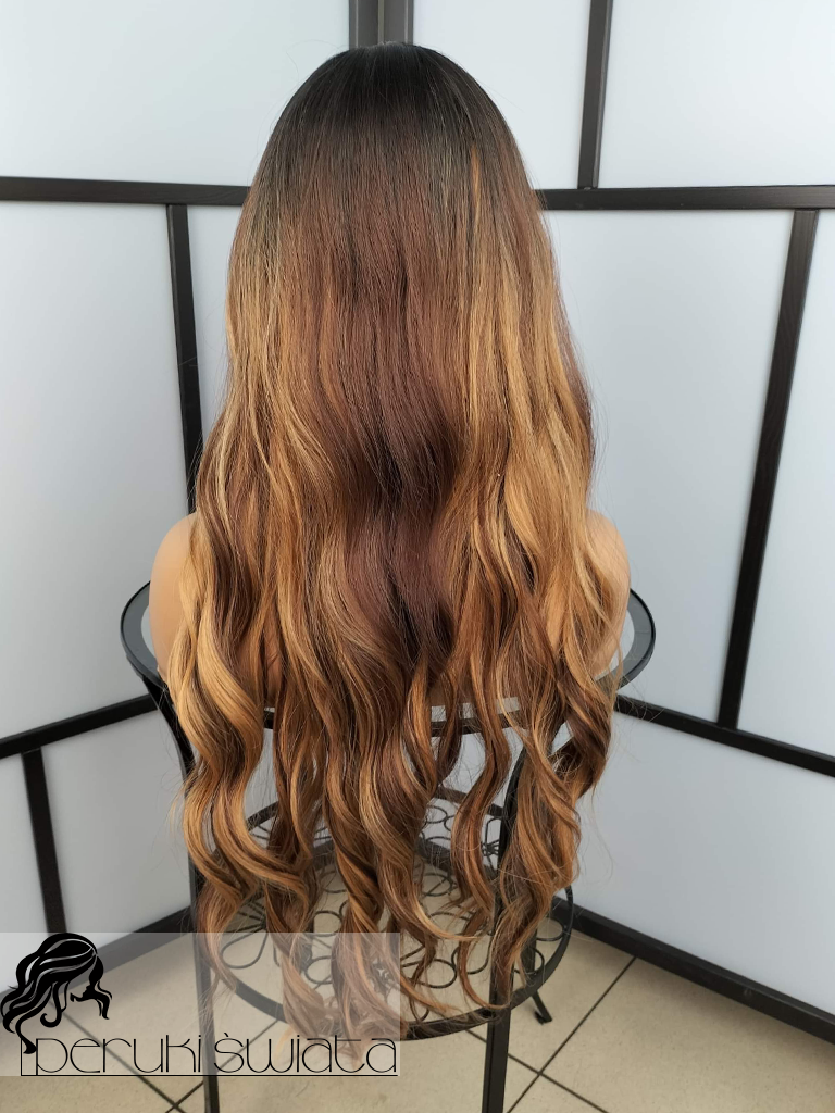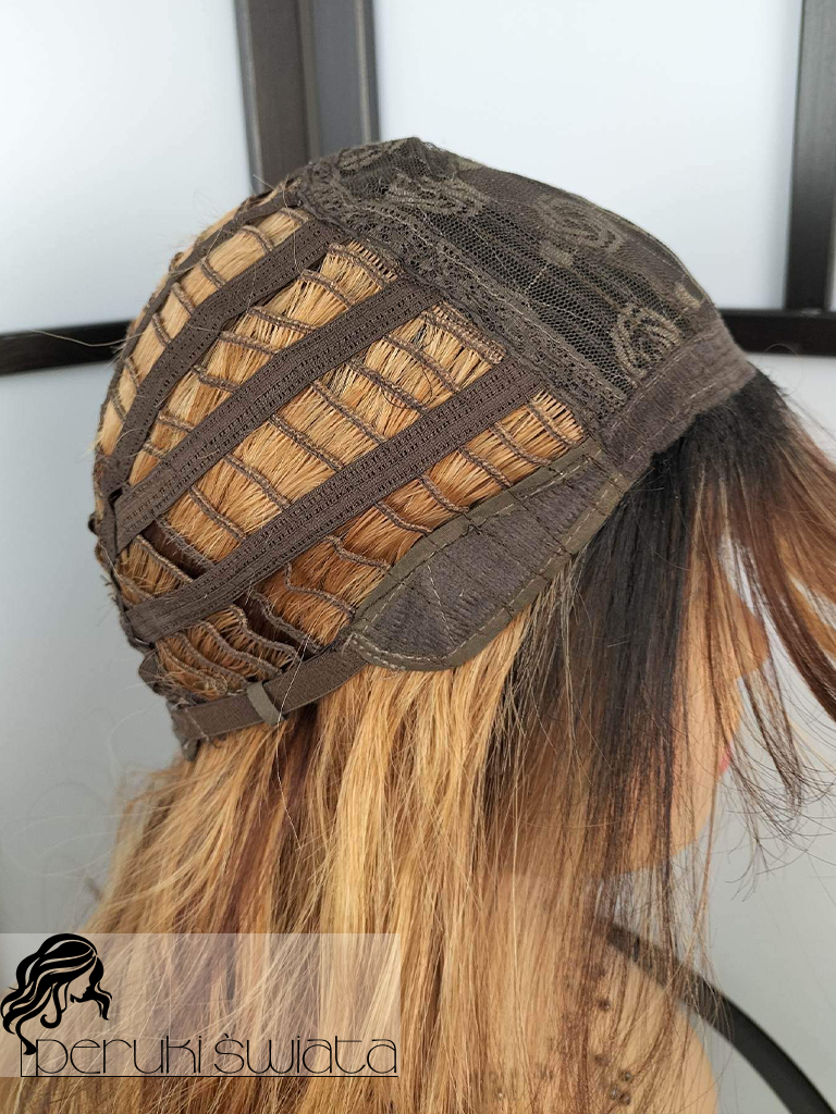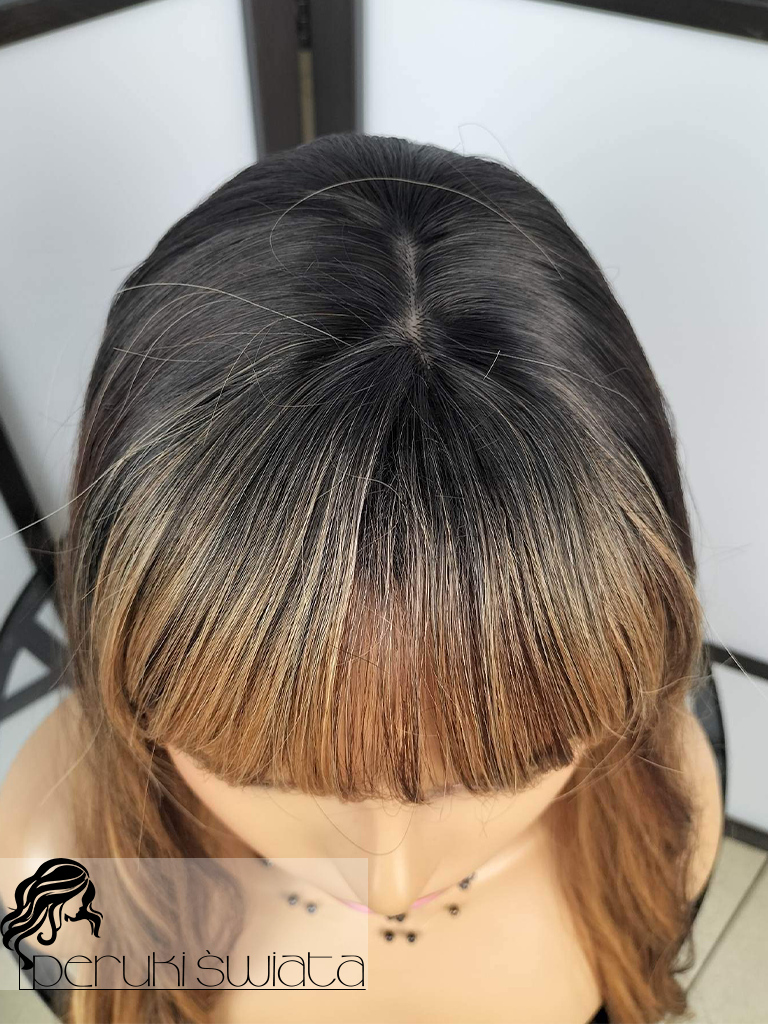 Peruka syntetyczna Sandra, kanekalon typu true hair, fale, grzywka, kolor: mix brązów i blondu na odroście