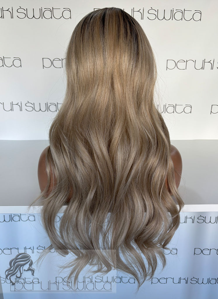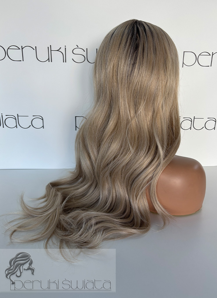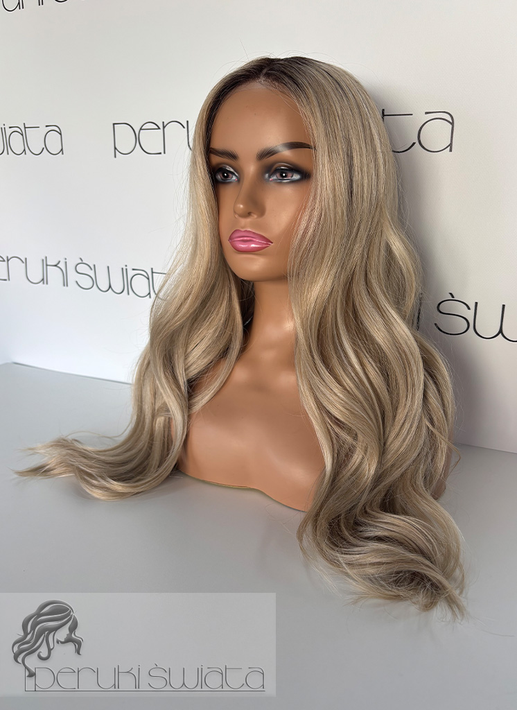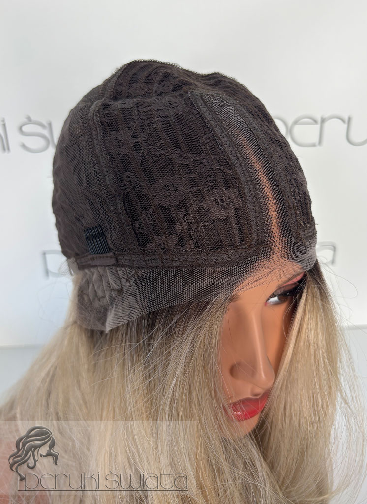 Peruka syntetyczna Valla, czepek typu: lace front, jasny blond z delikatnymi refleksami na odroście