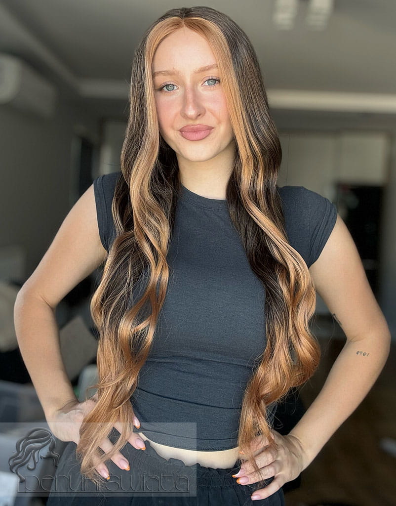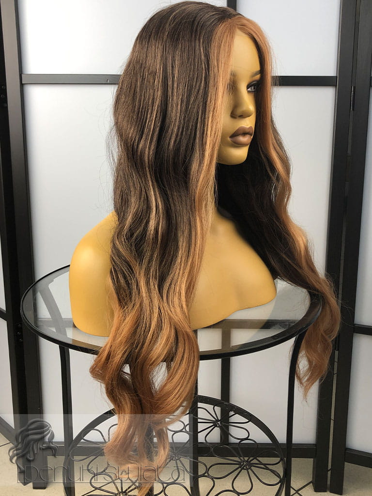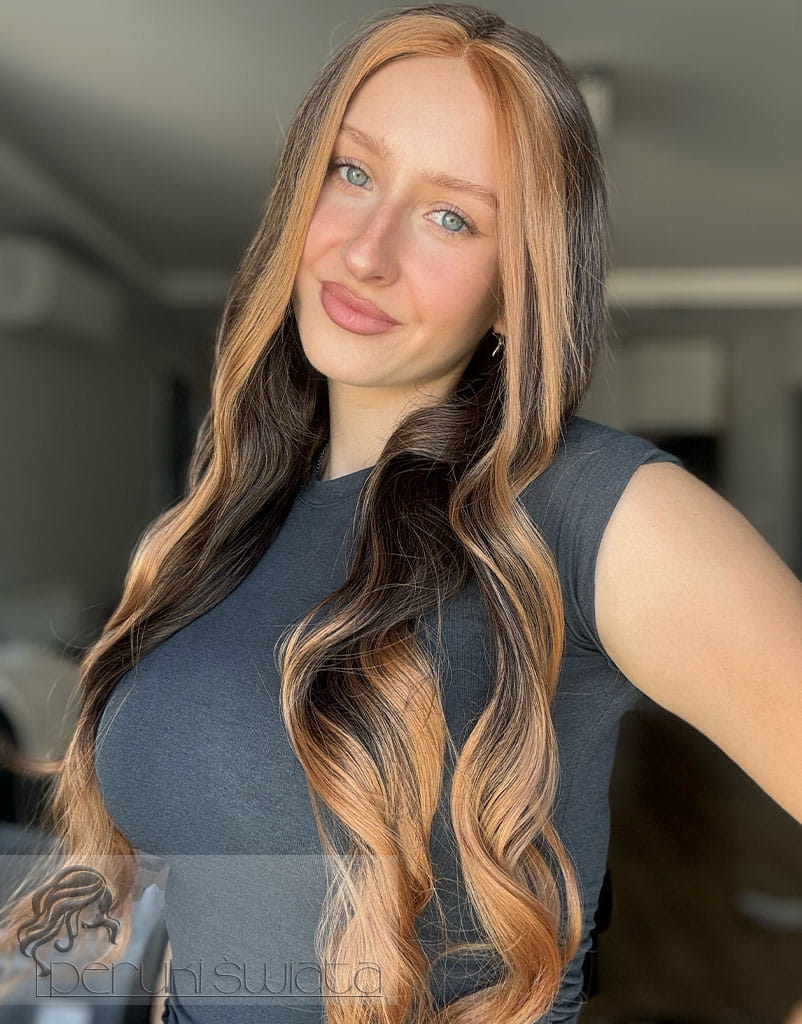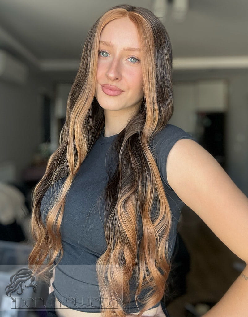 Peruka syntetyczna Zoia, kanekalon premium , fale, kolor: miodowy blond z brązem