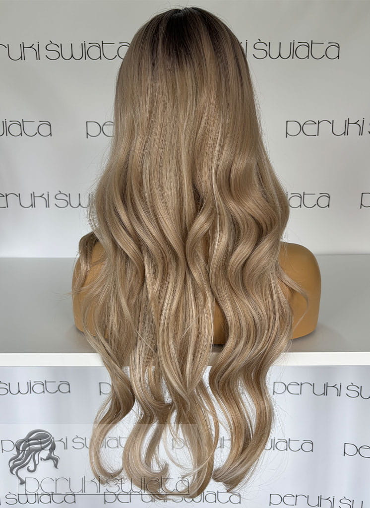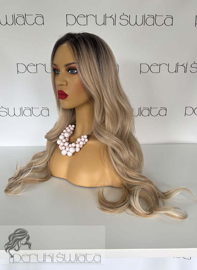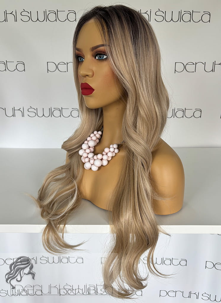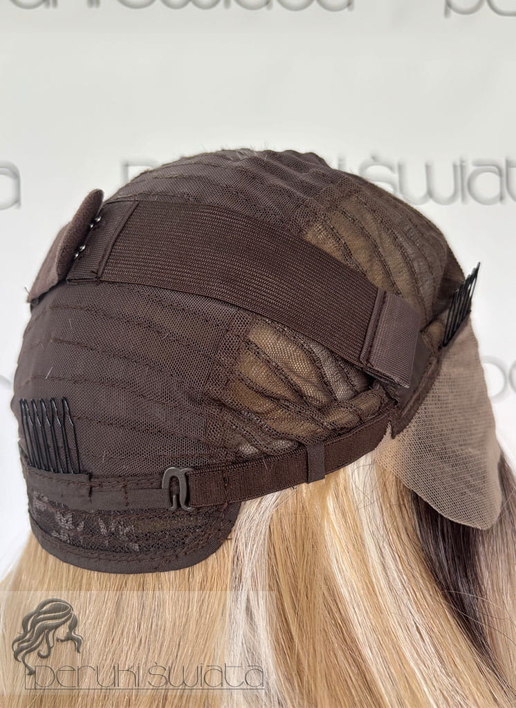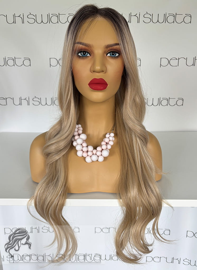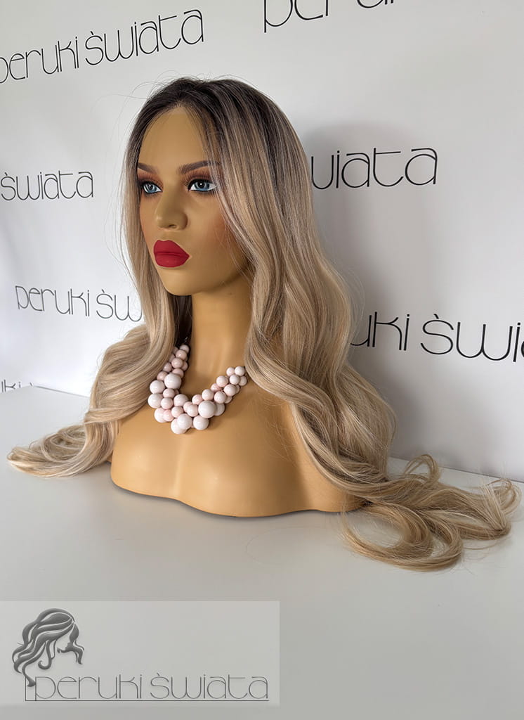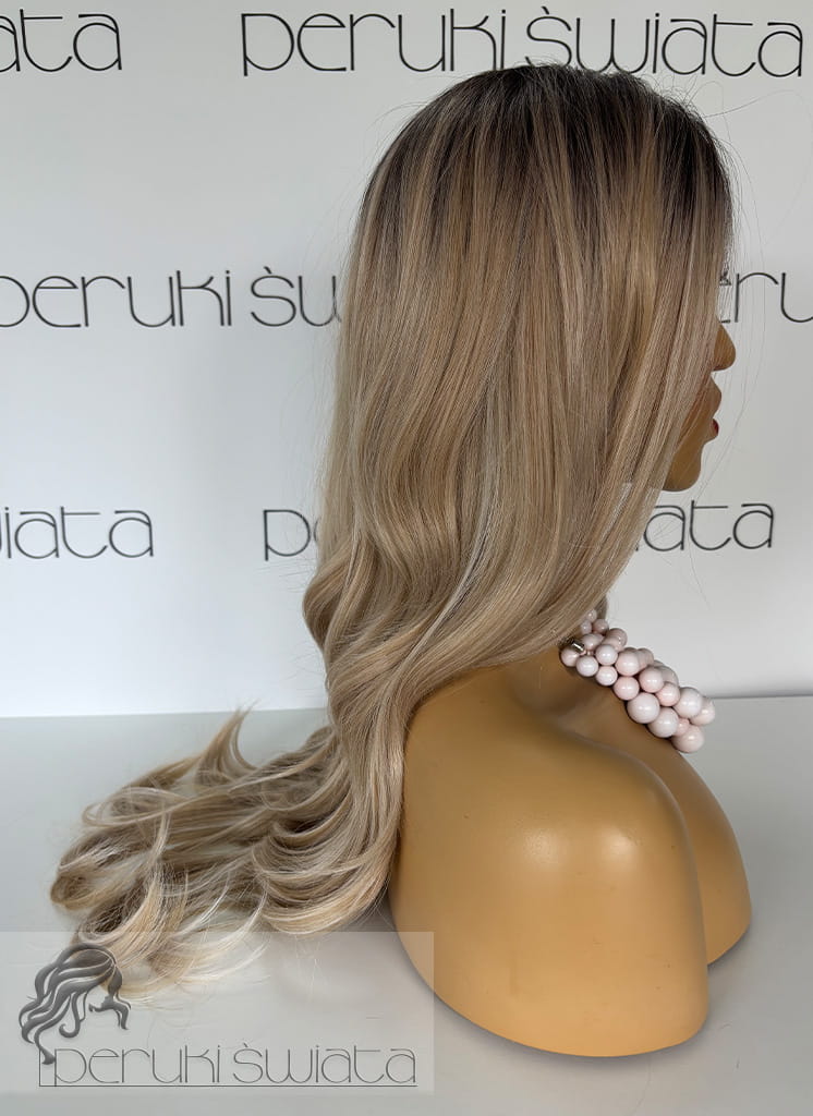 Peruka syntetyczna model Slown, czepek typu: full lace, kanekalon termoplastyczny, słoneczny blond z delikatnymi pasemkami białego blondu na odroście