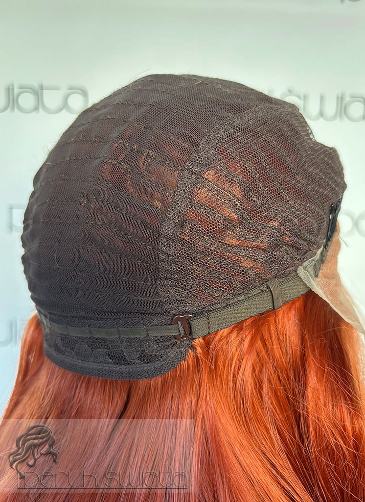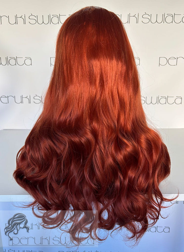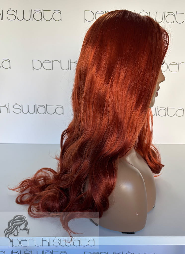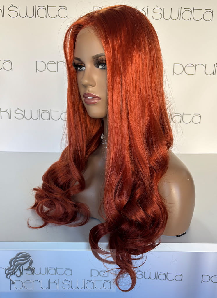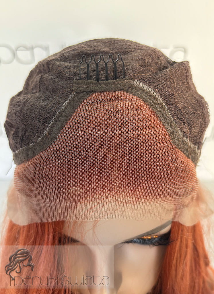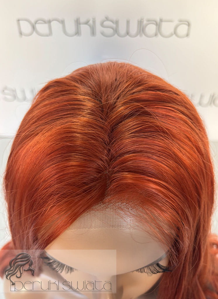 Peruka z termoplastycznego kanekalonu japońskiego, model nr AT87, kolor: rudy pomarańcz, czepek typu: full lace front, fale/loki