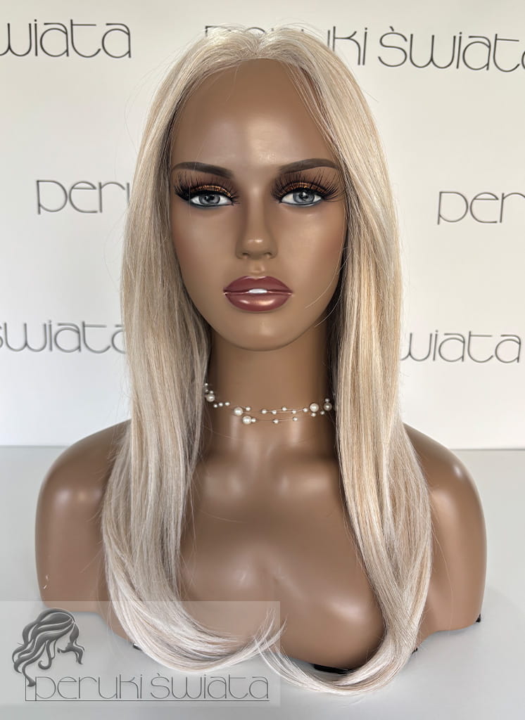 Peruka syntetyczna Anika, czepek typu: full lace, kanekalon termoplastyczny, jasny blond z poświatą białego blondu na subtelnym odroście