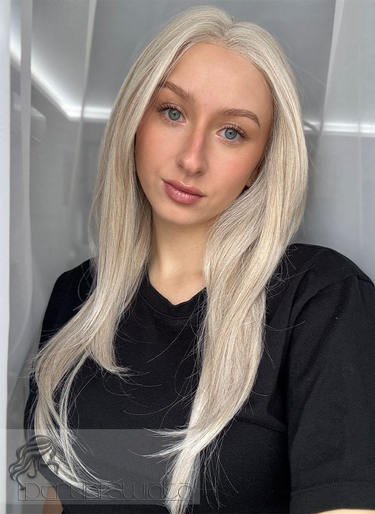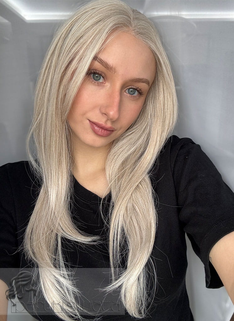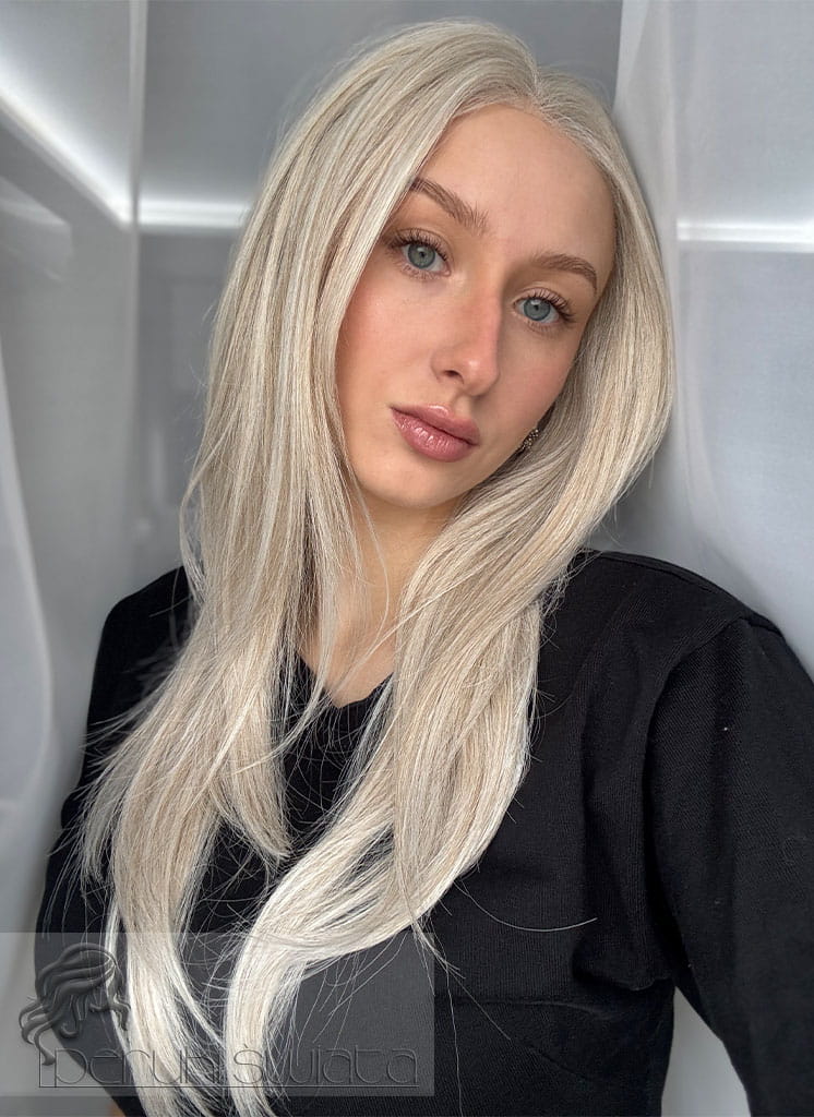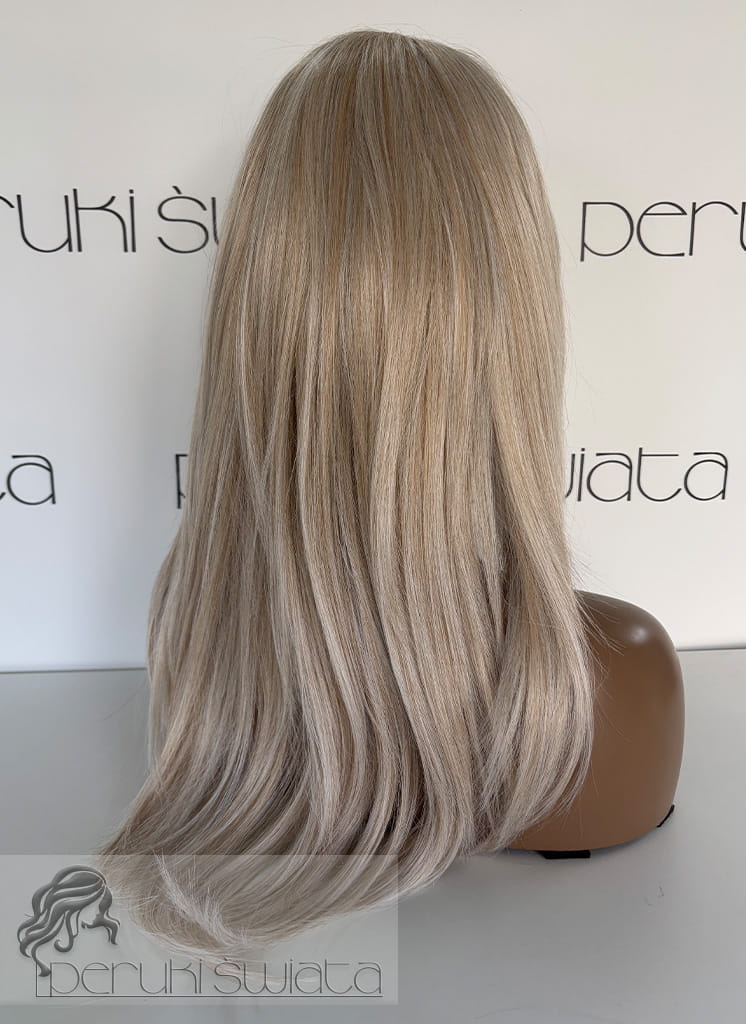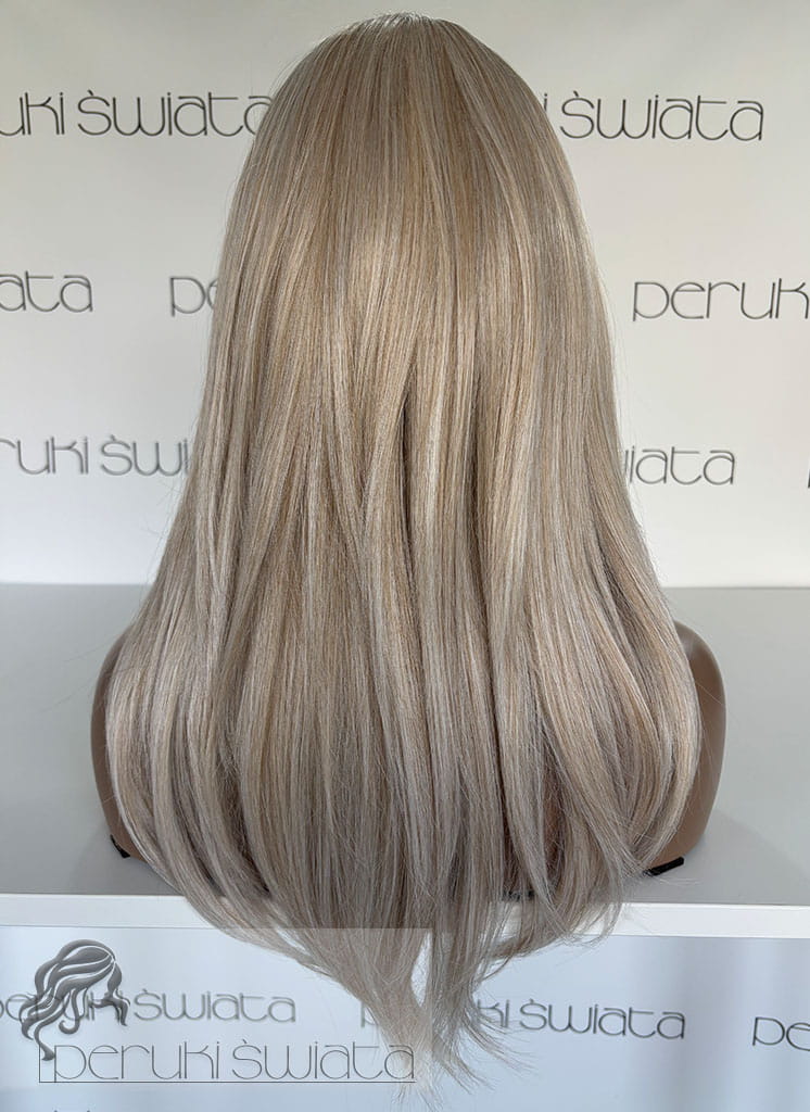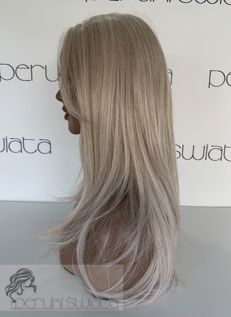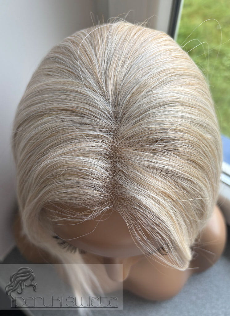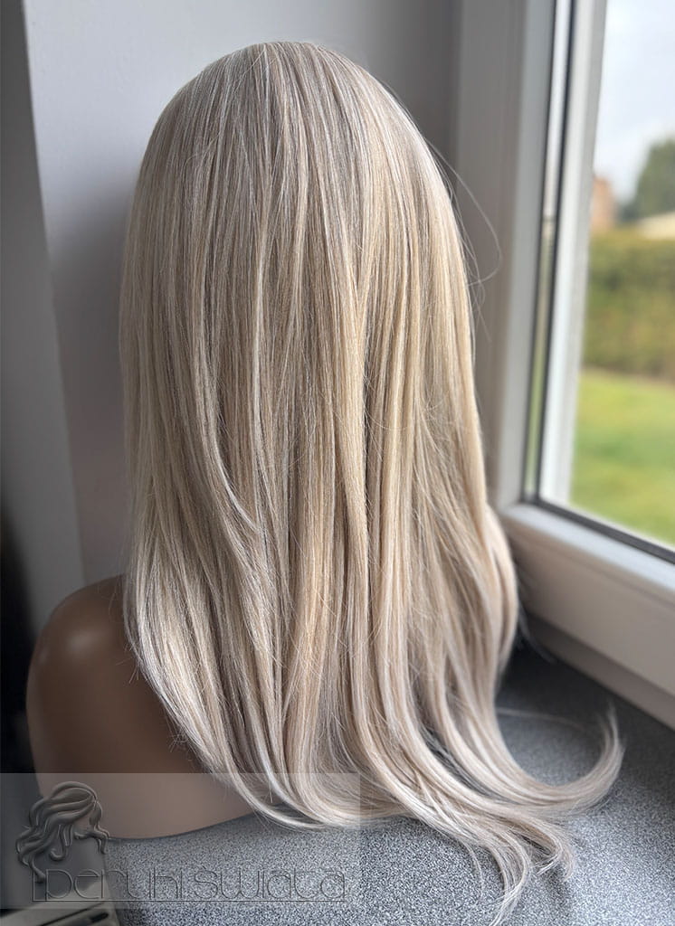 Lekka peruka syntetyczna Wiktoria, z kanekalonu termoplastycznego, mokra włoszka, chłodny perłowy blond, asymetryczny przedziałek