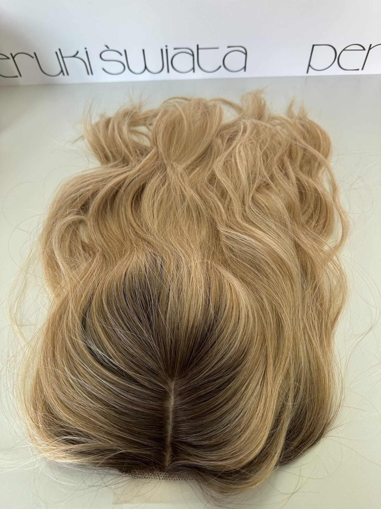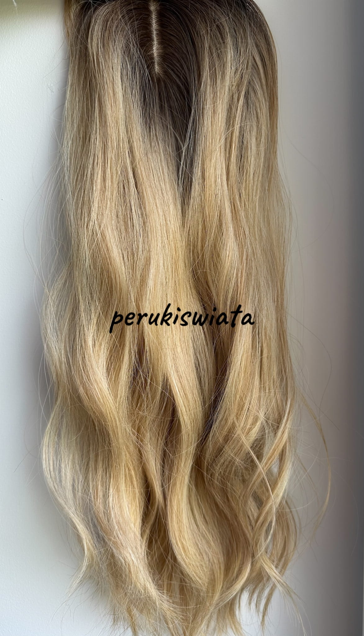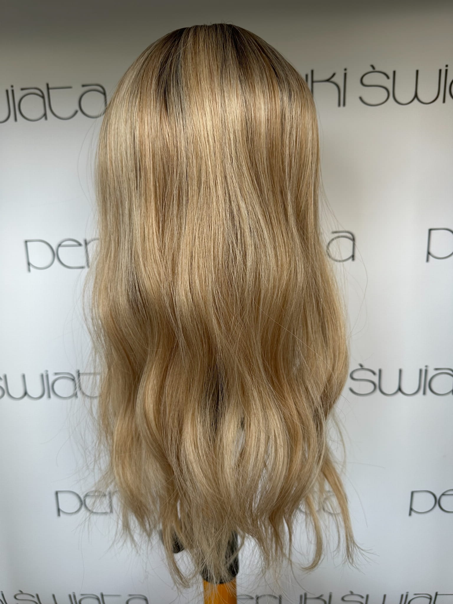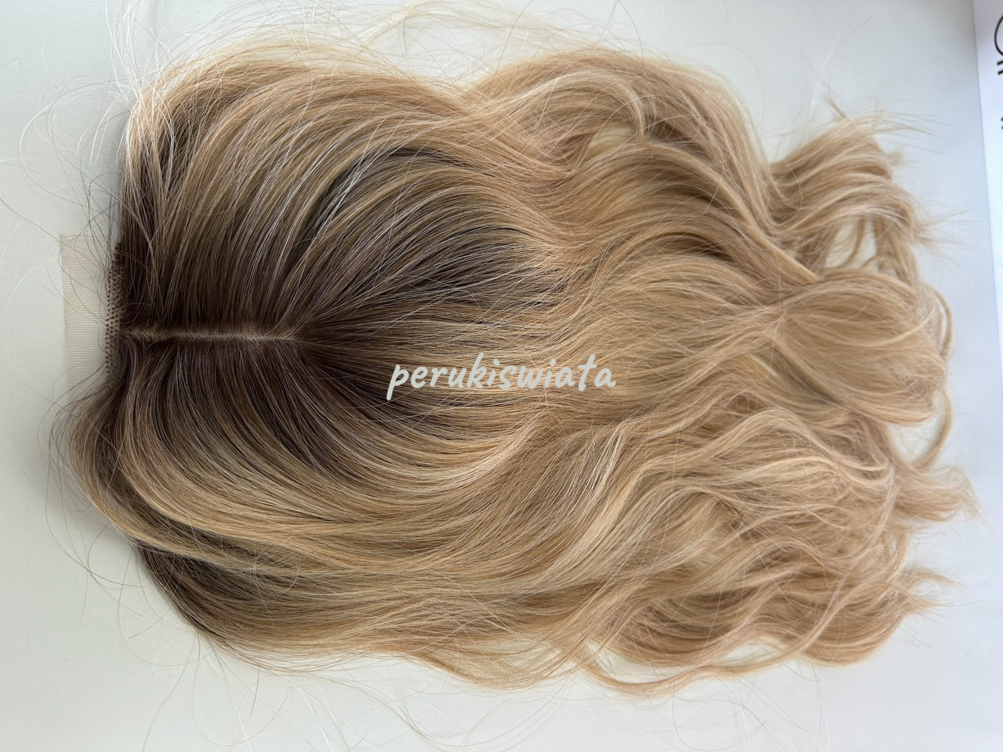 Model Lisa, peruka syntetyczna, monotop, kanekalon, fale, kolor: ciepły słowiański blond na odroście