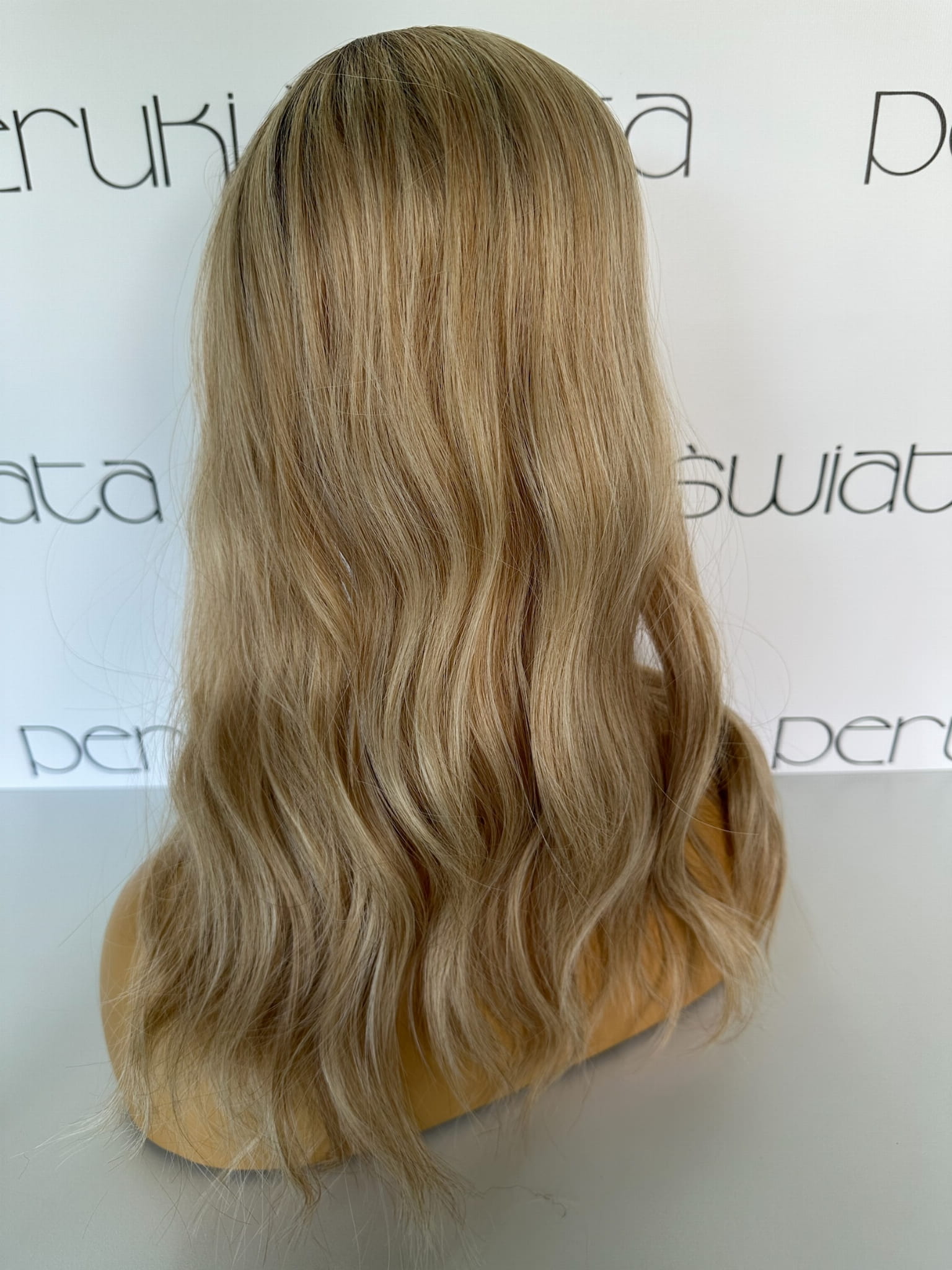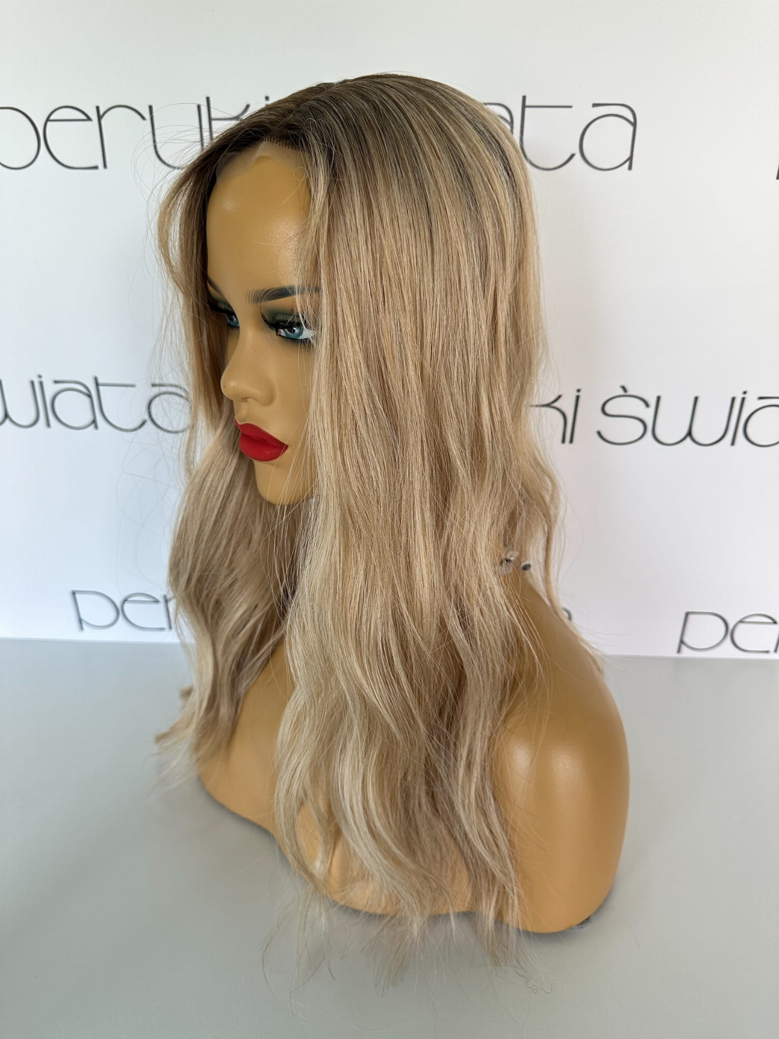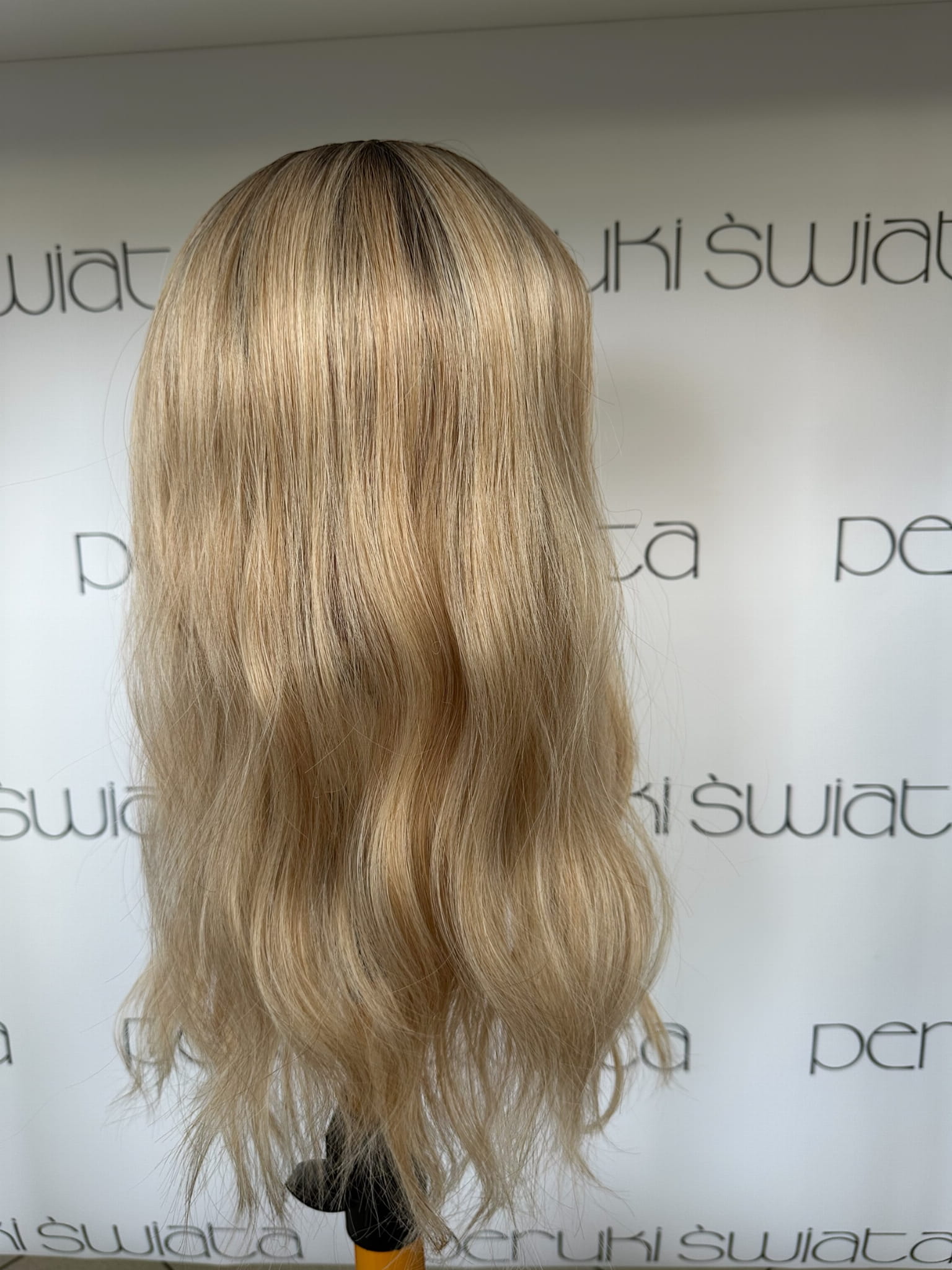 Model Lisa, peruka syntetyczna, monotop, kanekalon, fale, kolor: ciepły słowiański blond na odroście