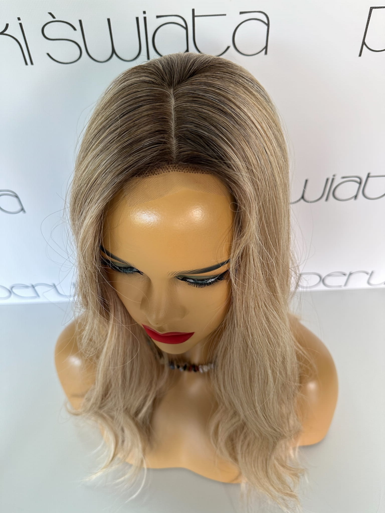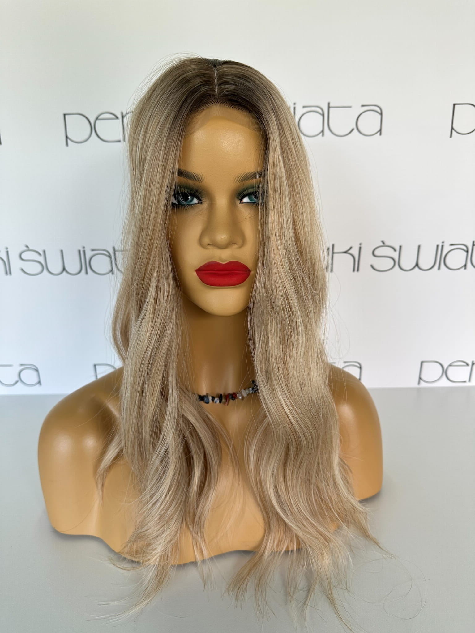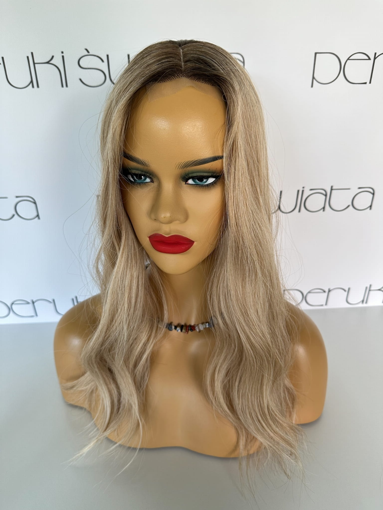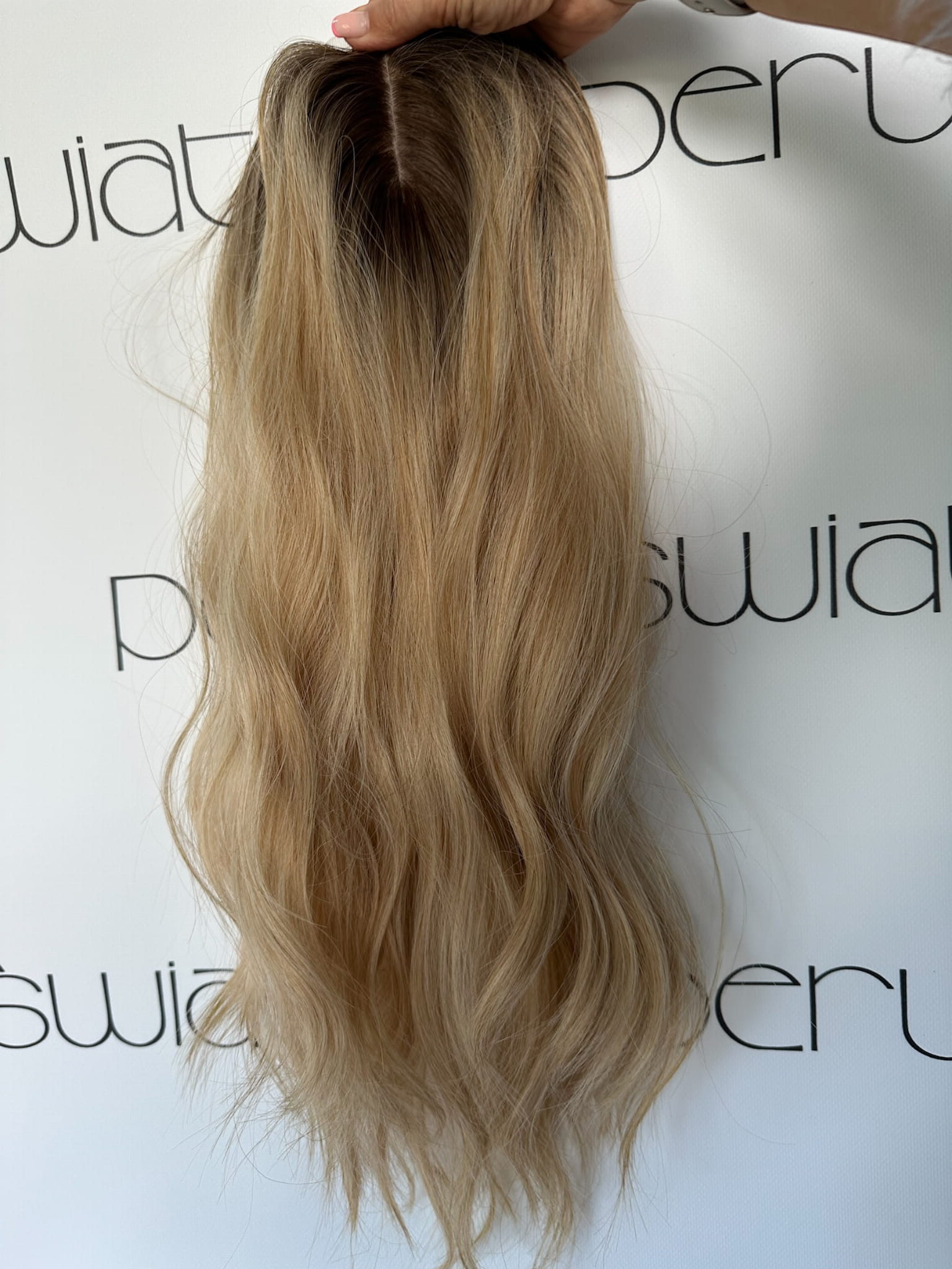 Model Lisa, peruka syntetyczna, monotop, kanekalon, fale, kolor: ciepły słowiański blond na odroście
